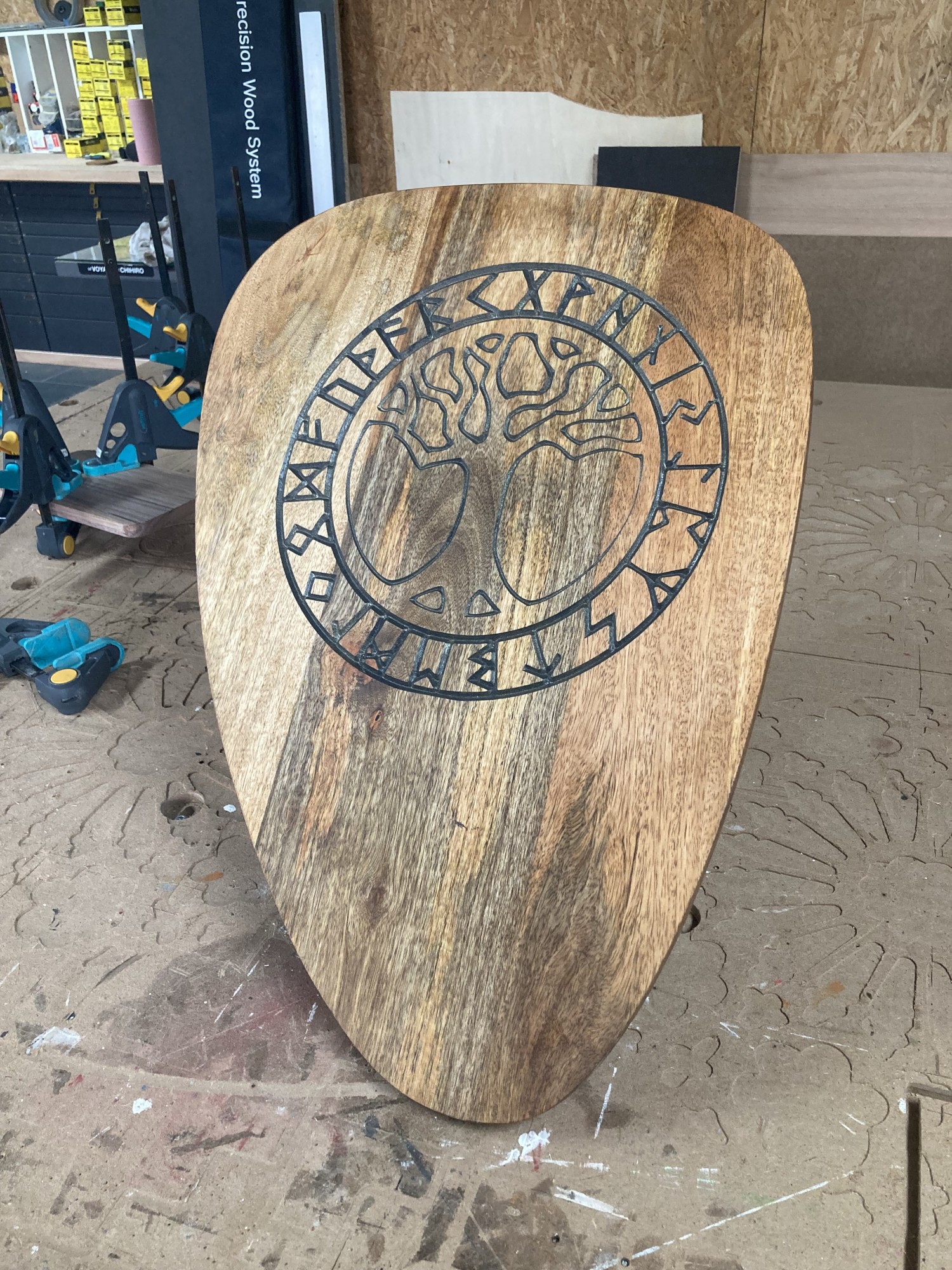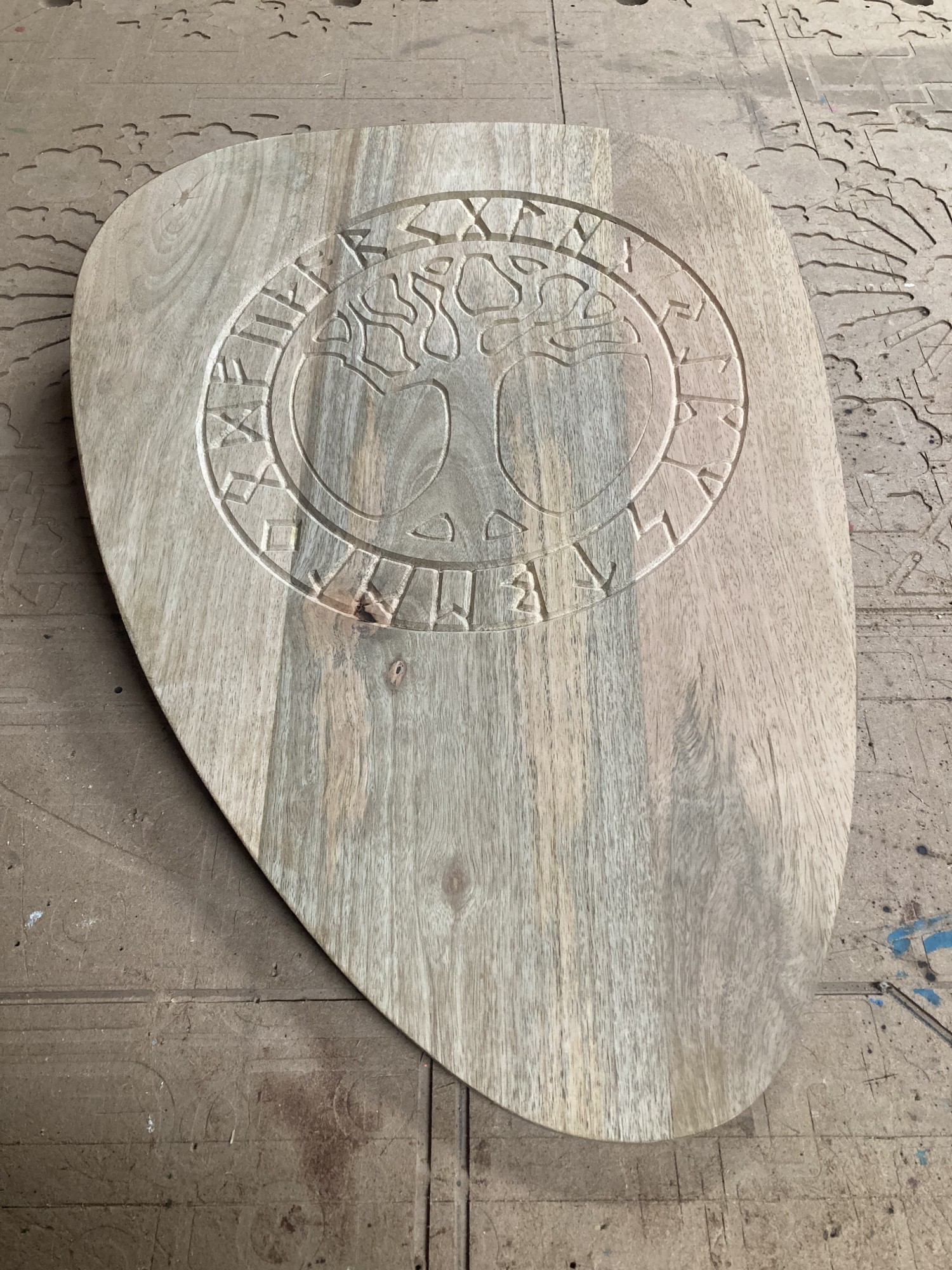 Ce bouclier est un exemple concret de gravure sur bois que nous sommes capables de faire avec notre défonceuse à commande numérique (CNC) dans notre atelier prés de Rouen !