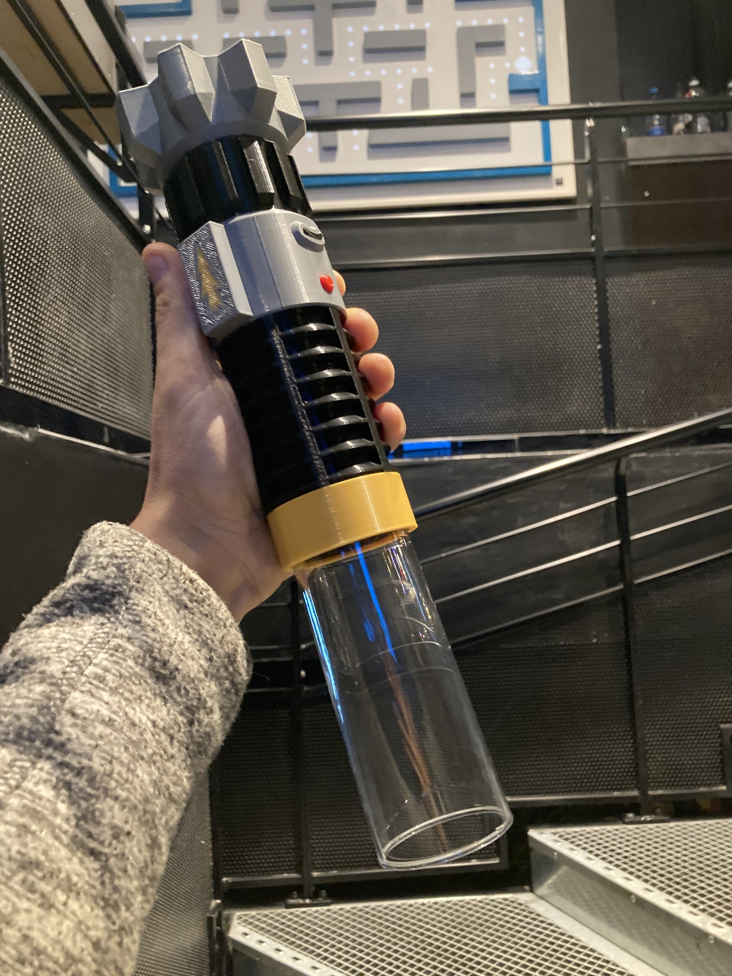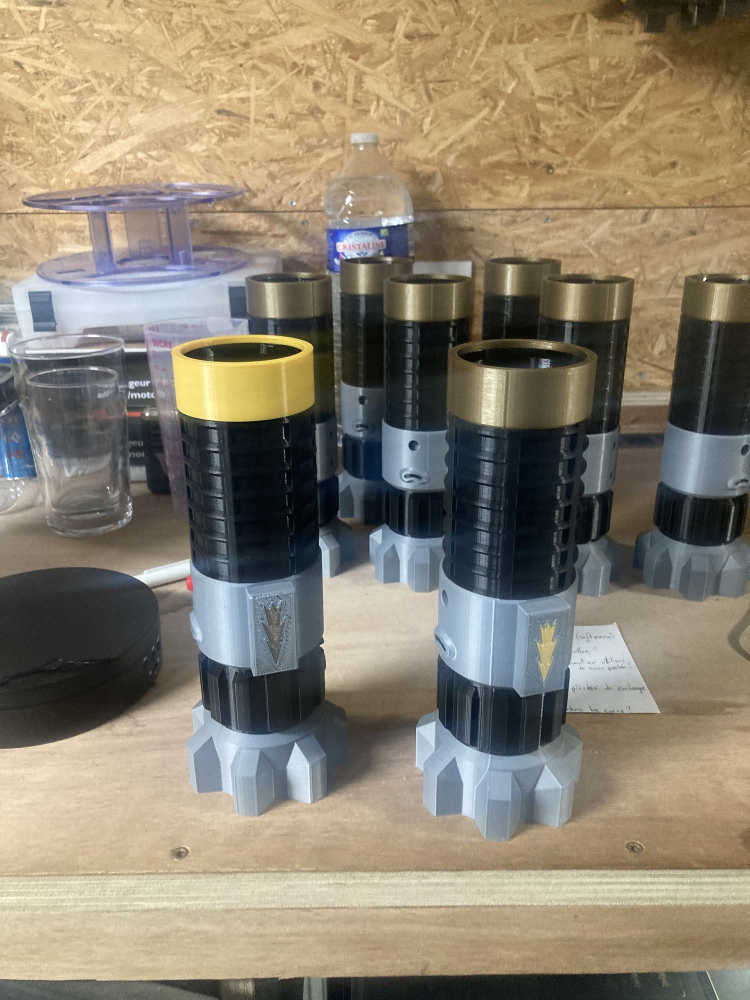 Nous avons choisi, plutot que de le fabriquer en bois et de le peindre, de le fabriquer en plastique recyclable (PLA). Cela nous permet de pouvoir produire des sabres en petite serie pour notre client, et aussi de faire attention à la planette.