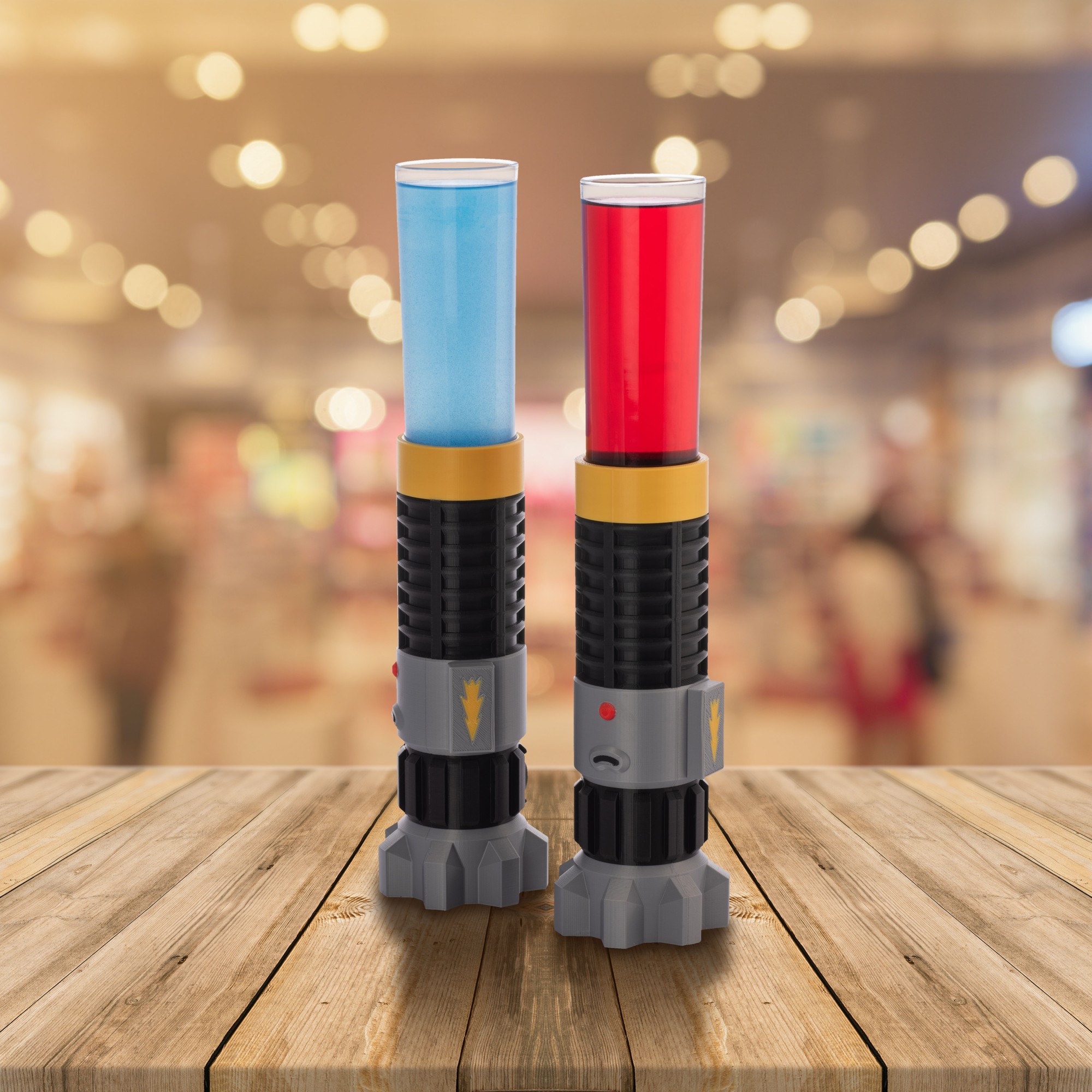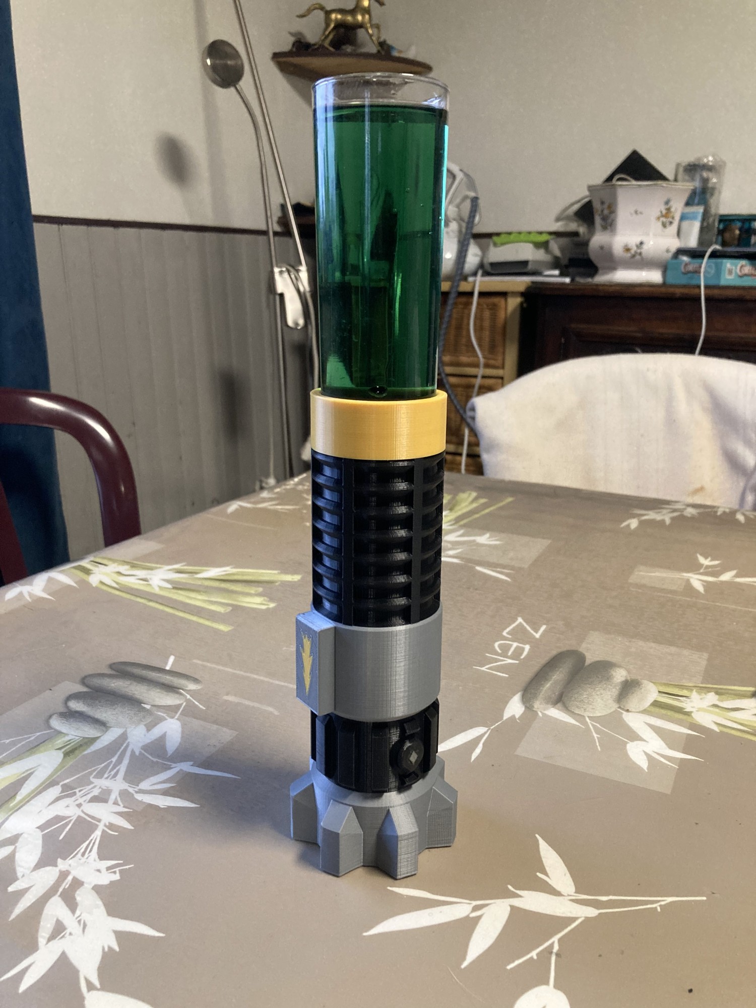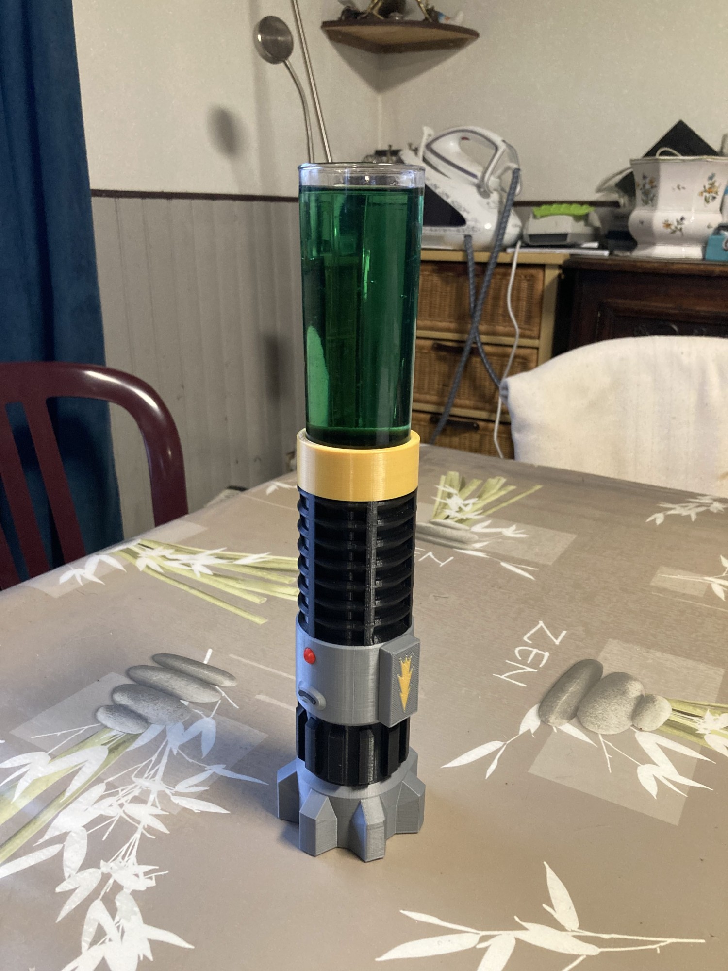 Visuellement basé sur le modèle de sabre du personnage Obi Wan Kenobi, nous avons tout de même dû le modifier pour correspondre à son utilisation. En effet, il s'agit là d'un cocktail, après tout. Le sabre doit pouvoir accueillir un verre, mais aussi, et surtout, tenir debout sans tomber !
