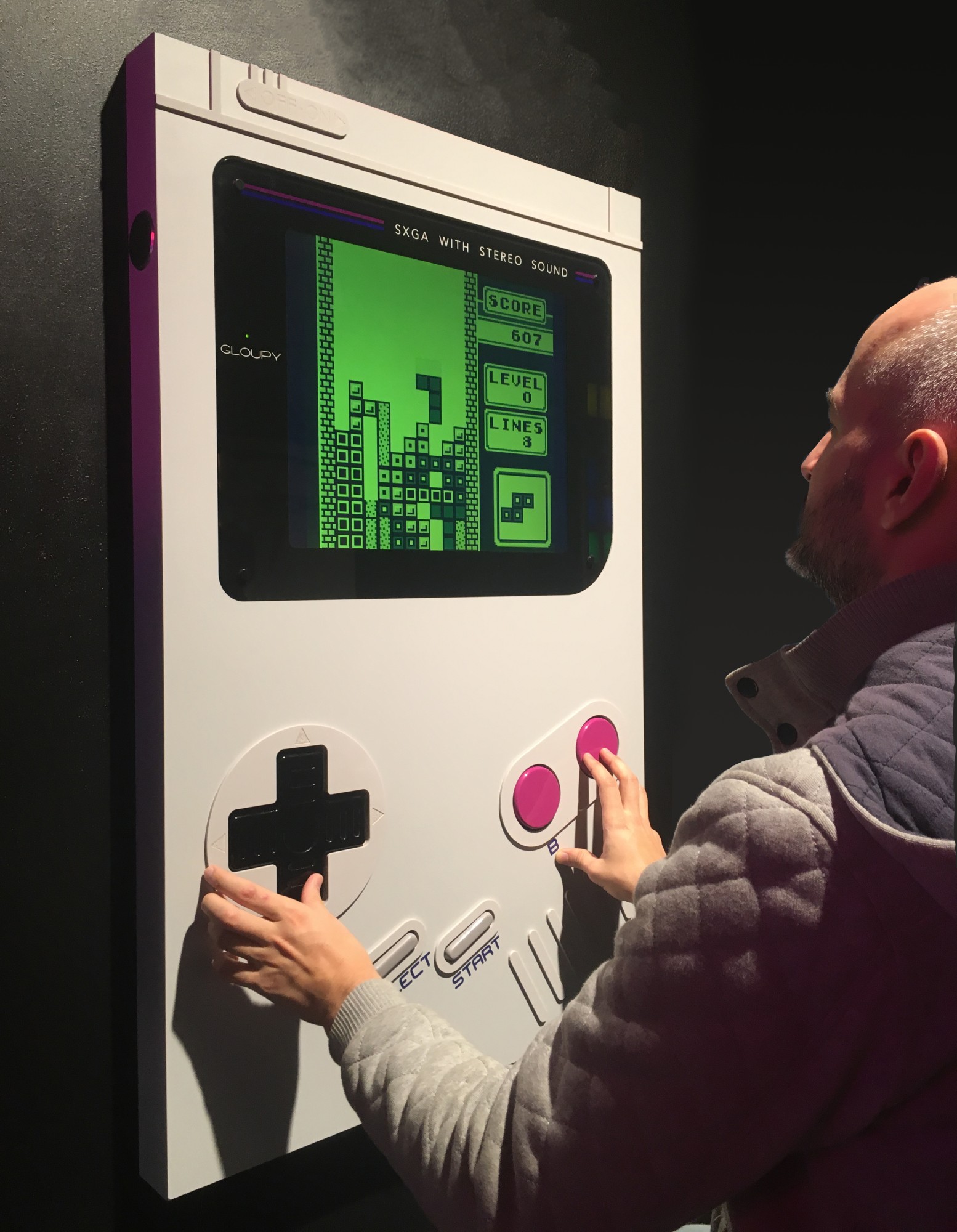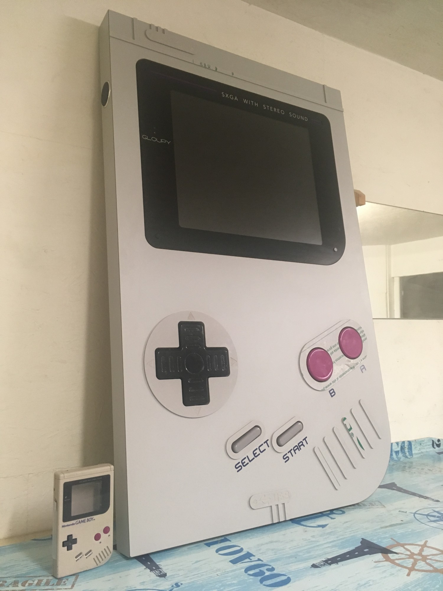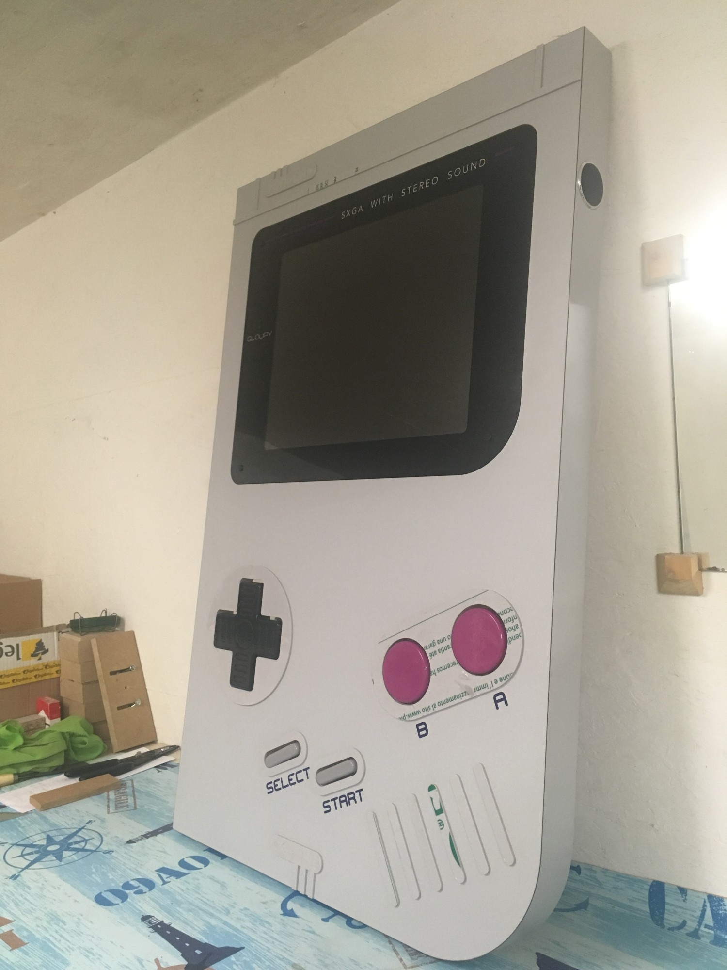 Même si le design est très proche de la console de Nintendo, la Gloupy Boy n'a pas les mêmes proportions. Nous avons dû ajuster le design en fonction des contraintes techniques que cela représentait de l'agrandir autant que cela. Cette console fait 1m x 0.63m après tout !
