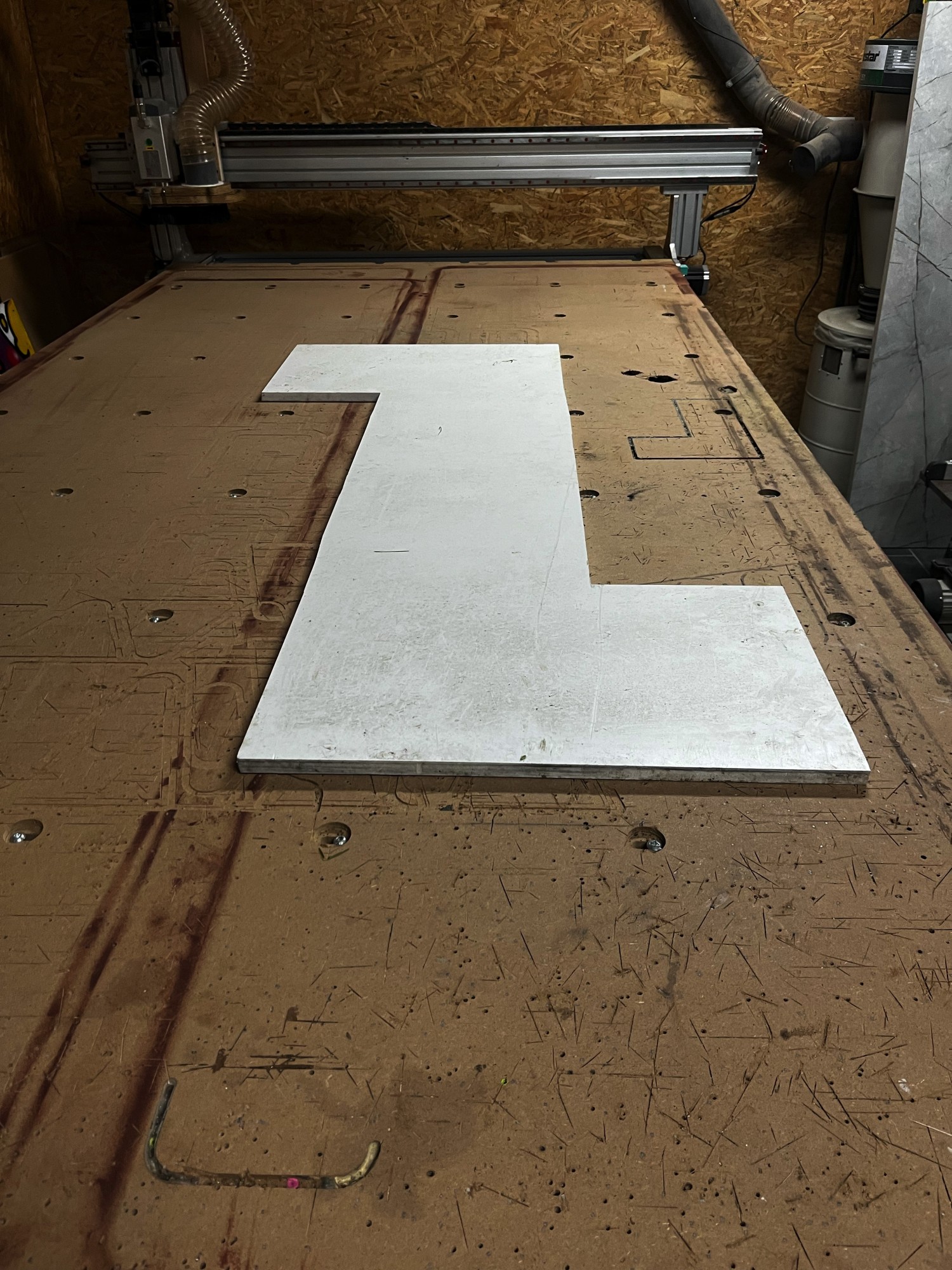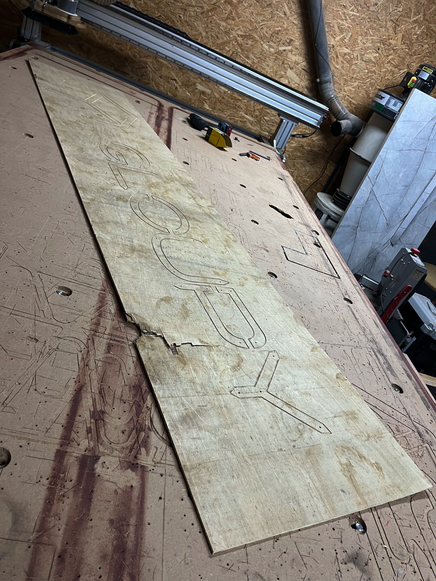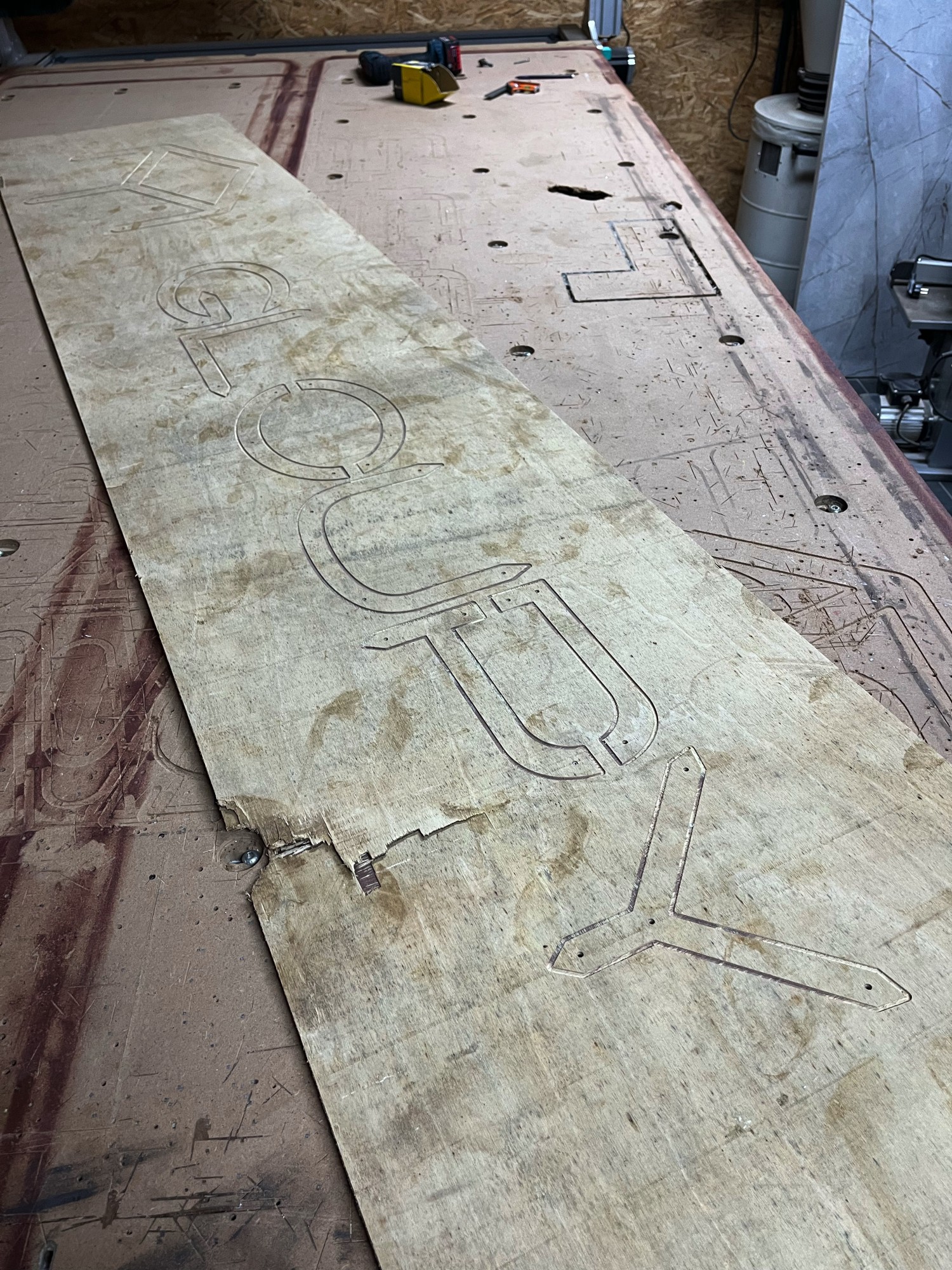 C'est une évidence. Nous avons mis à contribution notre très cher Défonceuse à commande numérique pour usiner no lettrage, mais pas que. Comme vous pouvez le voir, nous avons aussi usiné un morceau de contreplaqué. Mais pour quoi faire, me direz-vous ? Pour savoir où percer nos trous pour les vis dans le Dibond et dans le lettrage, nous avons utilisé un morceau de contreplaqué comme gabarit.