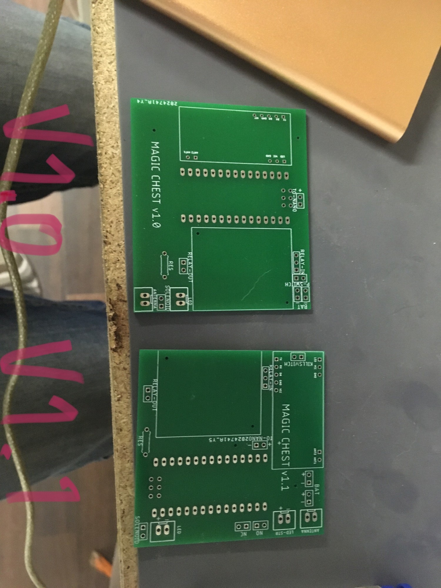 Ce n'est pas par ce que nous sommes menuisiers que nous n'y connaissons rien en informatique. Bien au contraire ! Nous avons programmé un arduino et fabriqué une carte électronique spécialement pour ces coffres. Des capteurs ont été installés à certains endroits du coffre et dans les baguettes. Des LED UV s'illuminent avec la bonne incantation !