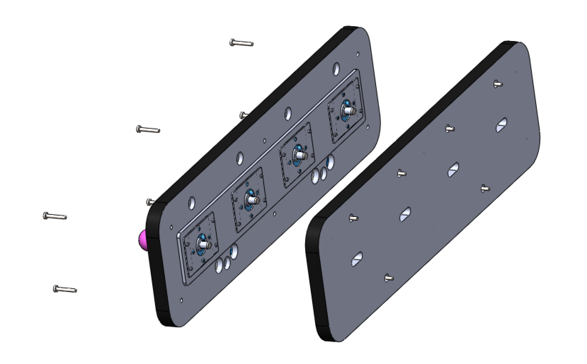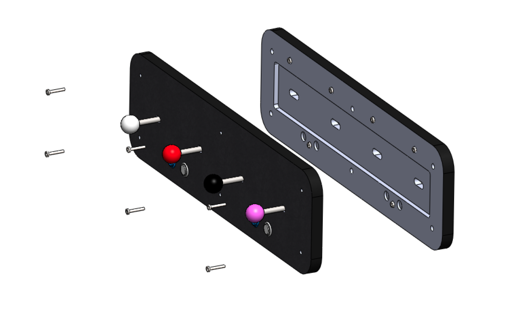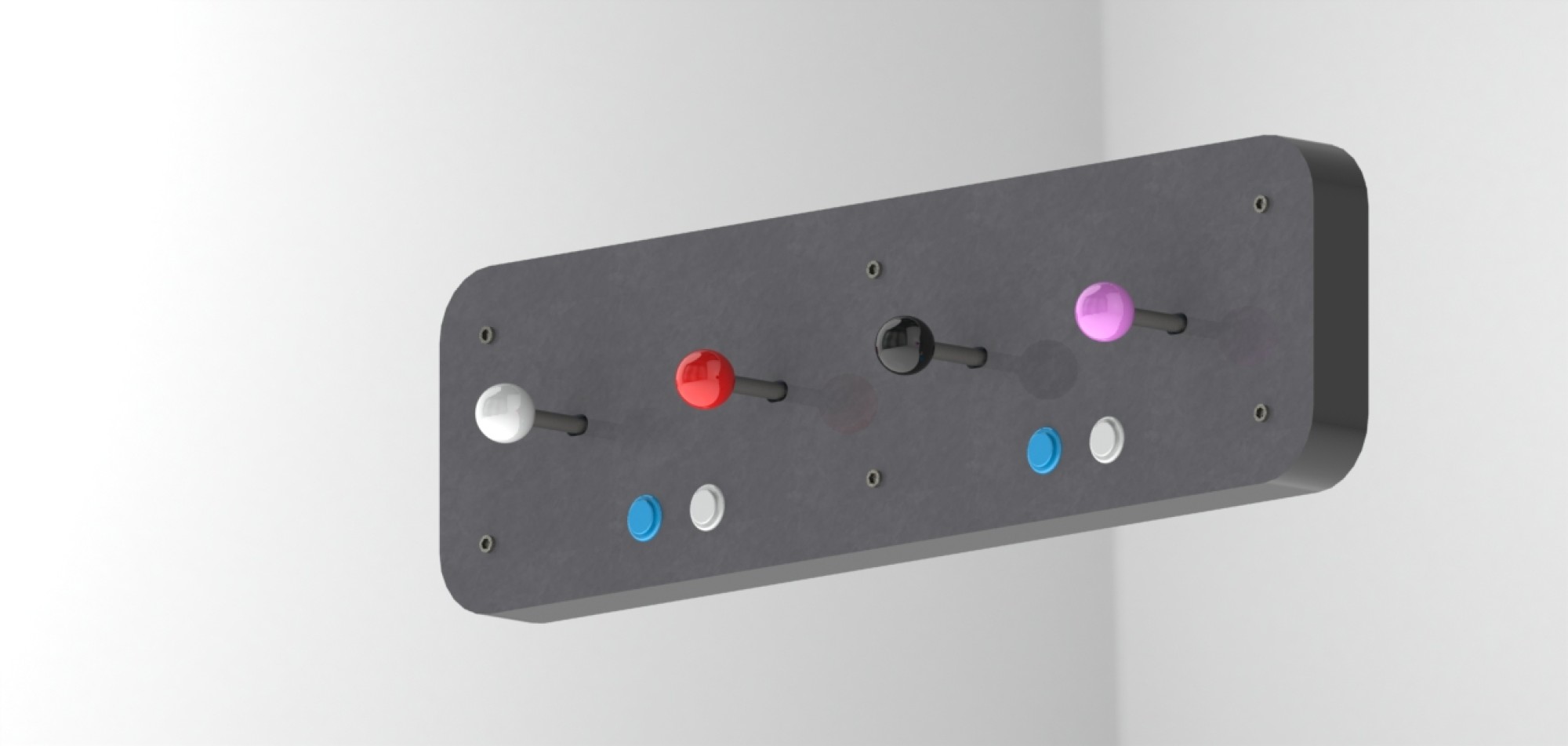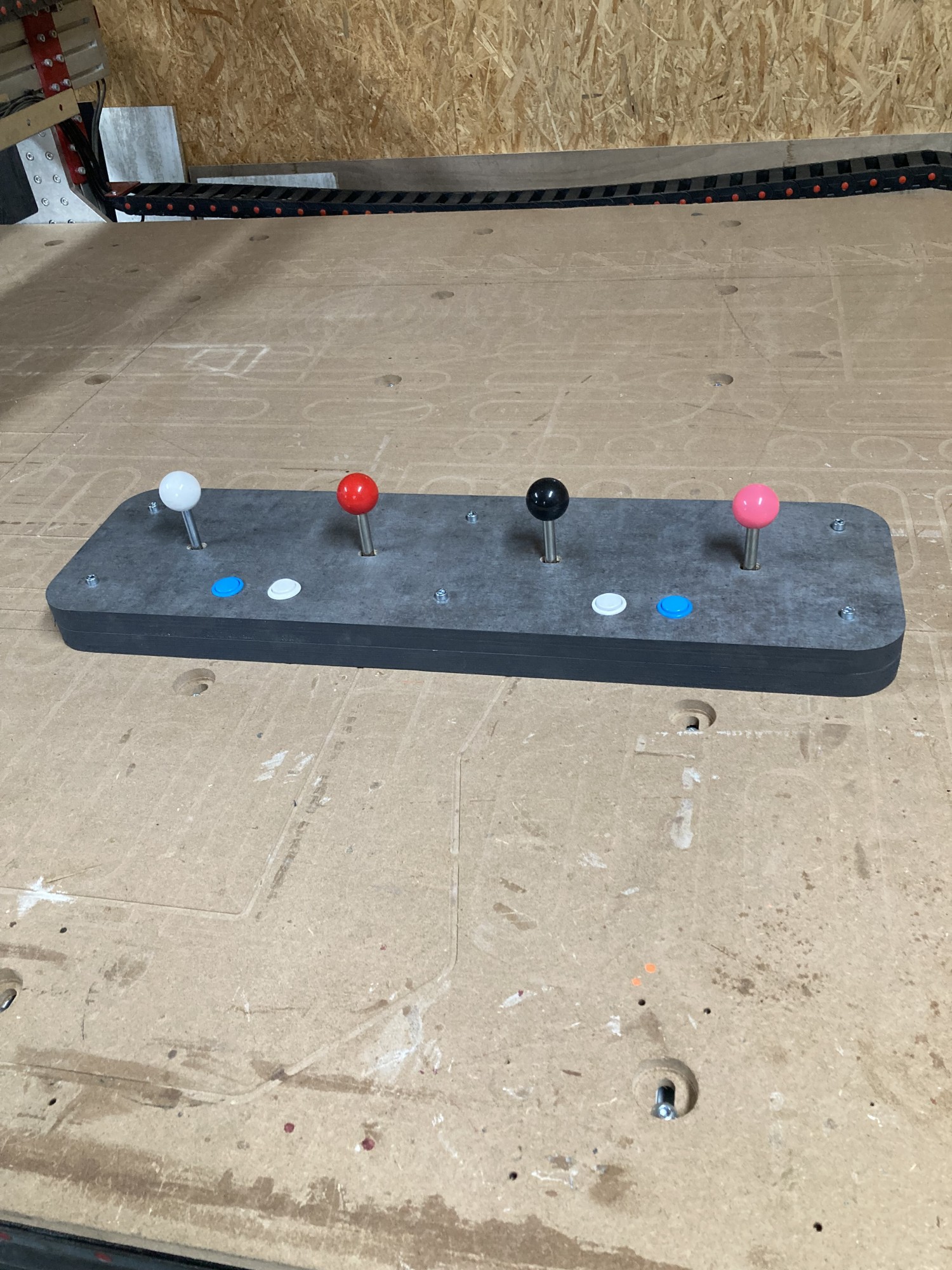 Les joysticks d'arcades sont bien conçus de base. Solide avec leurs tiges et supports en acier, des interrupteurs prévu pour des milliers de cliques et personnalisable à souhait avec ses boules interchangeable multi-couleurs. Nous avons donc décidé d'en intégrer 4 à l'intérieur d'une boite qui elle sera fixée au mur.