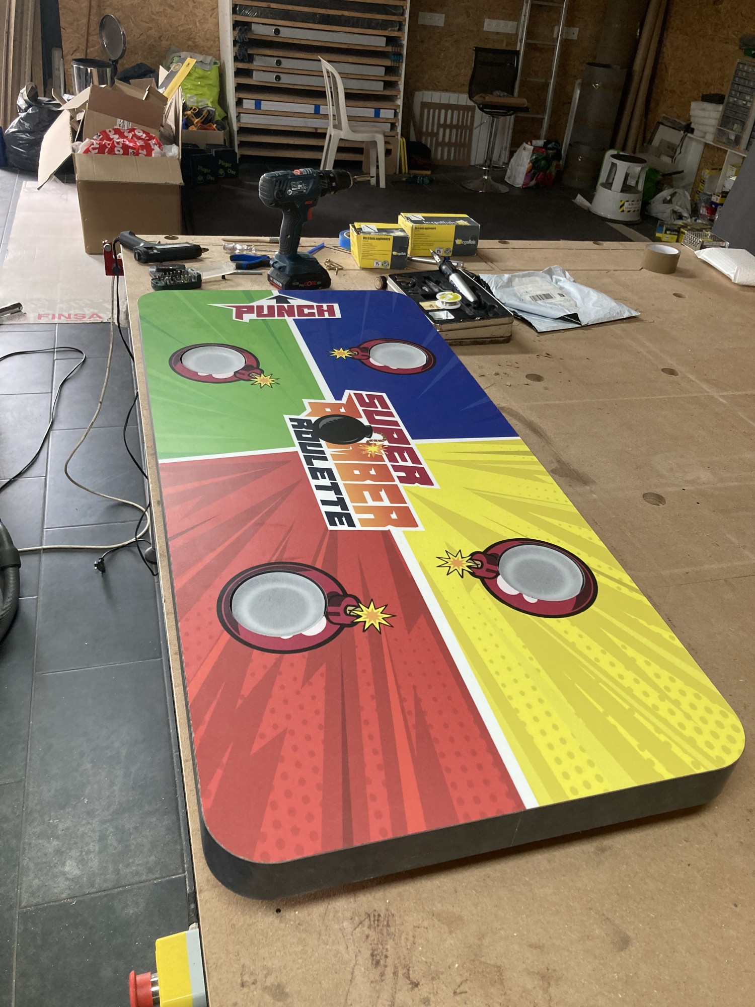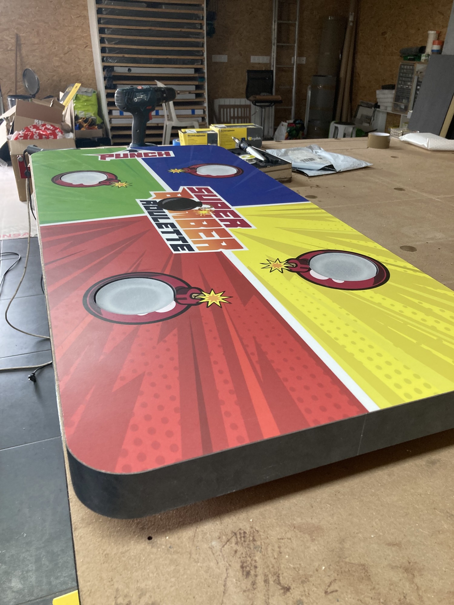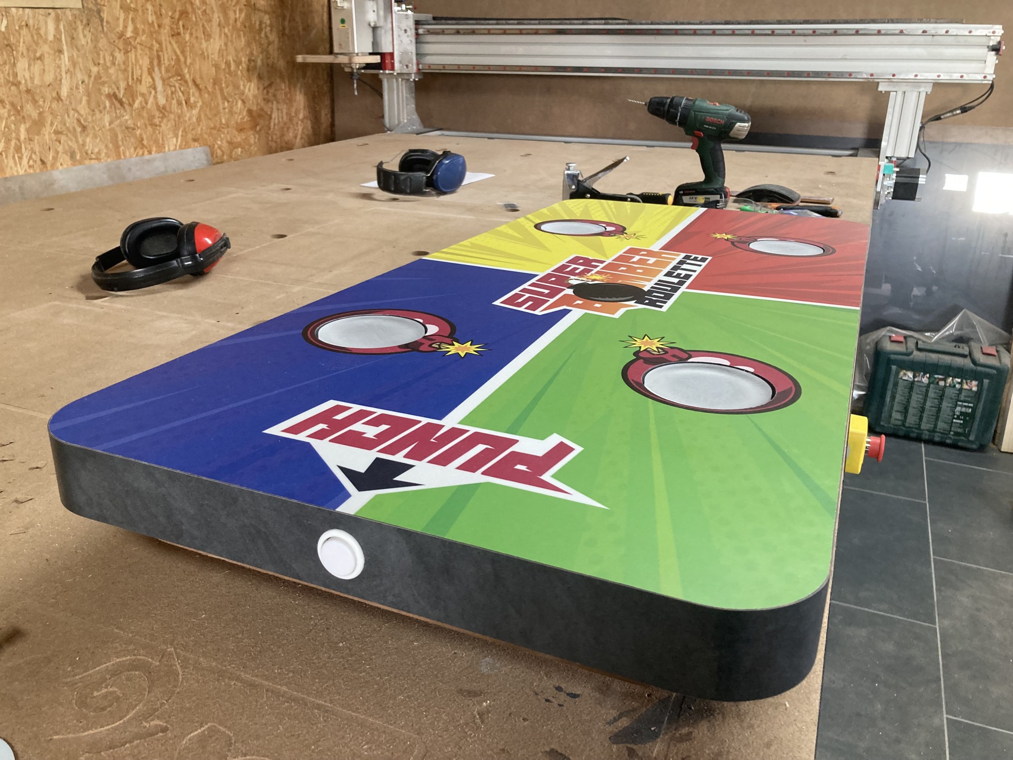 Le concept est simple : quatre joueurs posent chacun leur verre sur un rond lumineux et appuis sur le boutons de tire. La lumière va ainsi passer de joueurs en joueurs au son d'une roulette. Après plusieurs tours, la lumière ralentie. Lorsque le stresse des joueurs est pousse a son maximum, la lumière s'arrête enfin sur l'un des joueurs. BOUM ! A lui de boire son verre et de relancer une partie !