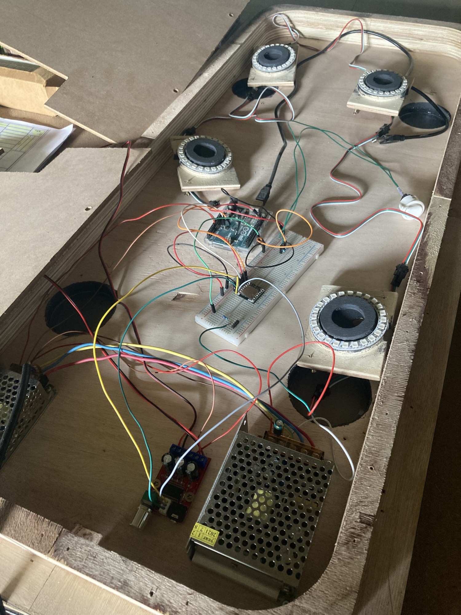 Oui ! L'électronique ne nous fait pas peur chez Gloupy ! Nous avons programmé un arduino et développé une carte électronique sur-mesure pour pouvoir gérer son et lumière. Car oui, en plus de milliers de couleurs et d'effets lumineux, du son est joué aléatoirement à lui aussi. Les sons sont facilement gérables par le client grâce a une simple carte SD.