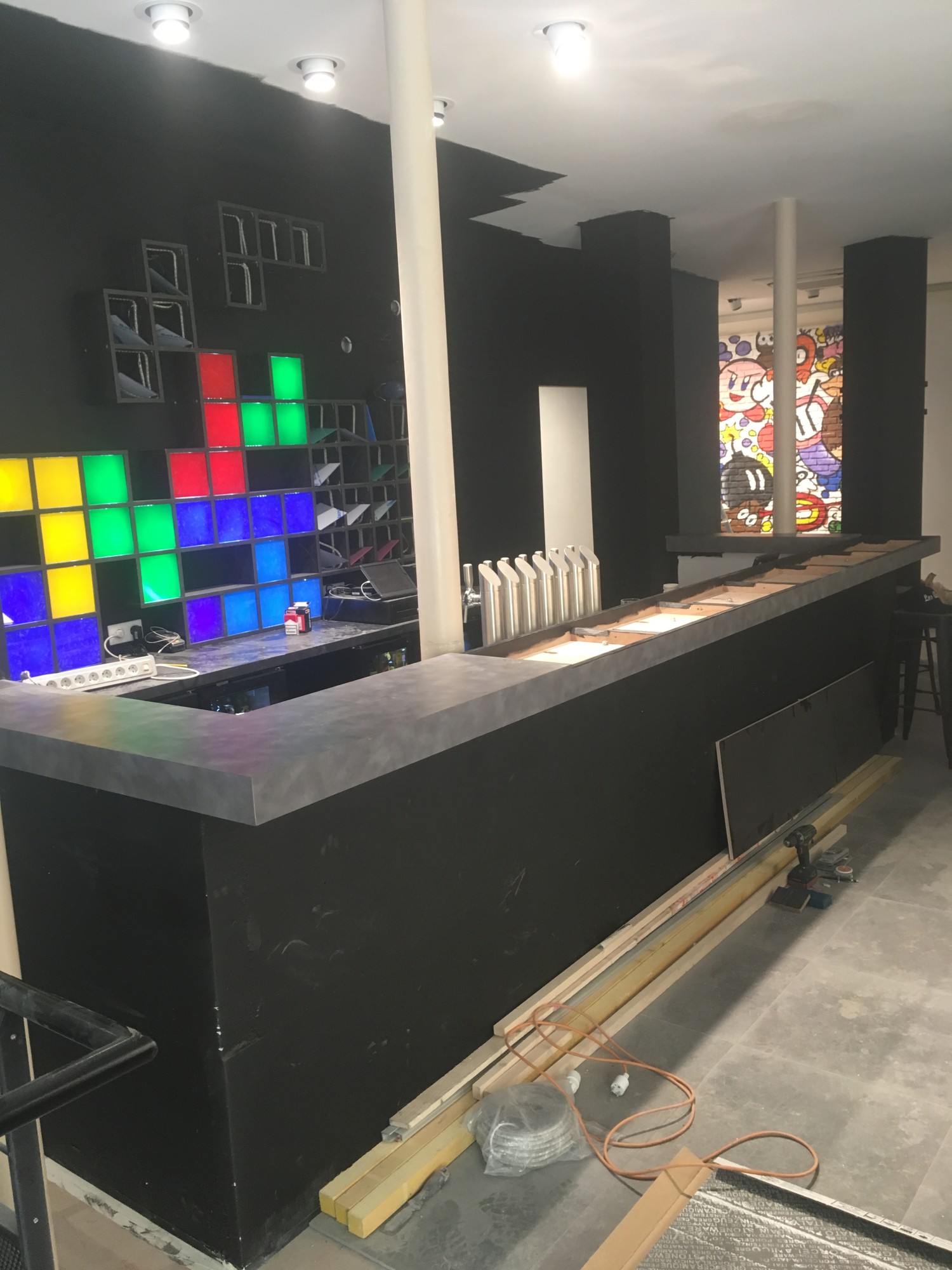Il y a quelques années, la plupart des bars étaient simplement des meubles en bois massif avec un comptoir en zinc ou en cuivre. Mais pour le bar Player One Paris il n'en était pas question ! Nous avons dès le départ intégré des écrans dans le comptoir protégé par une vitre en verre trempé. Ces écrans sont ensuite reliés à un ordinateur dans une salle informatique dédiée. Ces caractéristiques permettent aux clients de voir ce qui se passe derrière le bar (car il y a des choses à voir !) et rendent l'atmosphère plus festive. Les écrans intégrés permettent aux bartenders de mieux interagir avec les clients. Les écrans peuvent être utilisés pour afficher des informations sur les cocktails, les prix, les promotions, des animations, tout est personnalisable !