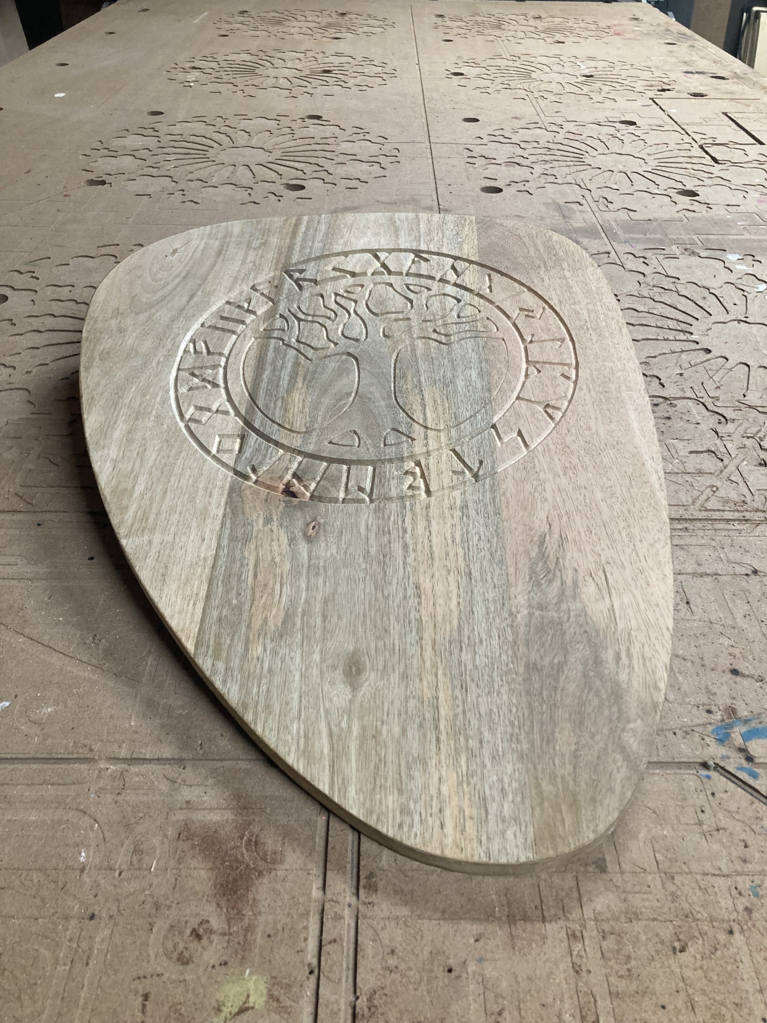 Ce bouclier est un exemple concret de gravure sur bois que nous sommes capables de faire avec notre défonceuse à commande numérique (CNC) dans notre atelier prés de Rouen !