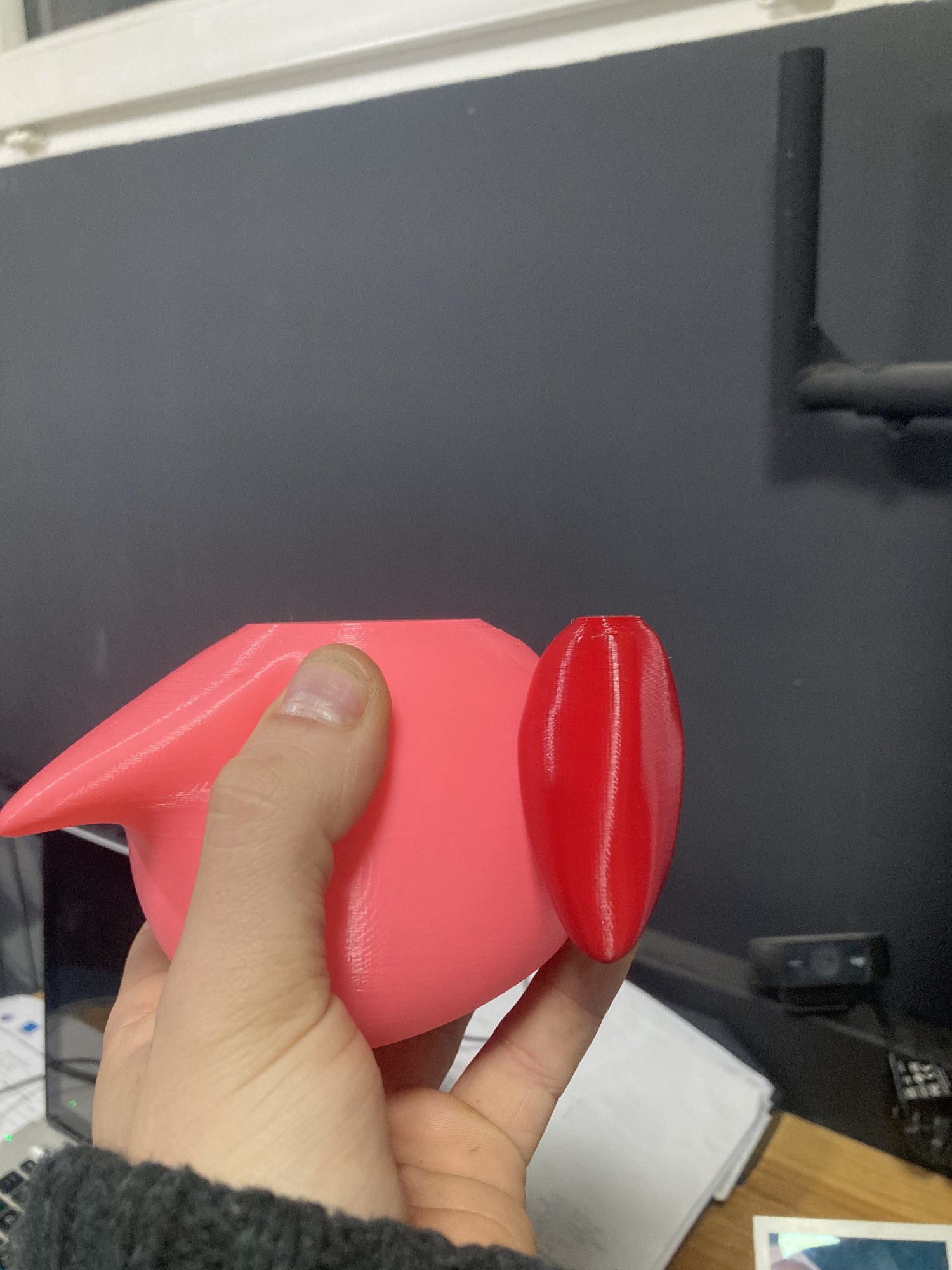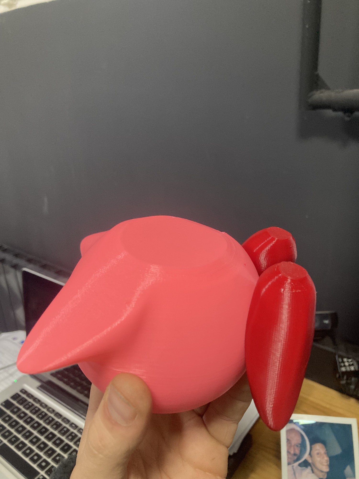 Pouvant imprimer au maximum en deux couleurs à la fois, les yeux (noir et blanc) et le corps (rose et rouge) sont ensuite colle ensemble pour un résultat impressionnant.