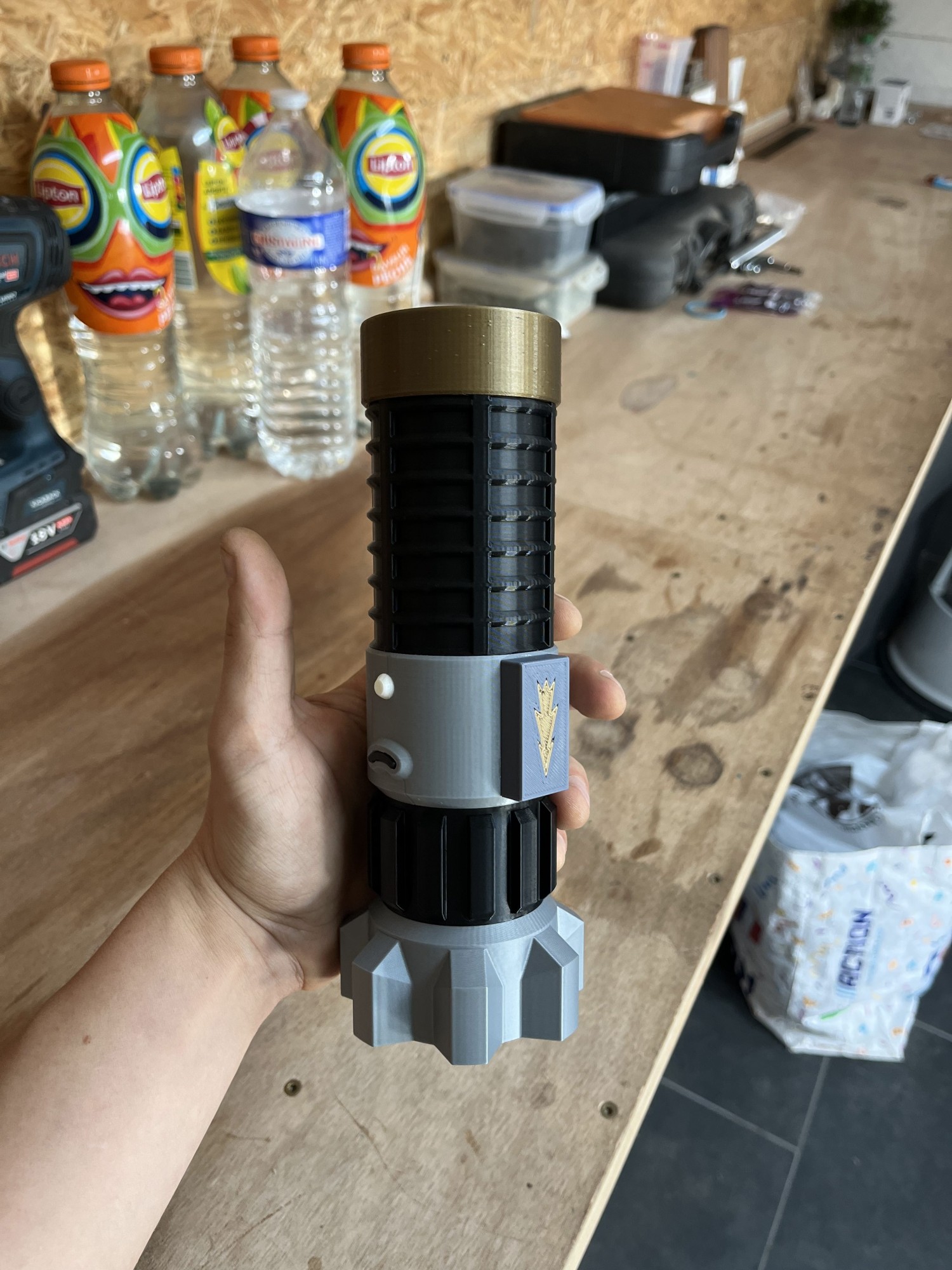 Nous avons choisi, plutot que de le fabriquer en bois et de le peindre, de le fabriquer en plastique recyclable (PLA). Cela nous permet de pouvoir produire des sabres en petite serie pour notre client, et aussi de faire attention à la planette.