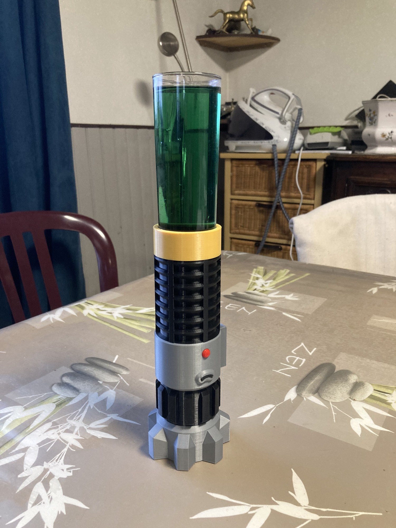 Visuellement basé sur le modèle de sabre du personnage Obi Wan Kenobi, nous avons tout de même dû le modifier pour correspondre à son utilisation. En effet, il s'agit là d'un cocktail, après tout. Le sabre doit pouvoir accueillir un verre, mais aussi, et surtout, tenir debout sans tomber !