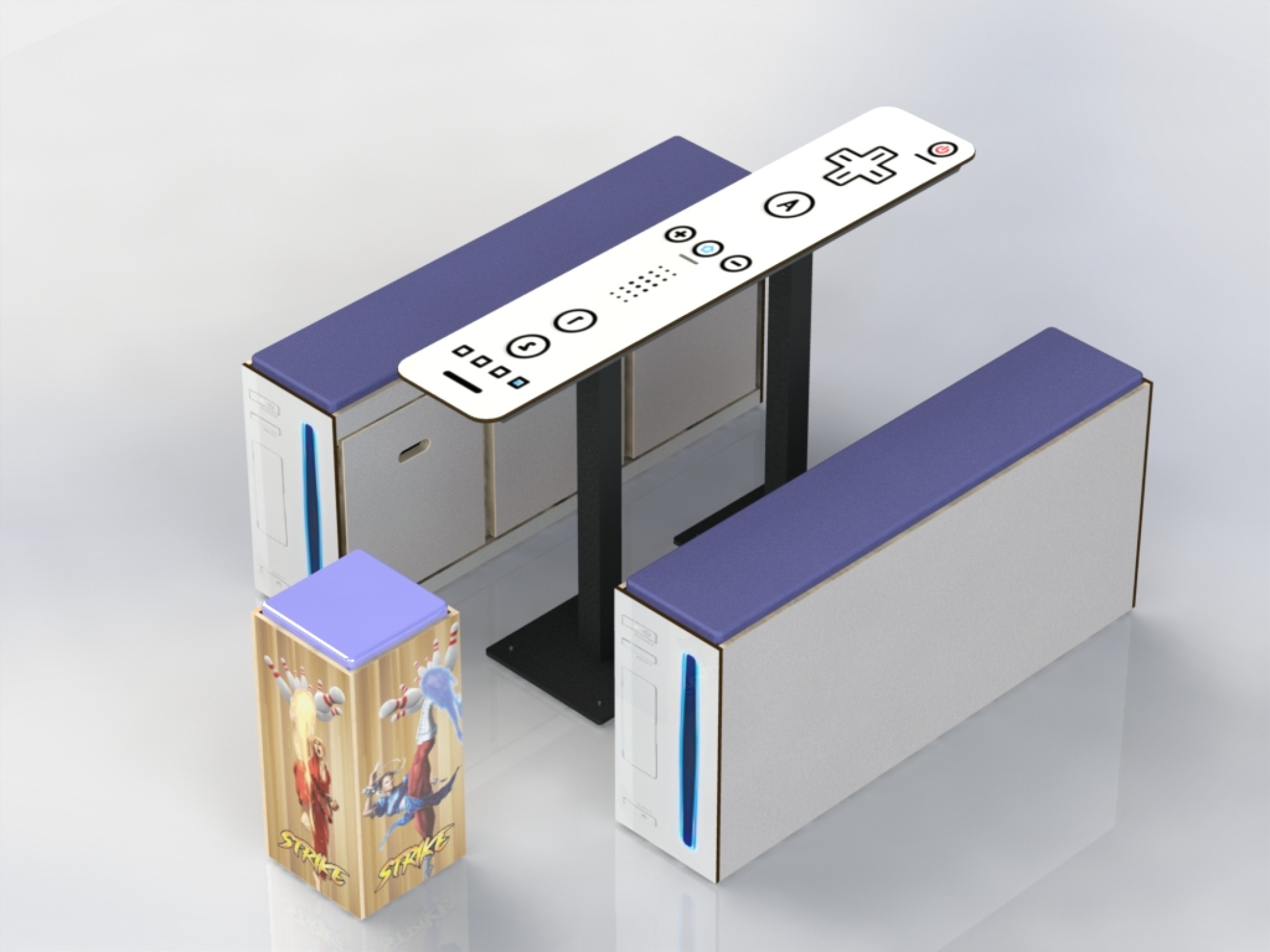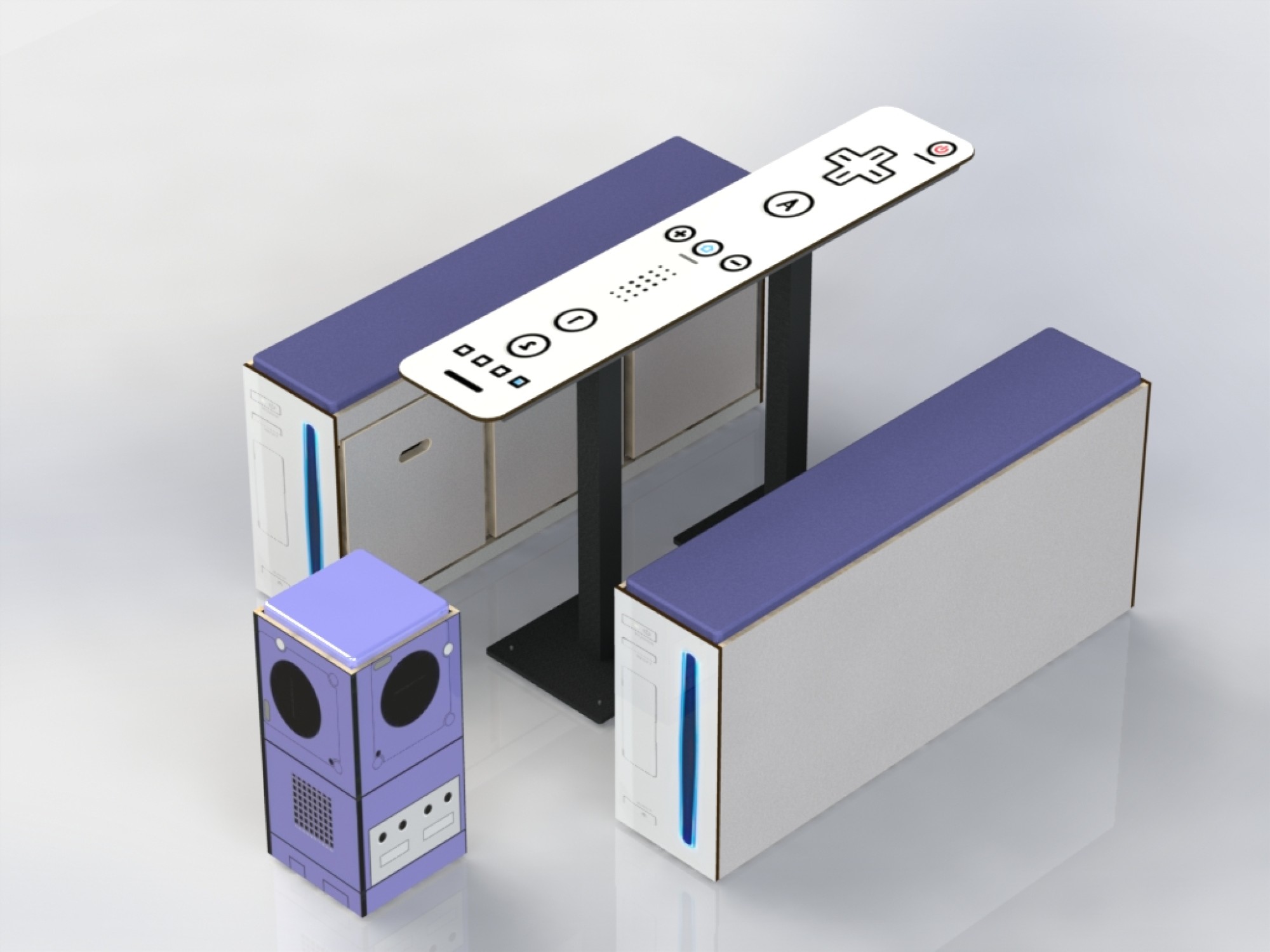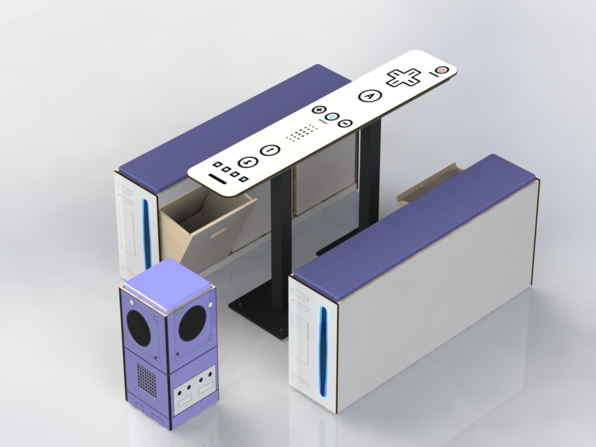 La Wii, cette console familiale aux 1000 jeux et aux possibilités inouïes a enchanté bon nombre de fans de jeux-video. Outre la table en forme de manette de Wii, Gloupy a également conçu les bancs-coffres Wii.