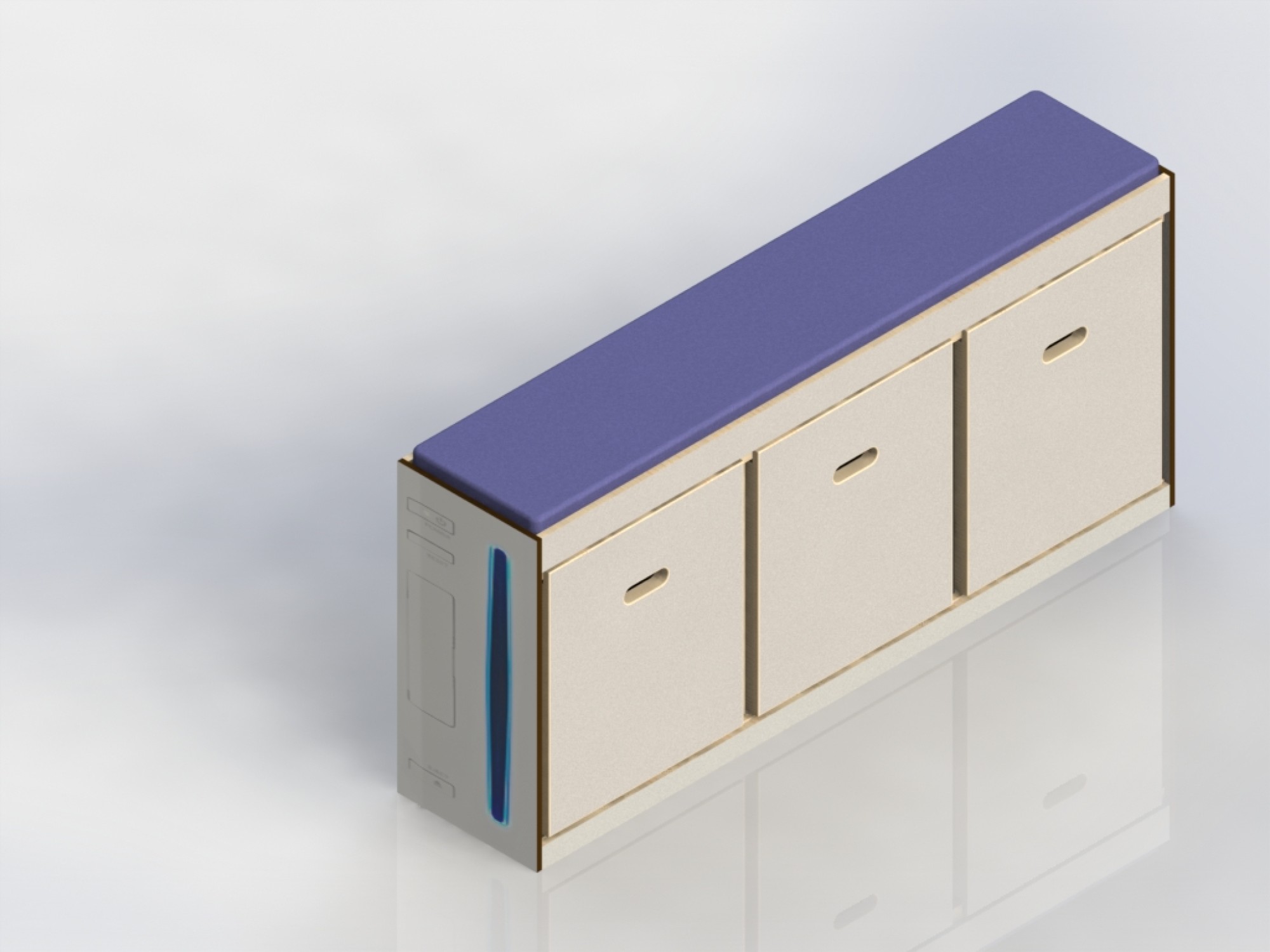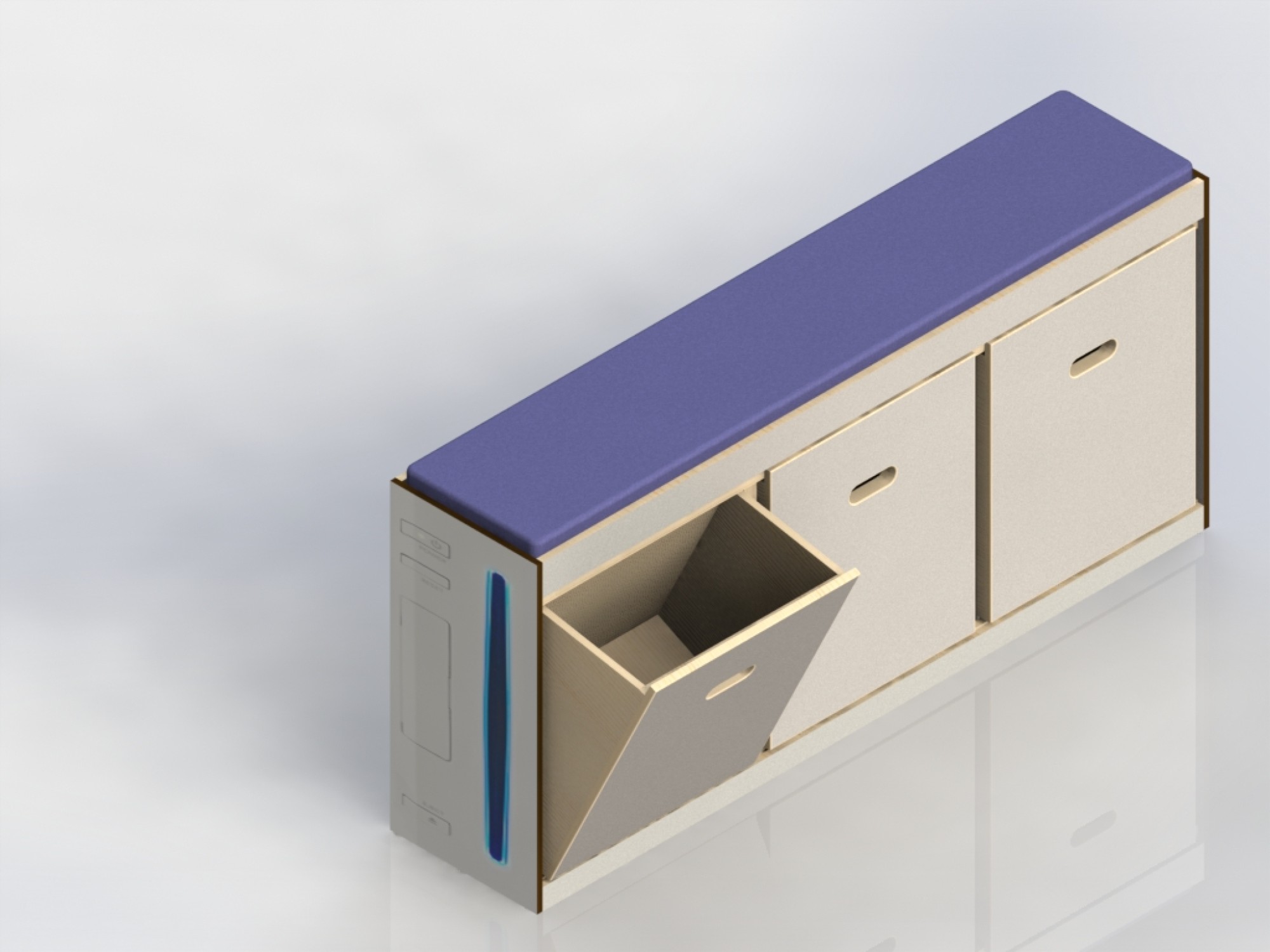La tranche de ces coffres ressemble étrangement à la face avant de la console Nintendo Wii. Fabriqué en stratifié ultrarésistant et epoxy bleu pailleté pour le lecteur DVD, tous nos panneaux sont découpé dans notre atelier près de Rouen avec notre défonceuse à commande numérique (CNC).
