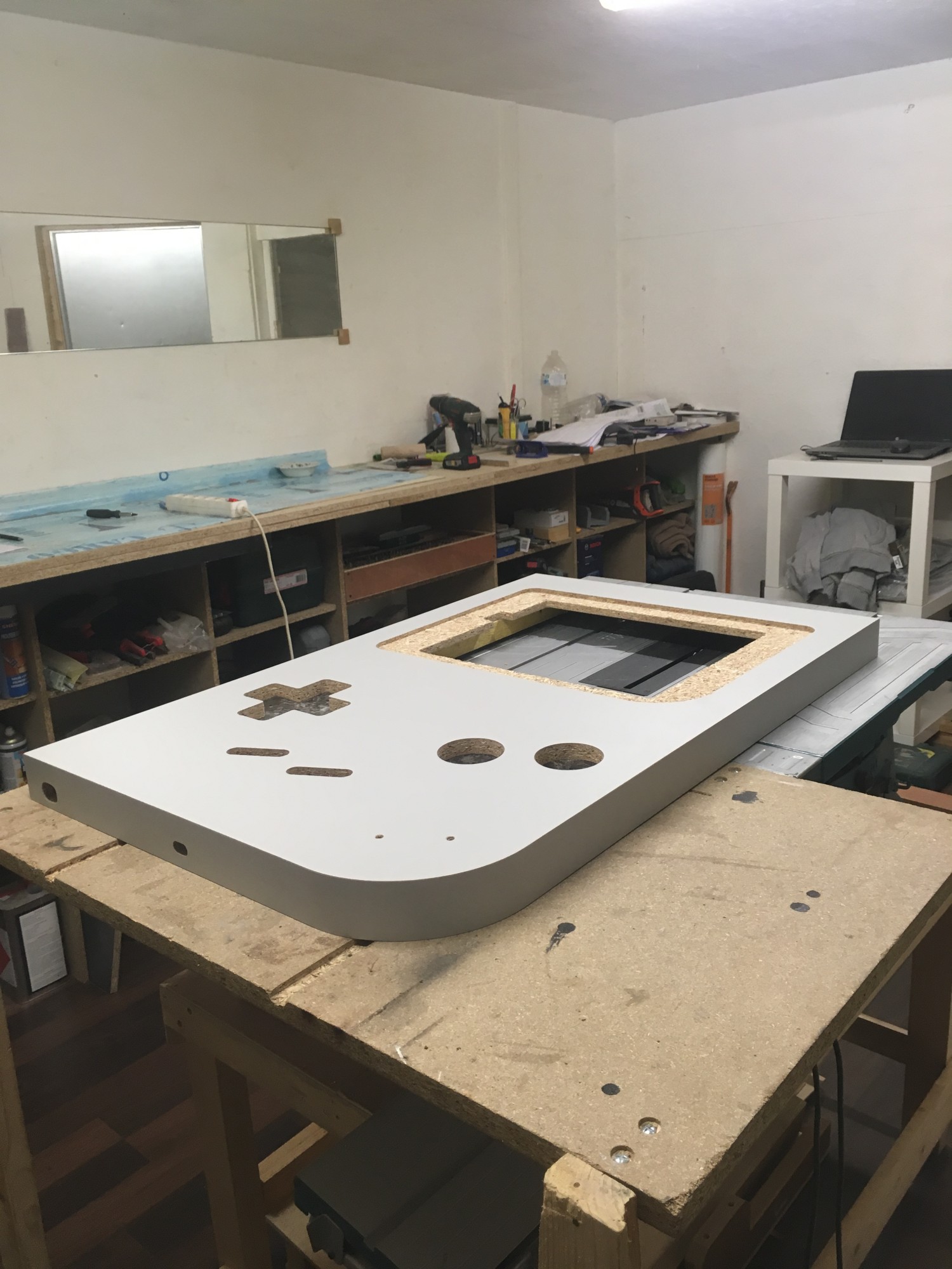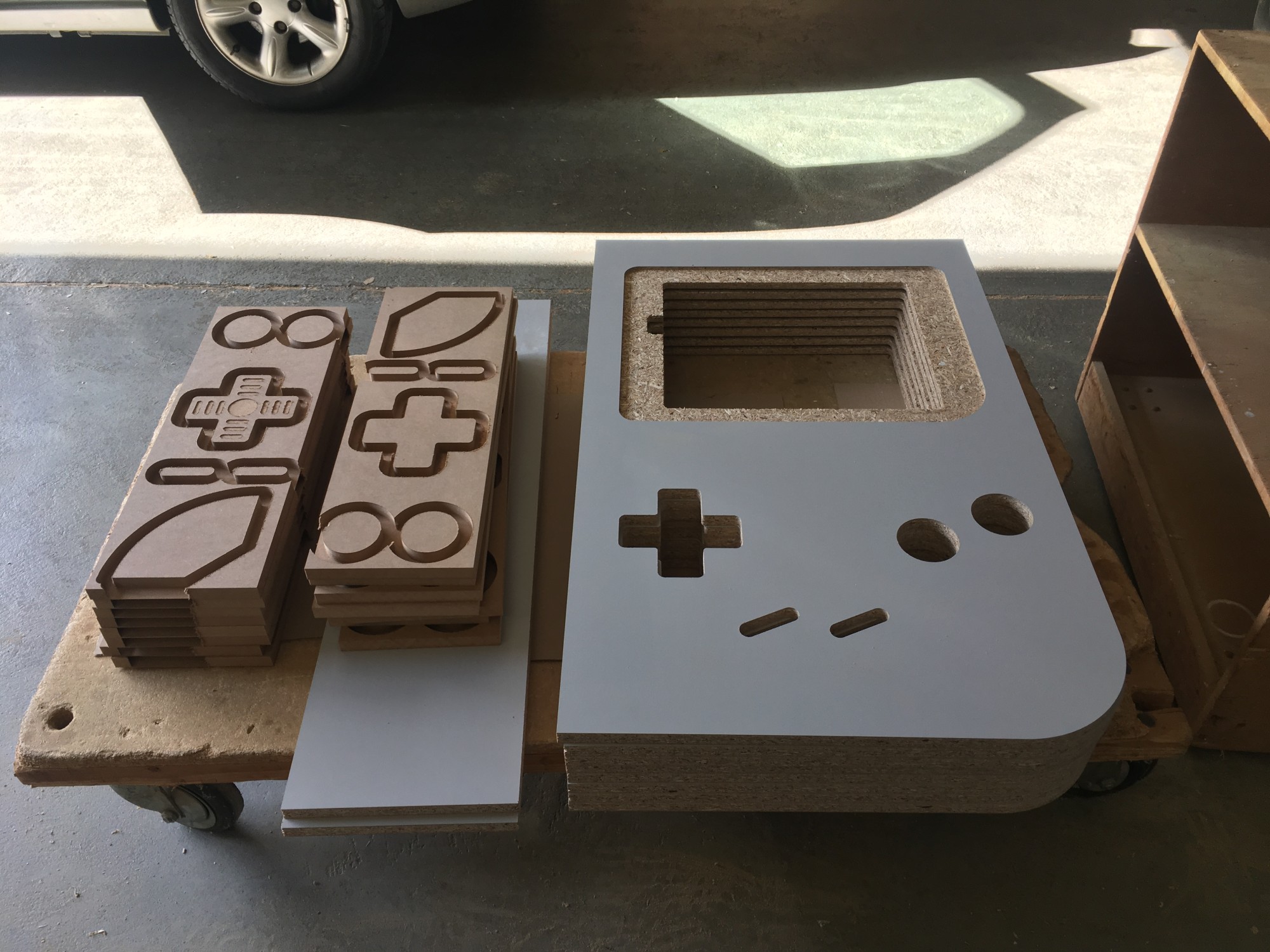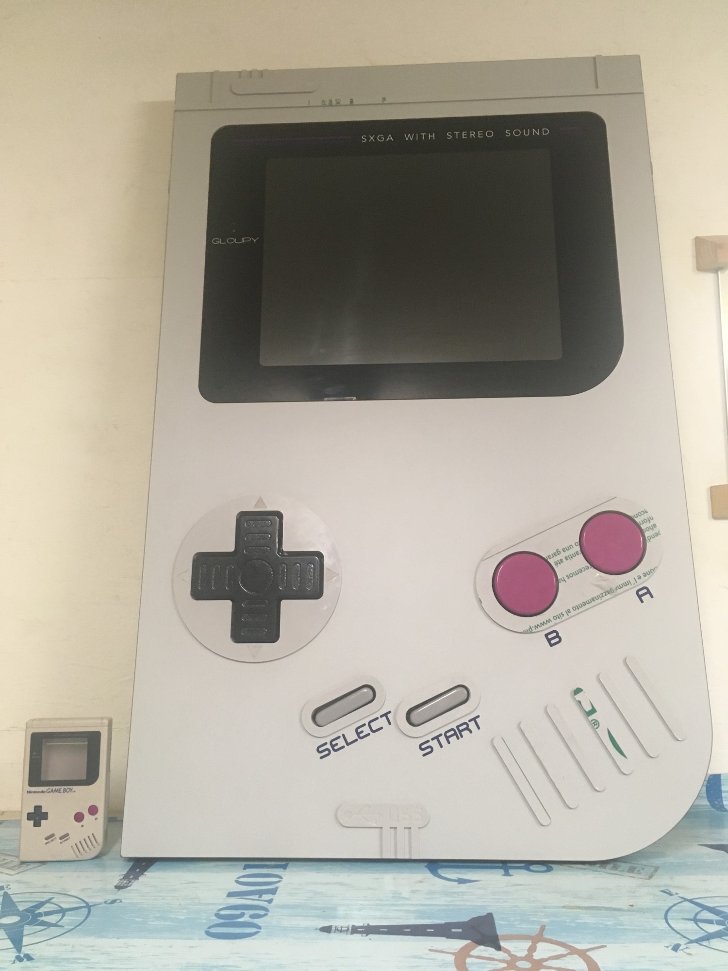 Même si le design est très proche de la console de Nintendo, la Gloupy Boy n'a pas les mêmes proportions. Nous avons dû ajuster le design en fonction des contraintes techniques que cela représentait de l'agrandir autant que cela. Cette console fait 1m x 0.63m après tout !