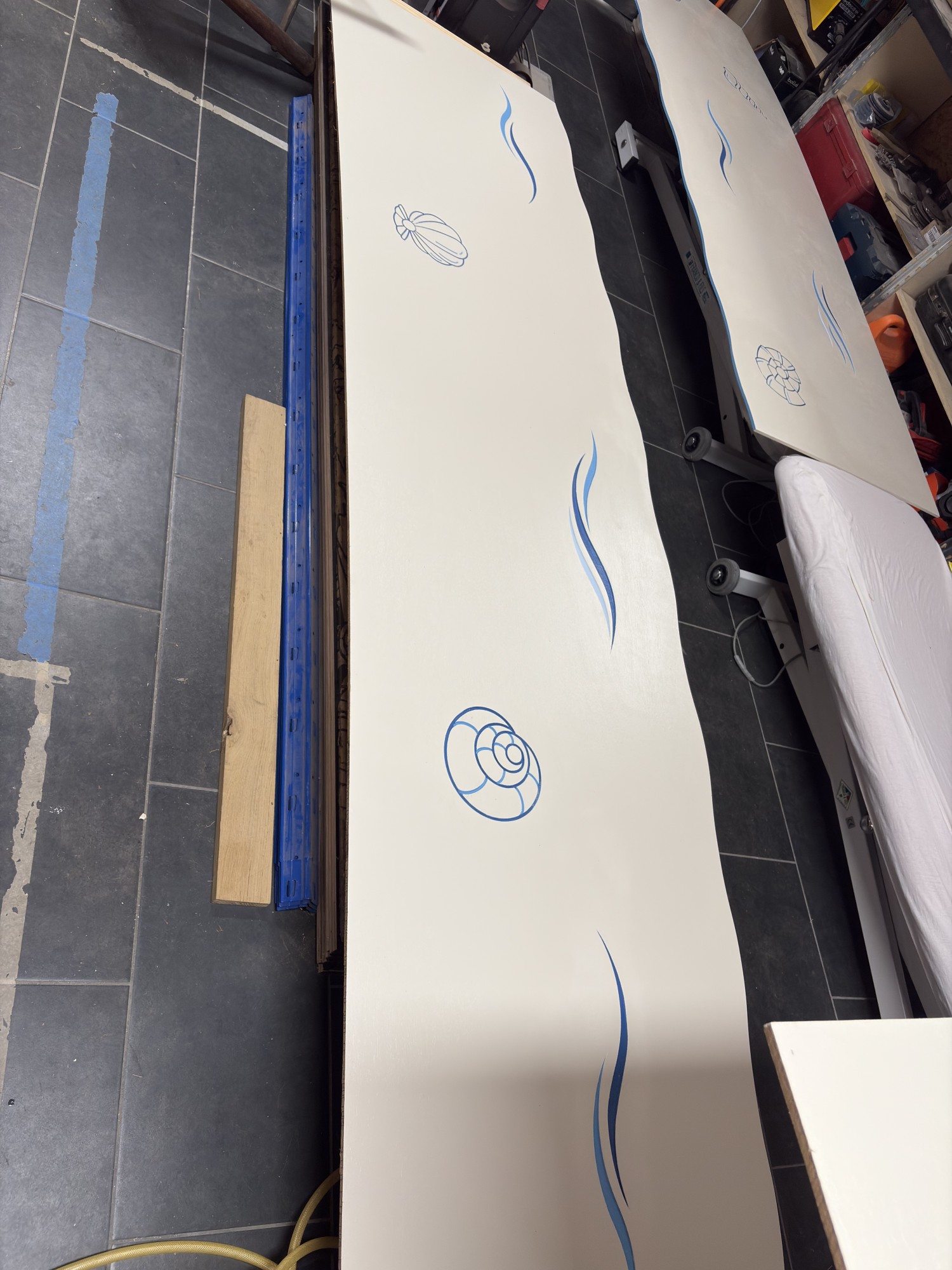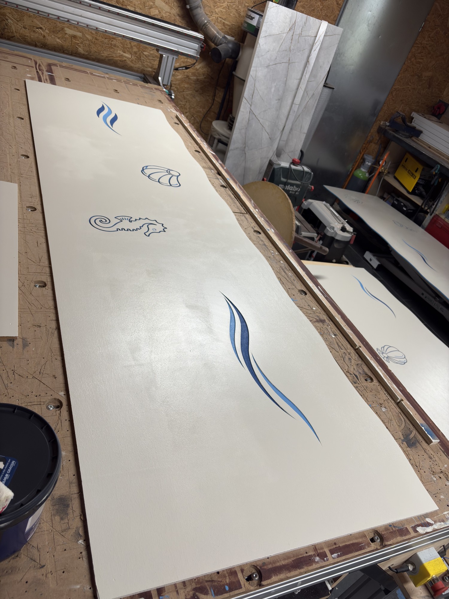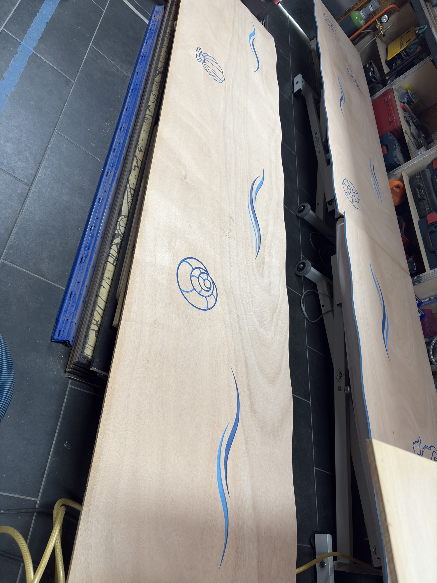 Le premier thème que nous avons abordé est celui de l'eau. Nous sommes restés simples dans la représentation des éléments. S'agissant d'un nouveau projet, il valait mieux faire quelque chose de sobre pour tester nos techniques d'usinage et de peinture.