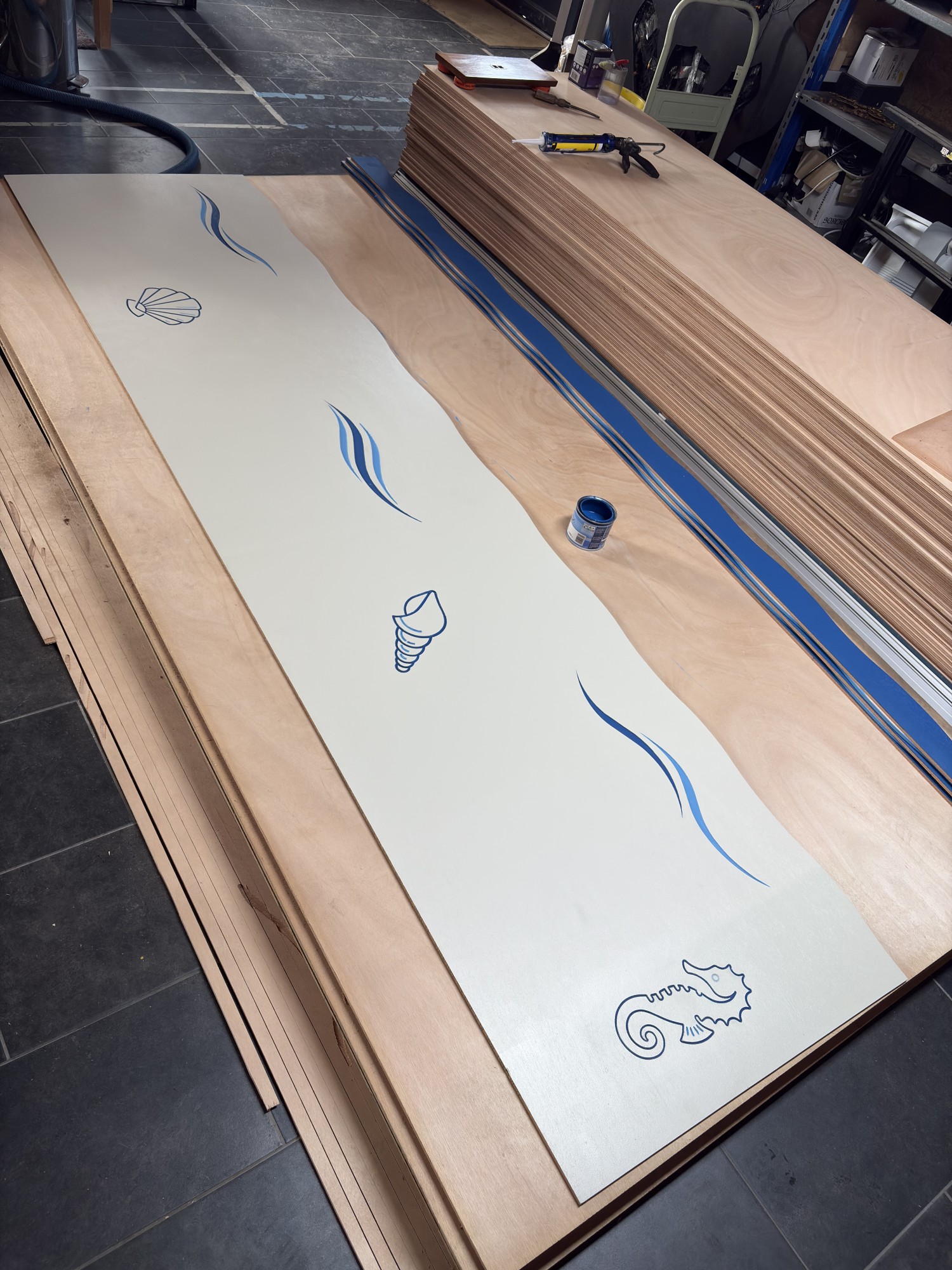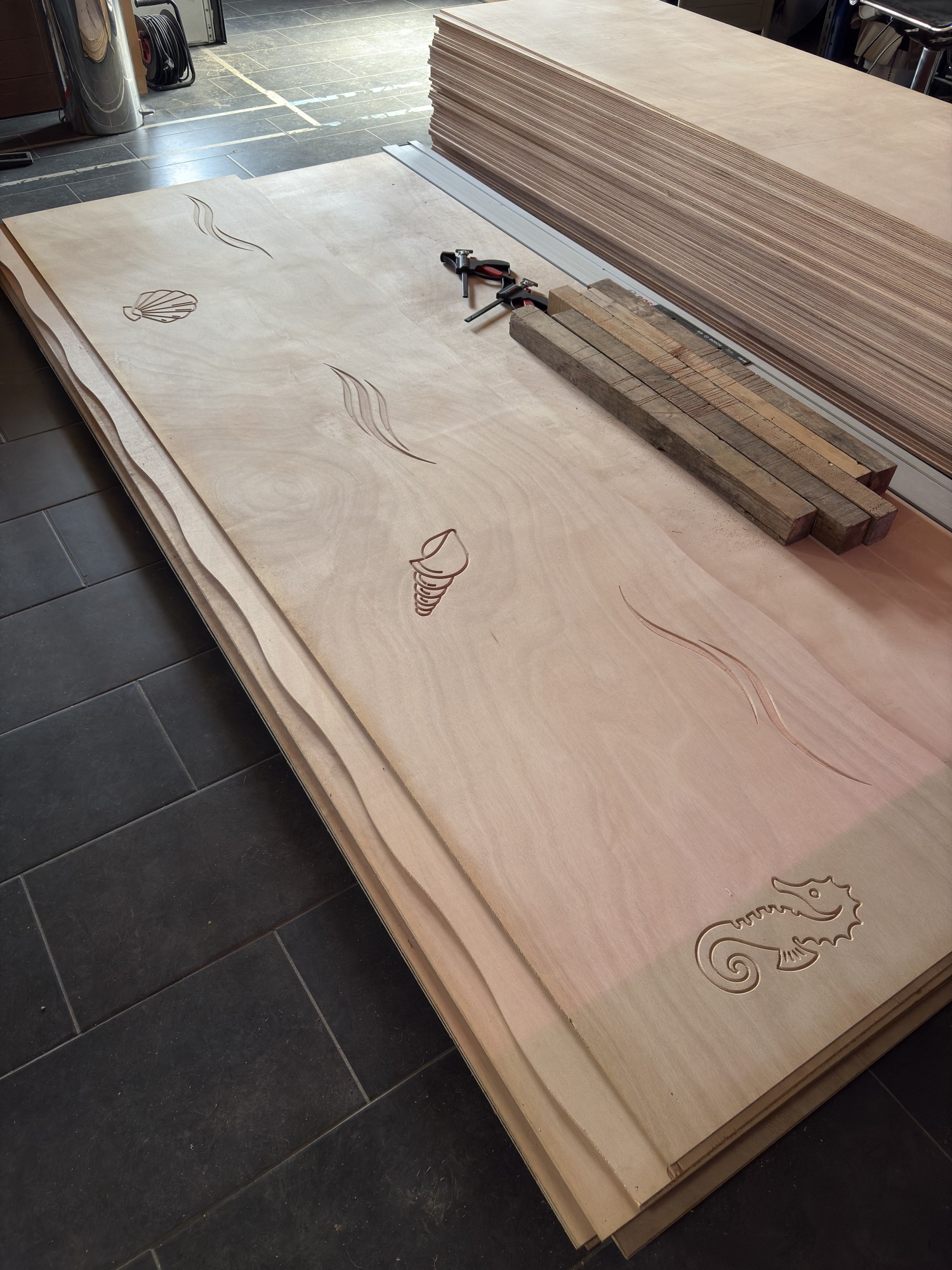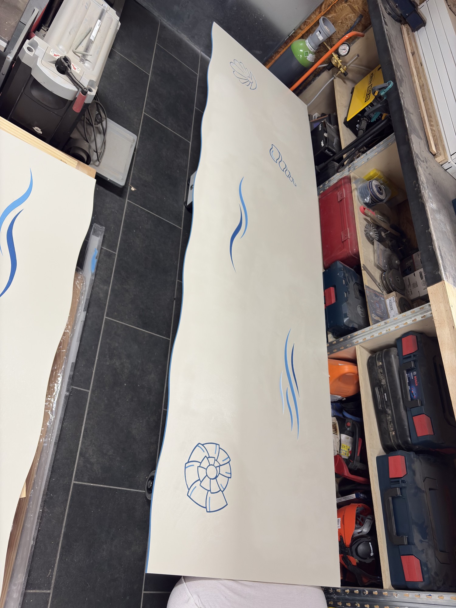 Le premier thème que nous avons abordé est celui de l'eau. Nous sommes restés simples dans la représentation des éléments. S'agissant d'un nouveau projet, il valait mieux faire quelque chose de sobre pour tester nos techniques d'usinage et de peinture.
