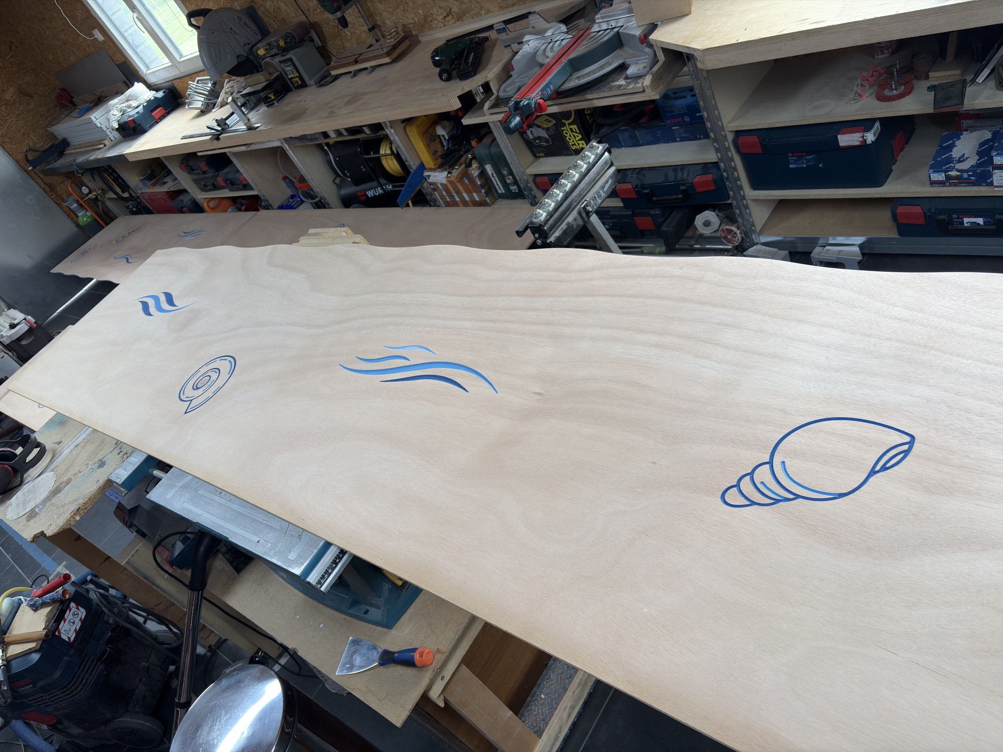 Une fois les panneaux gravés avec une mèche en V, nous avons dans un premier temps peint les gravures de différentes couleurs. Et c'est le plus simple car nous pouvons même déborder, cela n'a aucune importance. L'étape suivante consiste à poncer le panneau. Et comme les dessins peints se trouve plus bas que la face supérieure du panneau, et bien impossible d'abîmer la peinture, la ponceuse passe au-dessus.