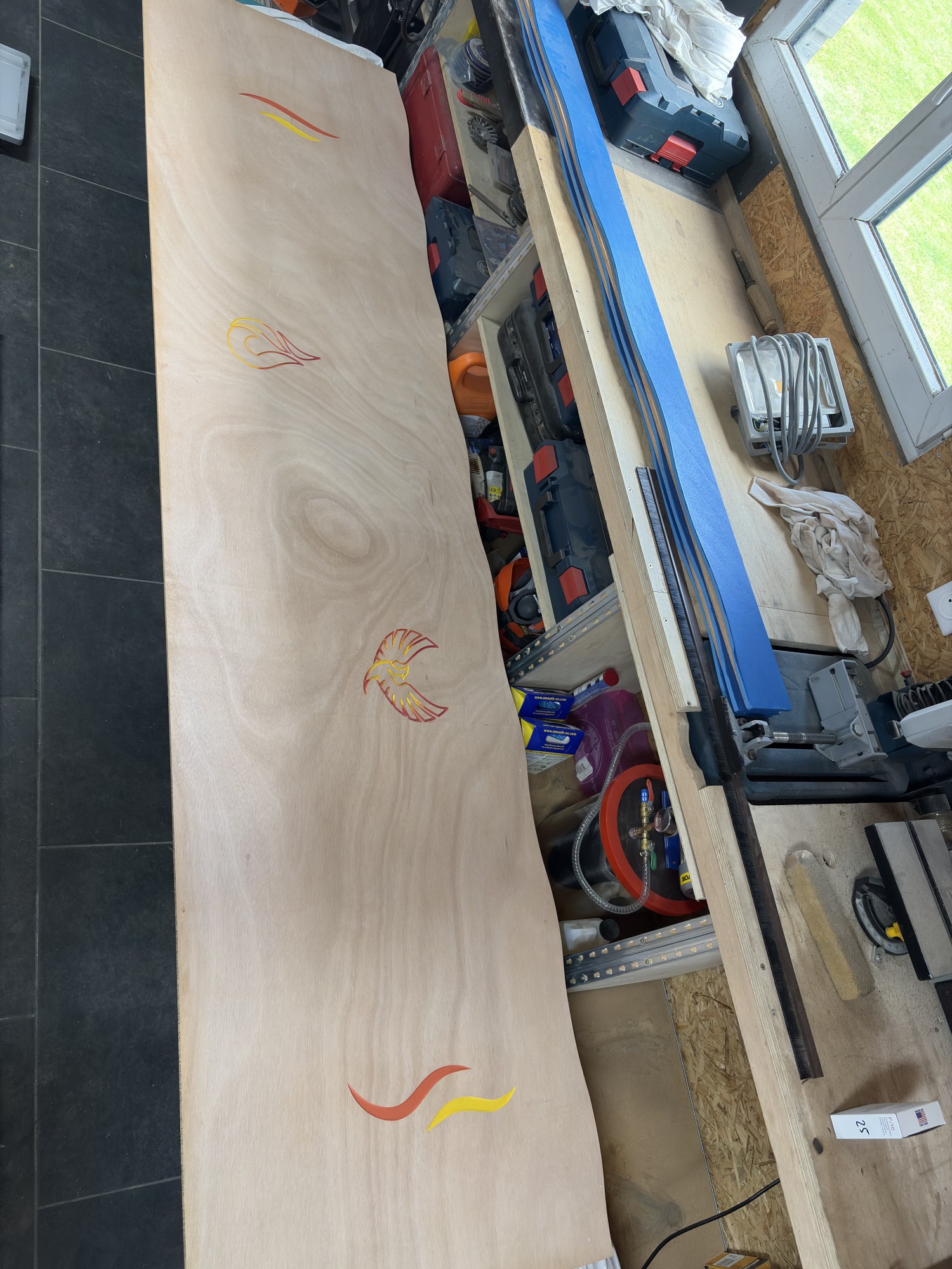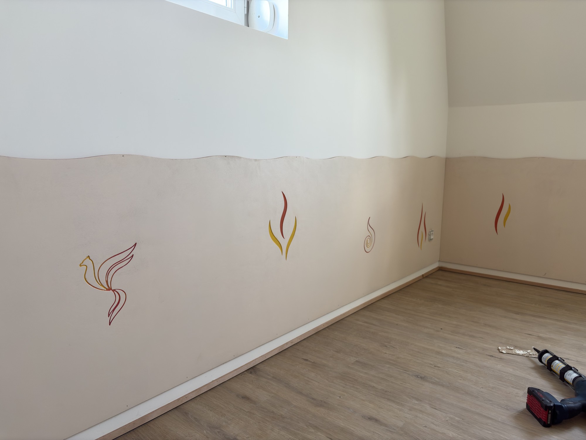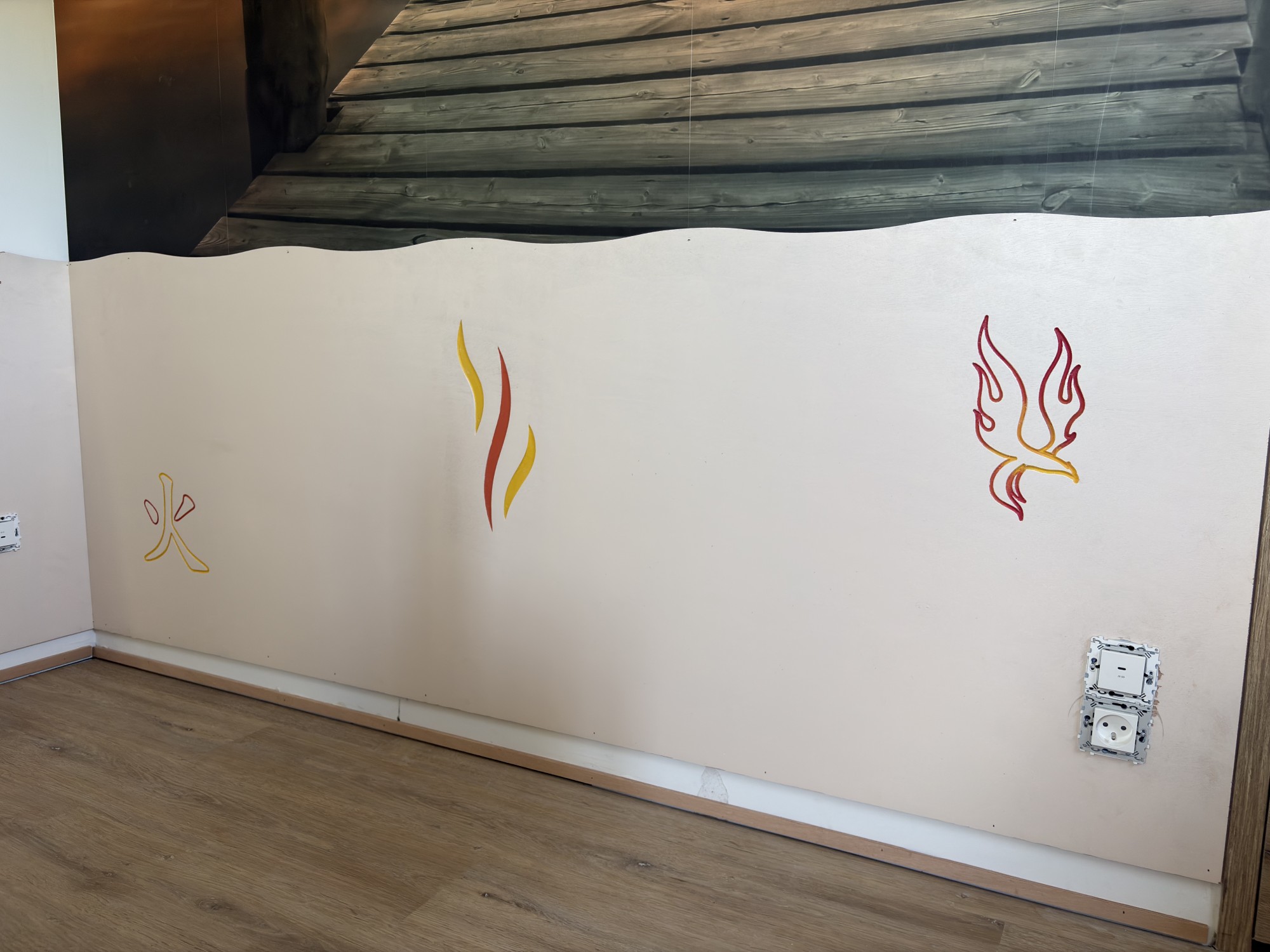 Après l'eau, nous avons attaqué le thème du feu. Pour rappel, le Clos de la Foret nous a missionnées avec la fabrication de protection de murs décoratifs sur mesure avec pour objectif de faire un thème par pièce. Ici donc : le feu.