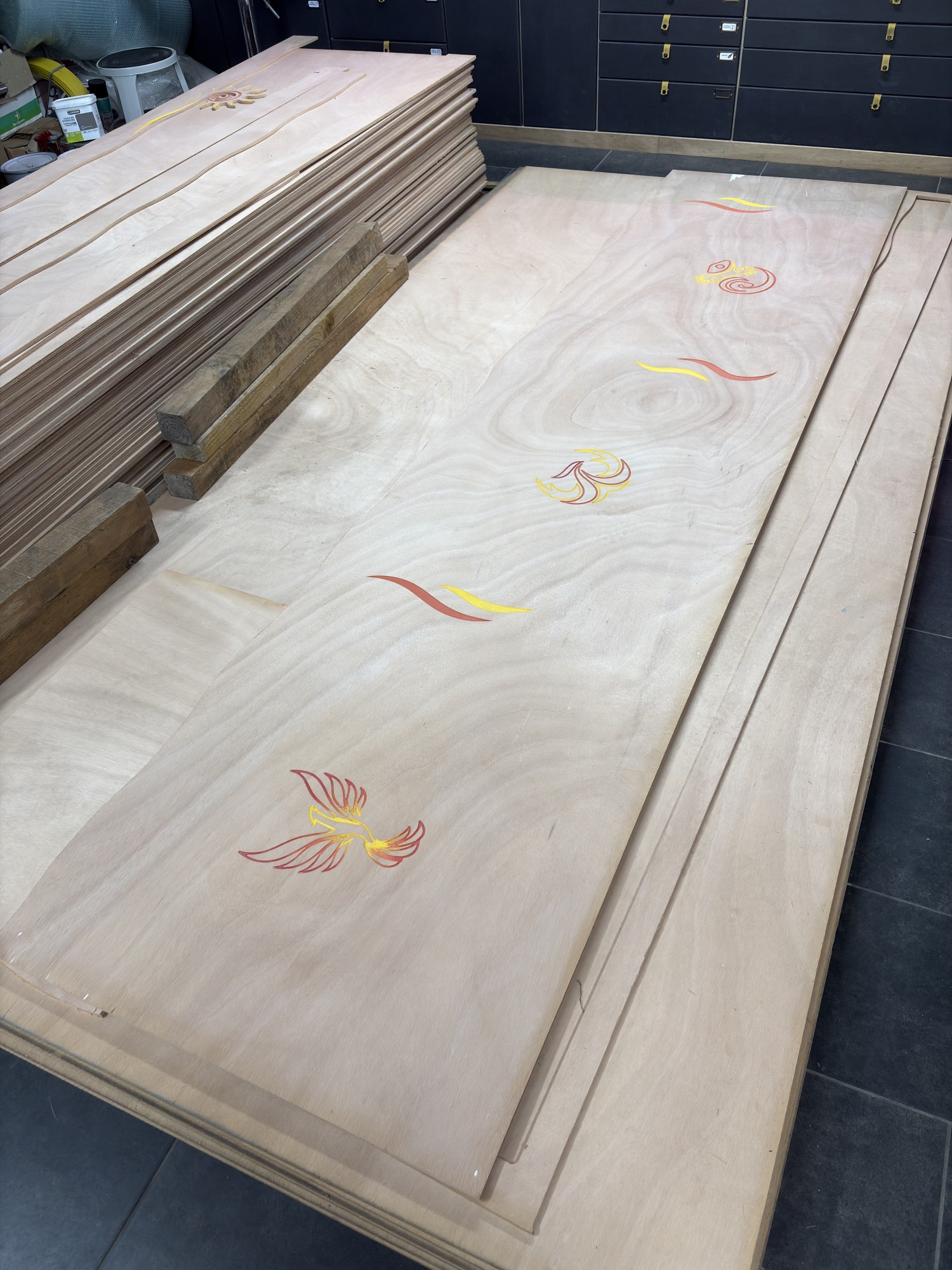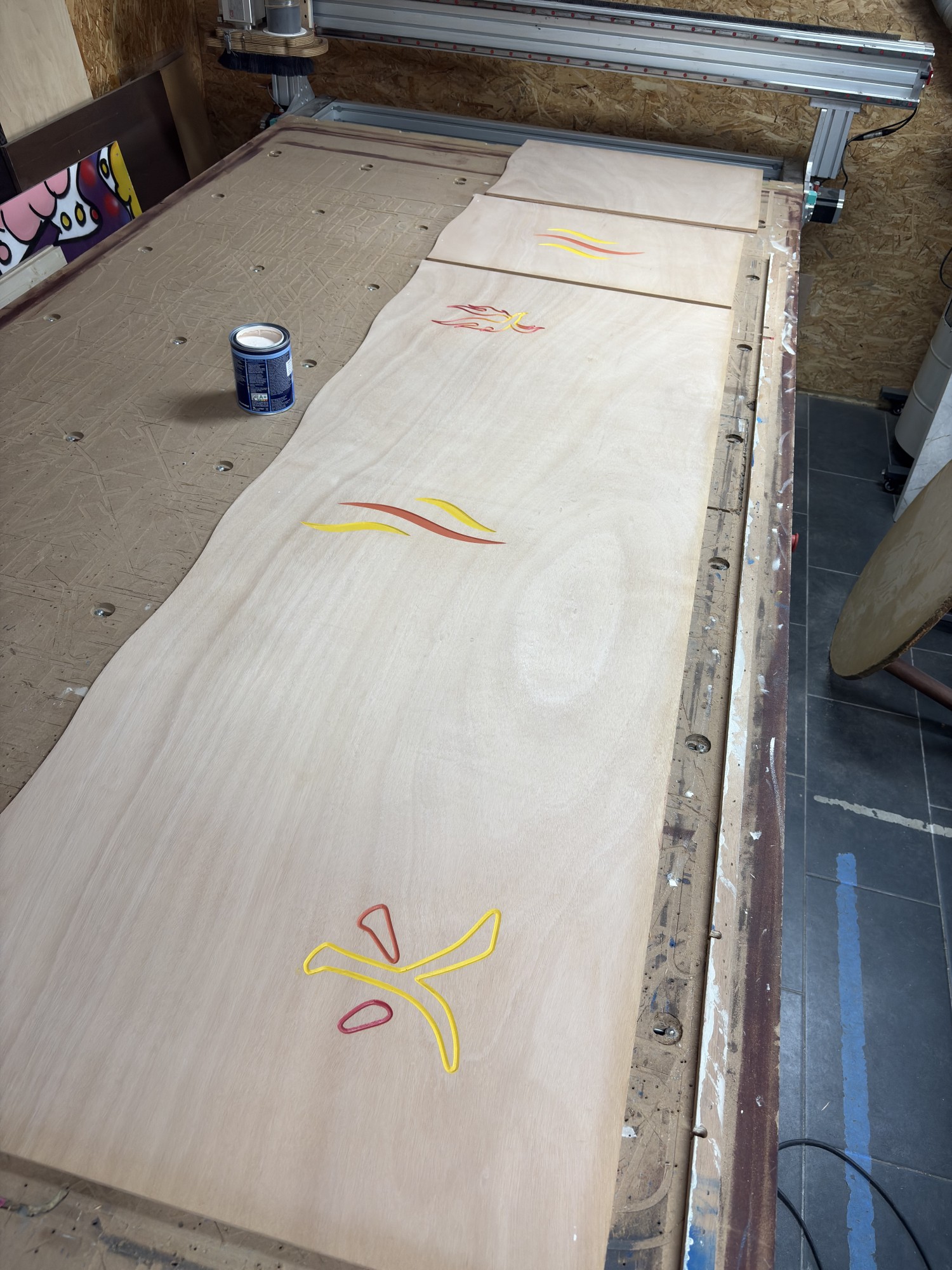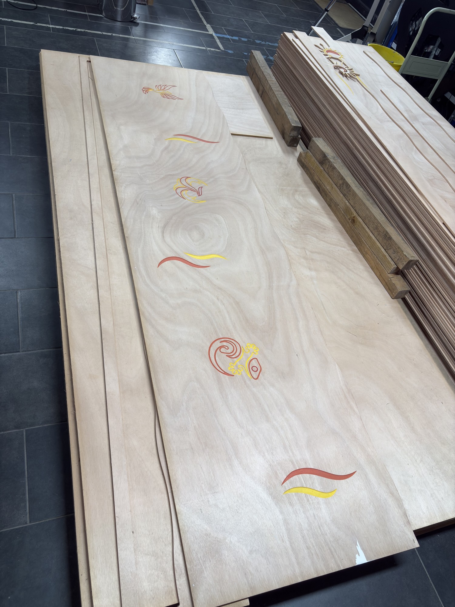 Le procédé de fabrication reste le même. Dans un premier temps, nous dessinons tous les décors des panneaux sur un logiciel de CAO vectoriel. Ensuite, nous calculons les parcours d'outils pour l'usinage. Nous avons ensuite usiné tous les panneaux dans notre atelier Rouennais avec notre fidèle CNC (fraiseuse a commande numérique).