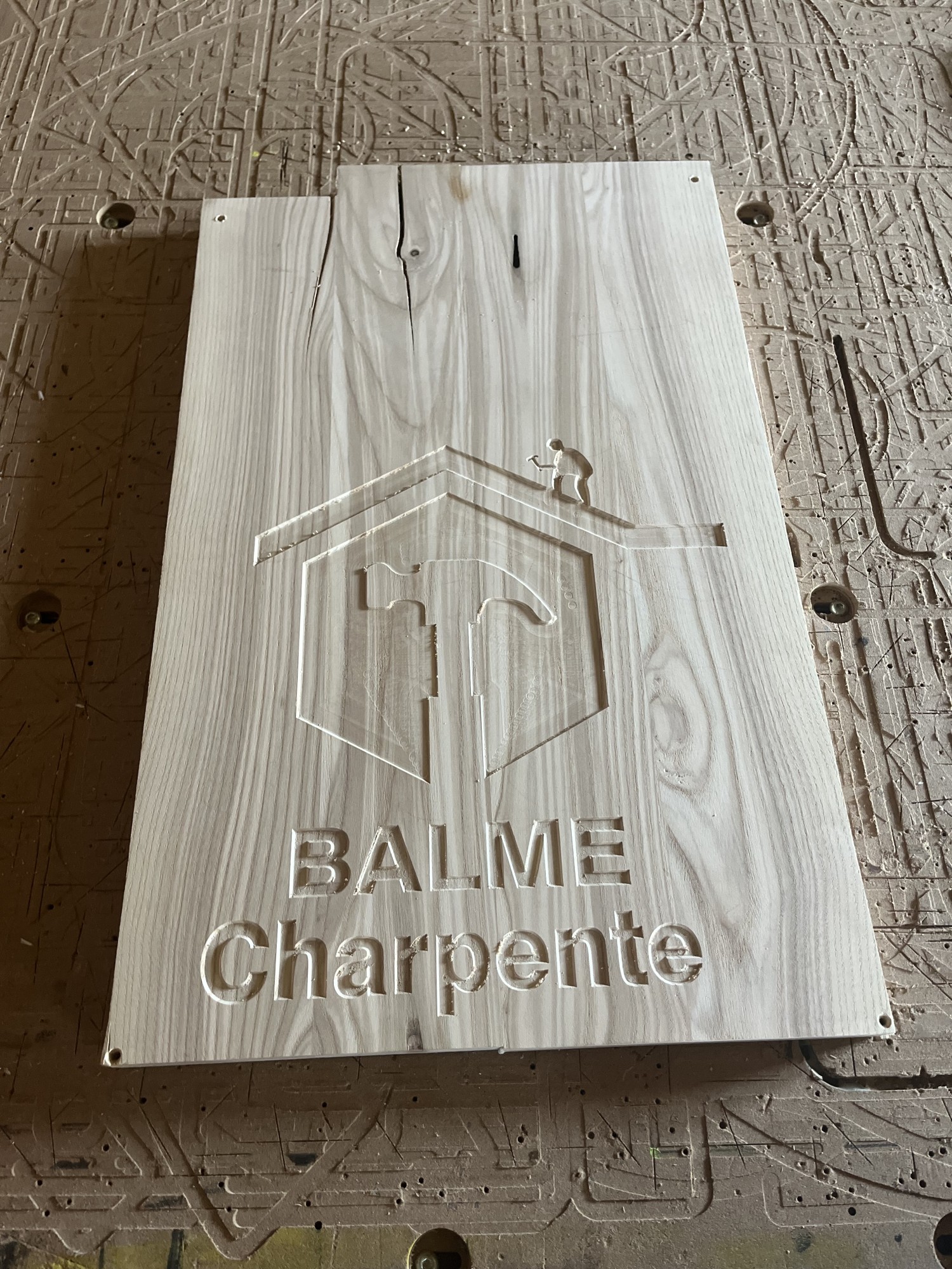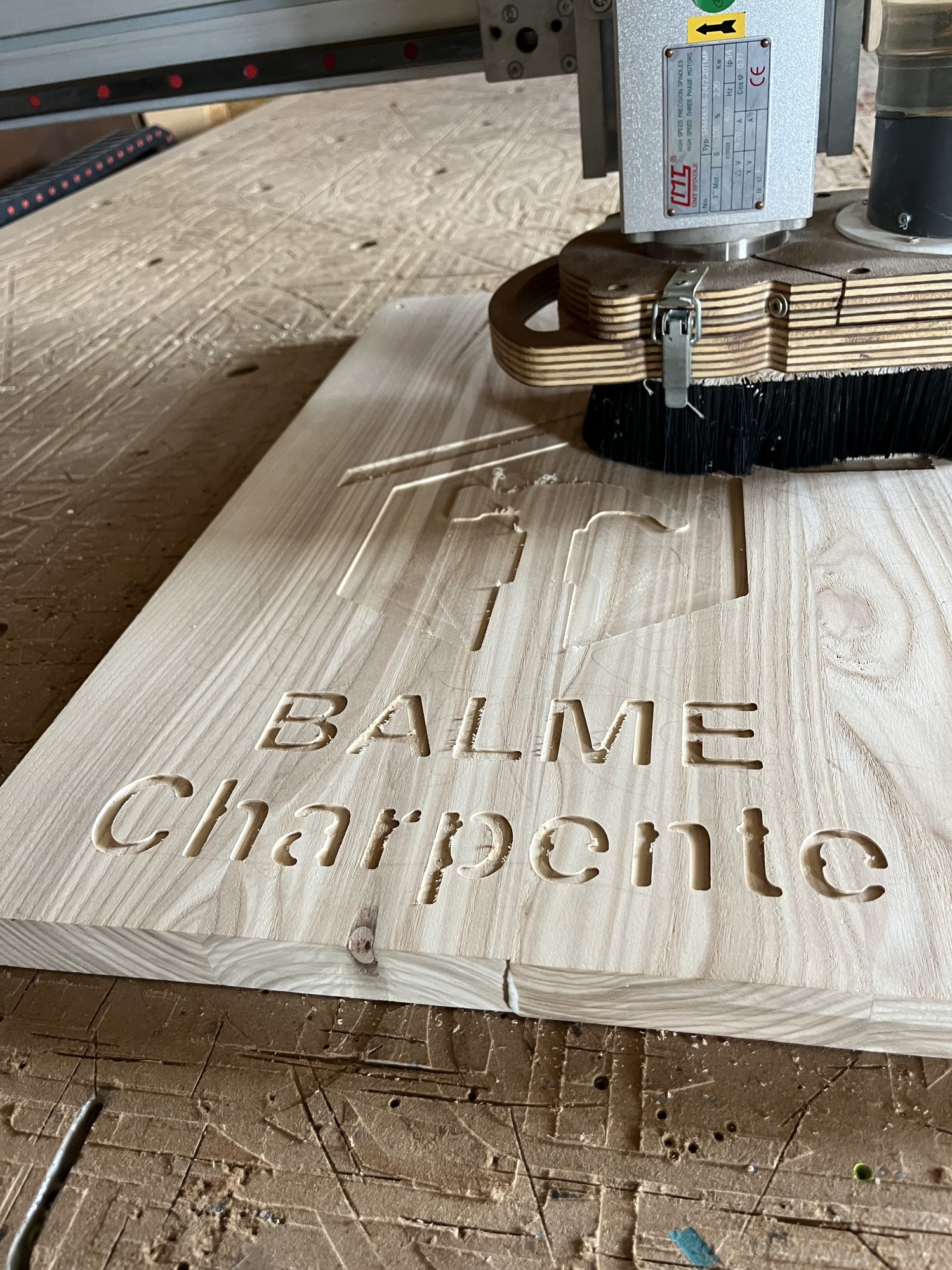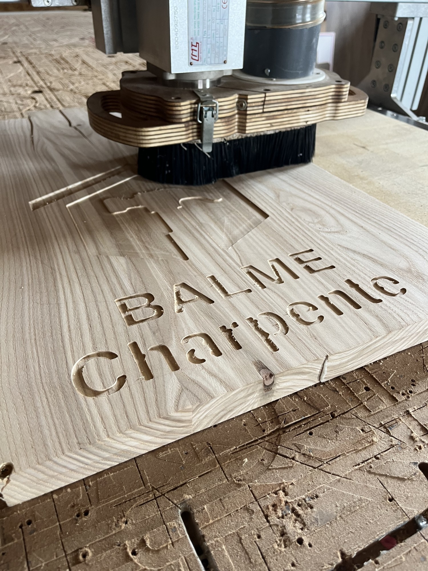 Mais cela n'est parfois pas suffisant. Pour donner plus de détail, nous allons, en plus d'usiner avec une fraise droite, utiliser une fraise en forme de V. La pointe de cette fraise permet d'obtenir plus de petites détails fin et rend les bords moins saillants. L'utilisation de ces deux outils permet dans un premier temps d'éliminer rapidement de la matière pour ensuite s'occuper des détails fins. C'est ce que nous avons fait pour le logo de Balme Charpente ci-dessous, mais vous pouvez aussi voir le même genre de technique utilisé sur notre dessous-de-plat personnalisé.