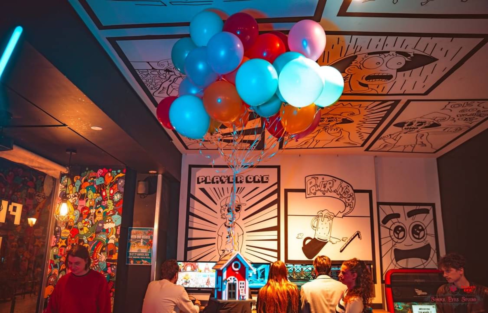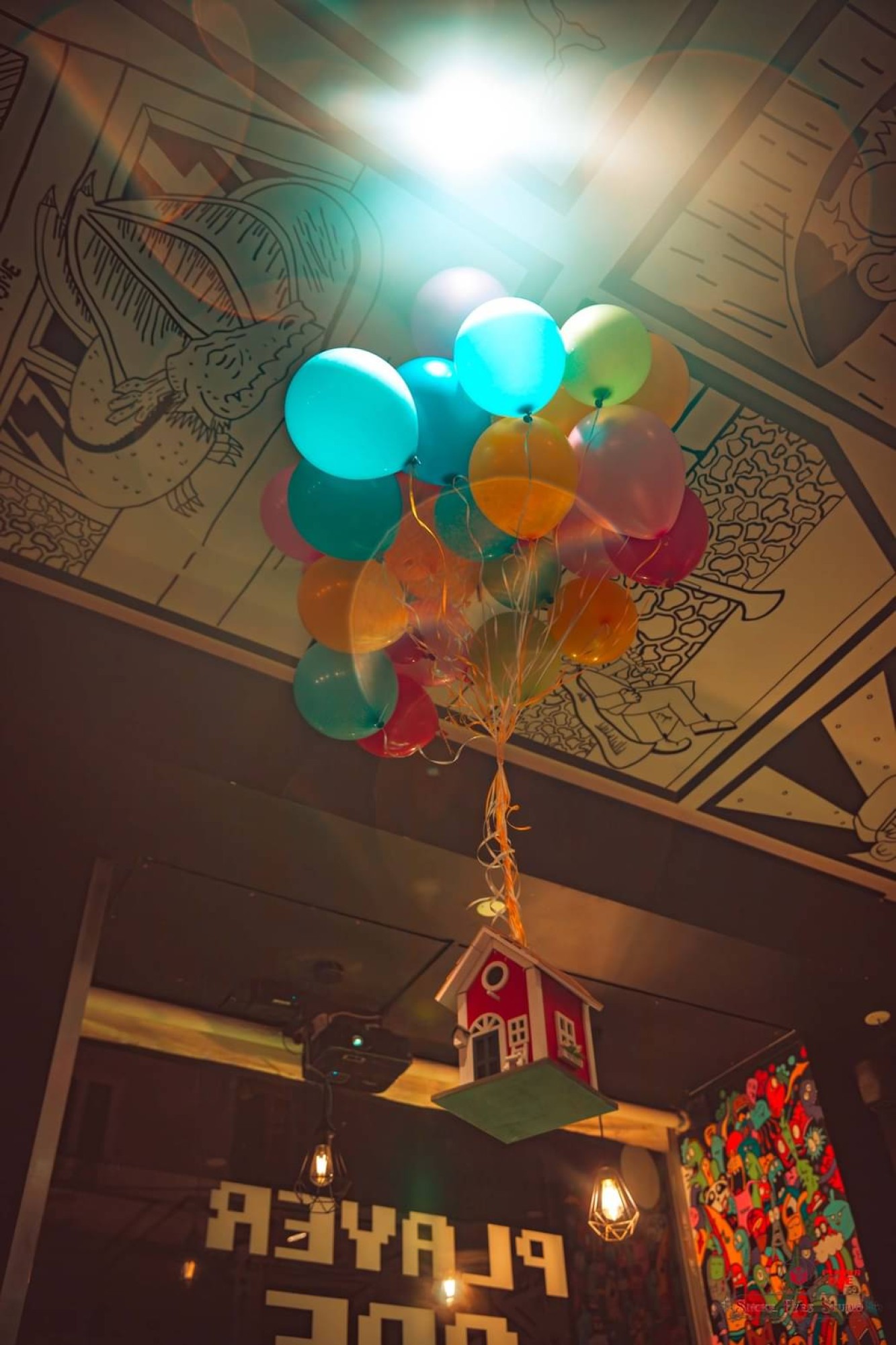 Ensuite : les ballons. A première vue, en voyant nos photos, vous vous dites que tous les ballons sont gonflés à l'hélium. Et bien que né ni ! Tout est gonflé à la pression bu calo poumonale, du bon vieux CO2. Mais alors comment font-ils pour flotter dans les airs ? Notre secret : le scotch double face ! Tous les ballons sont scotchés les uns aux autres. Il ne reste plus qu'à les fixer à la corde principale qui tient la maison au plafond.