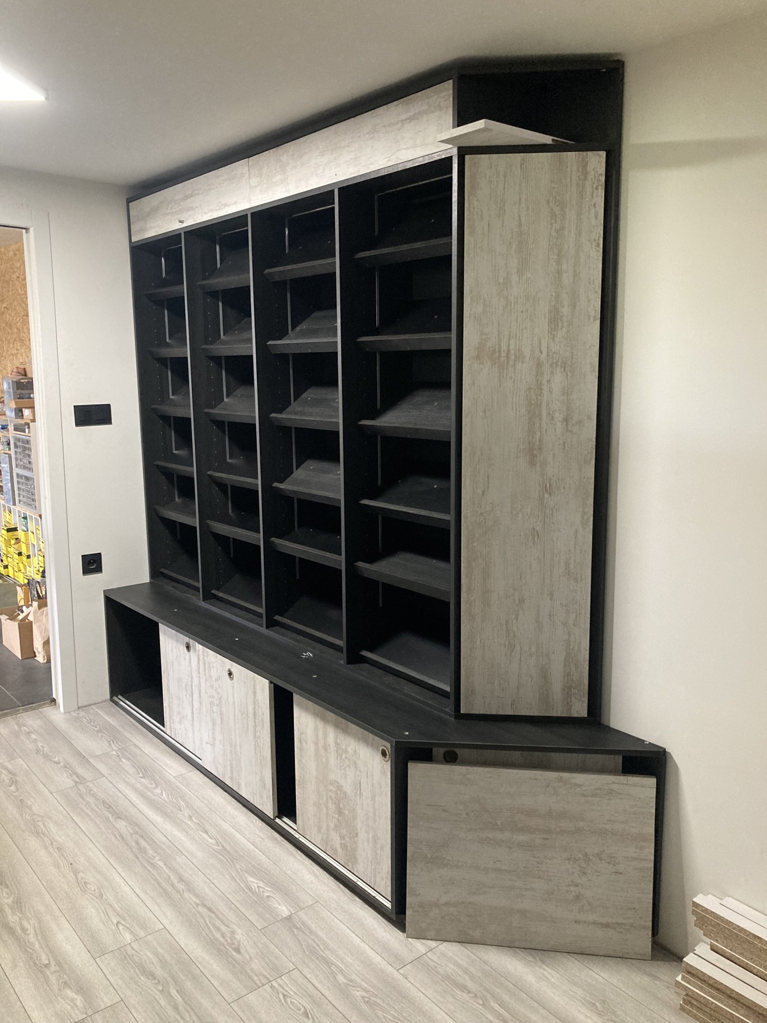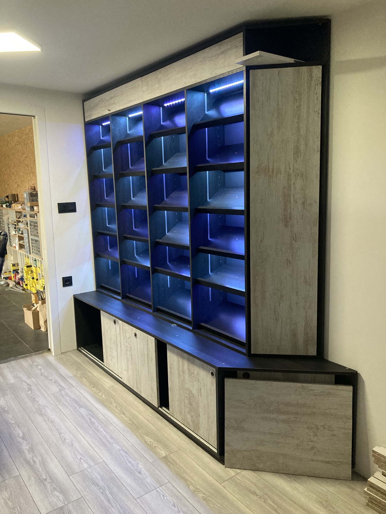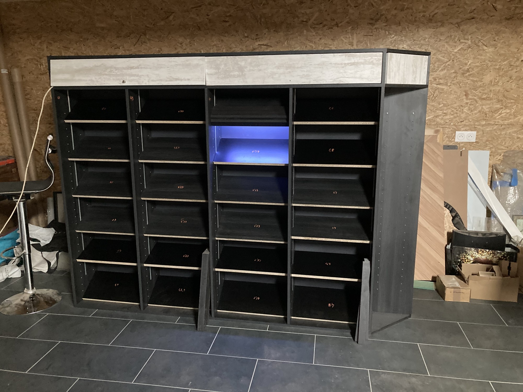 Ce meuble, d'apparence très simple, renferme en réalité un petit secret. Comme vous pouvez le voir, toutes les cases sont éclairées d'un ruban led. Deux railles plongent le long des hauteurs permettant d'alimenter ces leds peu importe la hauteur de l'étagère !