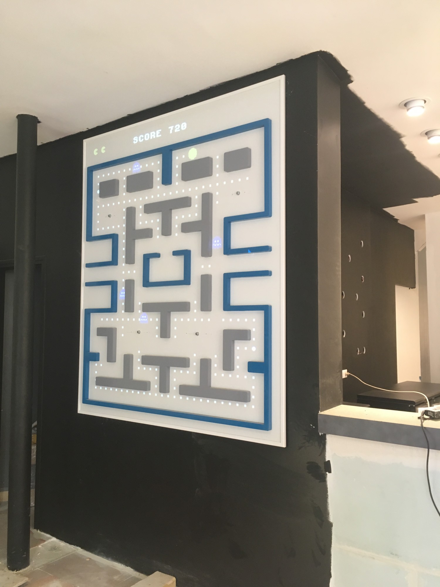 Pac-man est sûrement l'une des plus grosses icône du jeu-vidéo à l'heure actuelle. C'est pourquoi lorsque le bar Player One à Paris nous a contactés pour en fabriquer une version géante et jouable pour ses clients, nous avons tout de suite dit oui ! Nous ne sommes pas menuisiers geek pour rien !