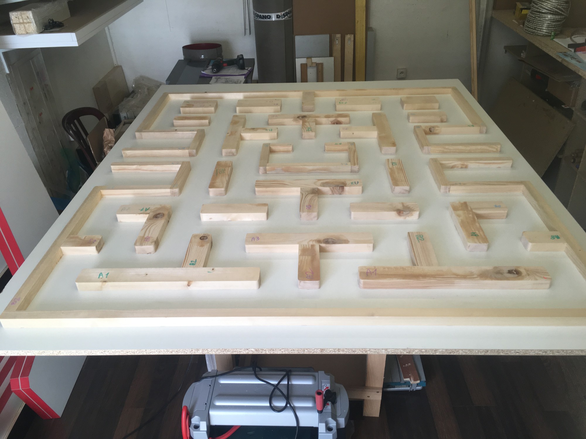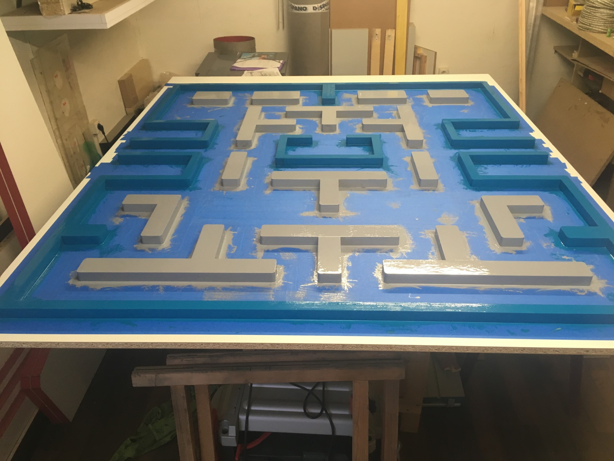 Pour le rendre jouable, nous avons utilisé du vidéo mapping pour projeter les personnages et pastilles sur le labyrinthe. Il s'agit là d'une technique très simple : utiliser un vidéoprojecteur sur des objets réels en volume. Ici, le labyrinthe. Nous avons tout de même dû recrée le fameux jeu-vidéo sans ses murs virtuels car il aurai fait comflit avec les murs physiques. Tout ceci donne un effet de profondeur au jeu-vidéo qui n'existait pas avant.