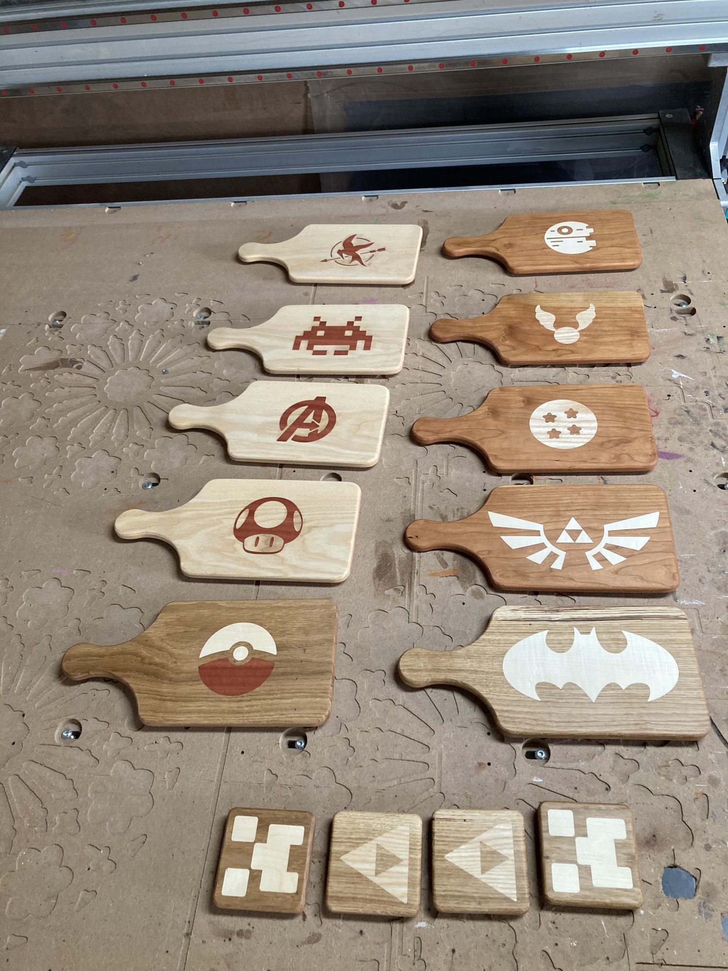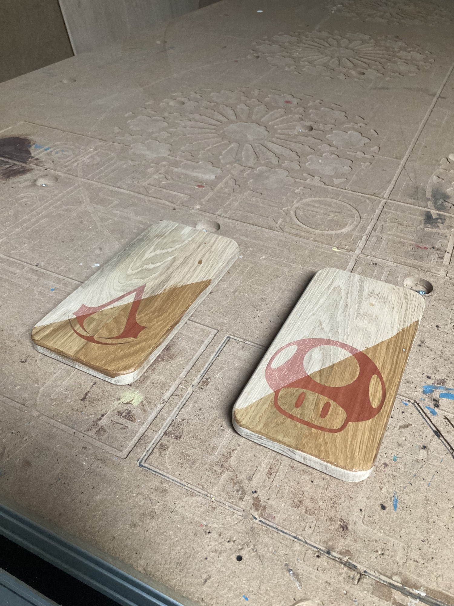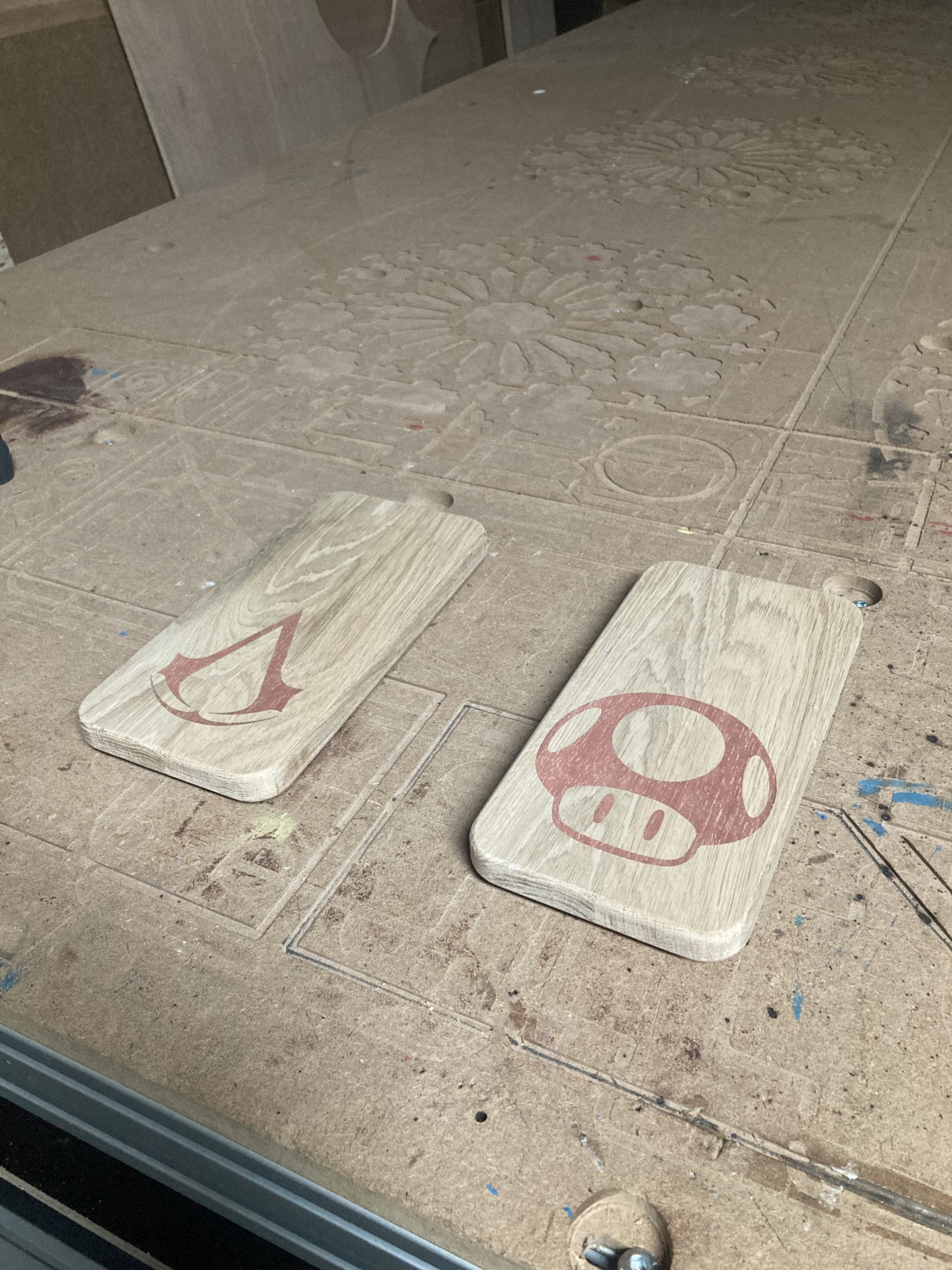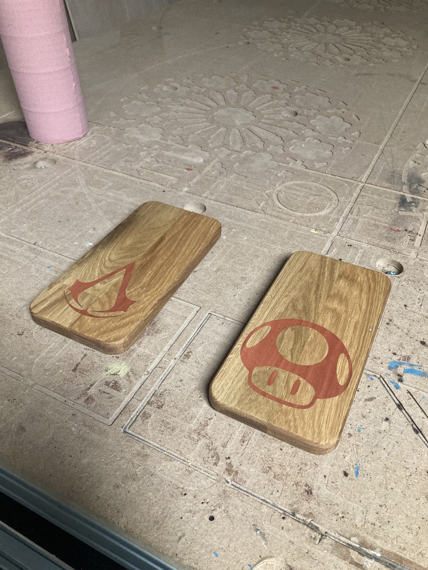 Chez GLOUPY, nous pouvons decouper du bois à la forme, meme pour des assemblages complexes comme ceux de nos planches à decouper pour le bar Player One.