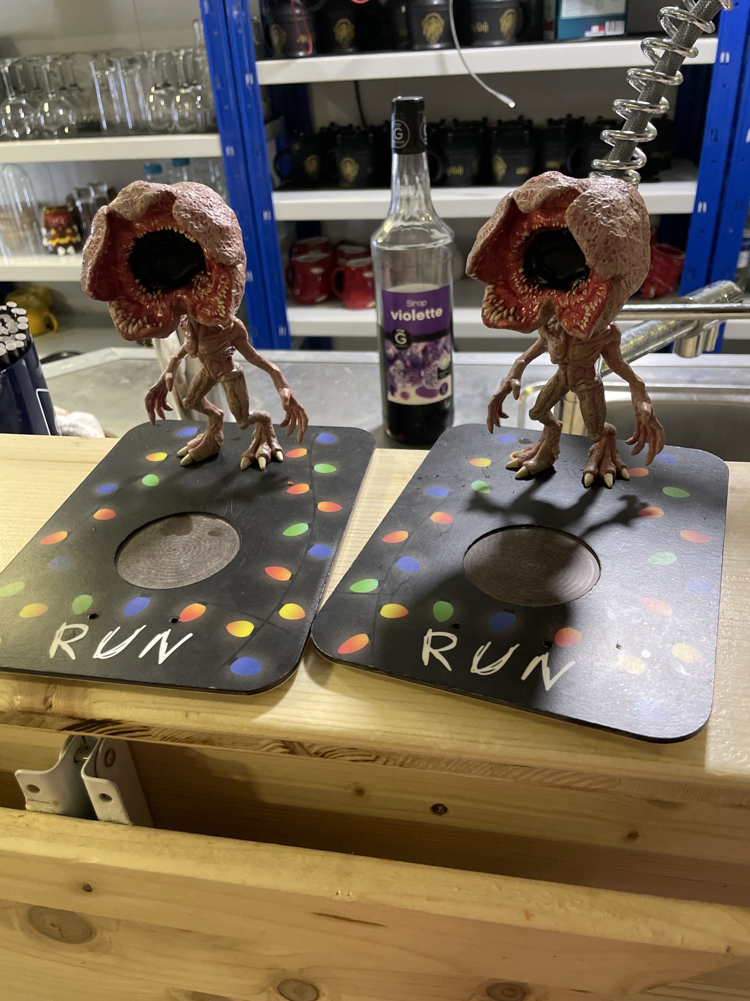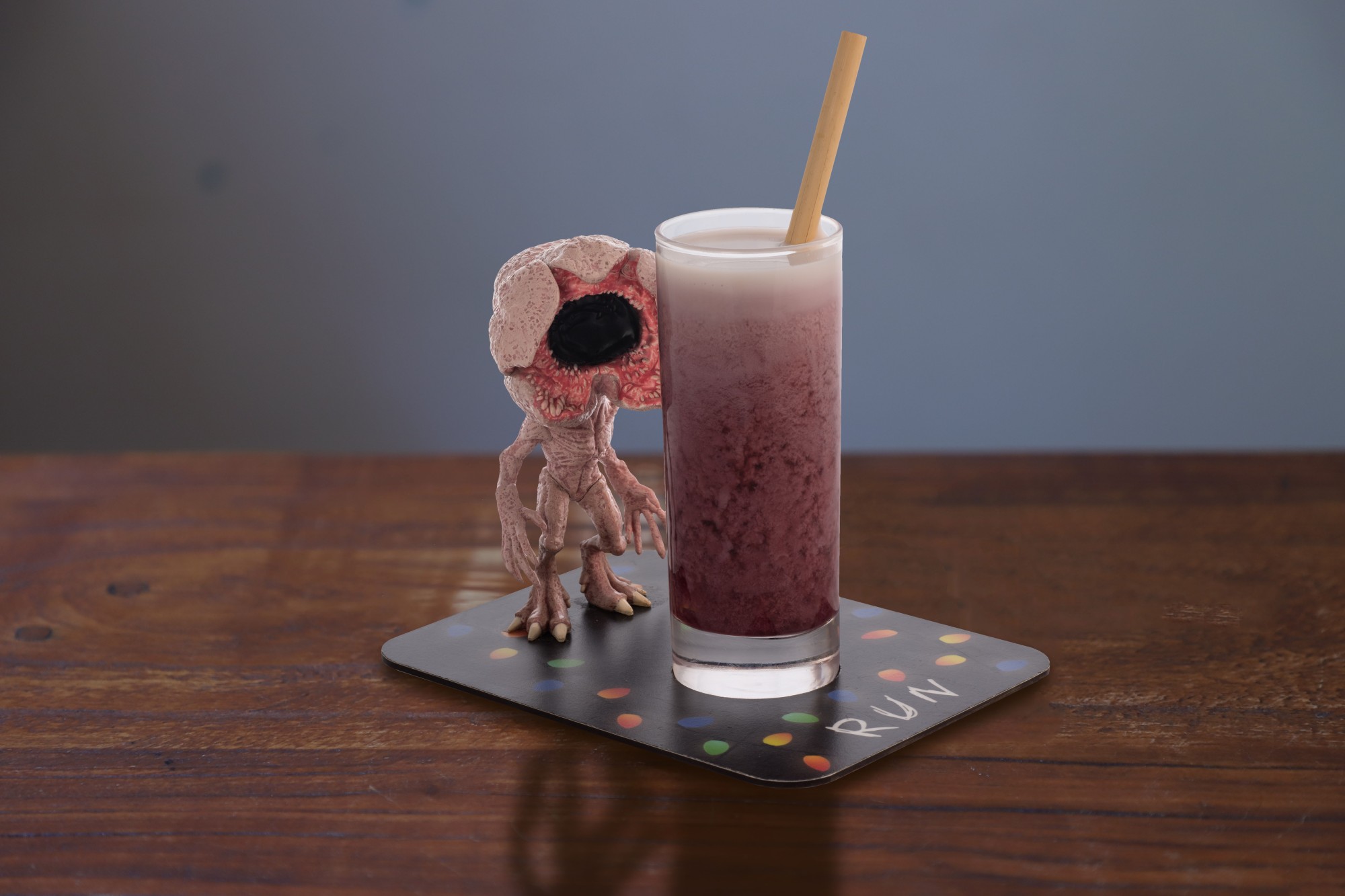 Sortie au fur et à mesure de l'année pour avoir toujours quelque chose de nouveau a proposer à leurs clients, le premier à voir le jour fut le cocktail "Stranger Things". De forme rectangulaire, une figurine de Démogorgon (le méchant pas beau de la série) est fixée sur l'un des bords, prêt à bondir pour vous piquer votre verre ! A l'opposé, les lettres RUN avec une guirlande lumineuse. Les adeptes sauront pourquoi.