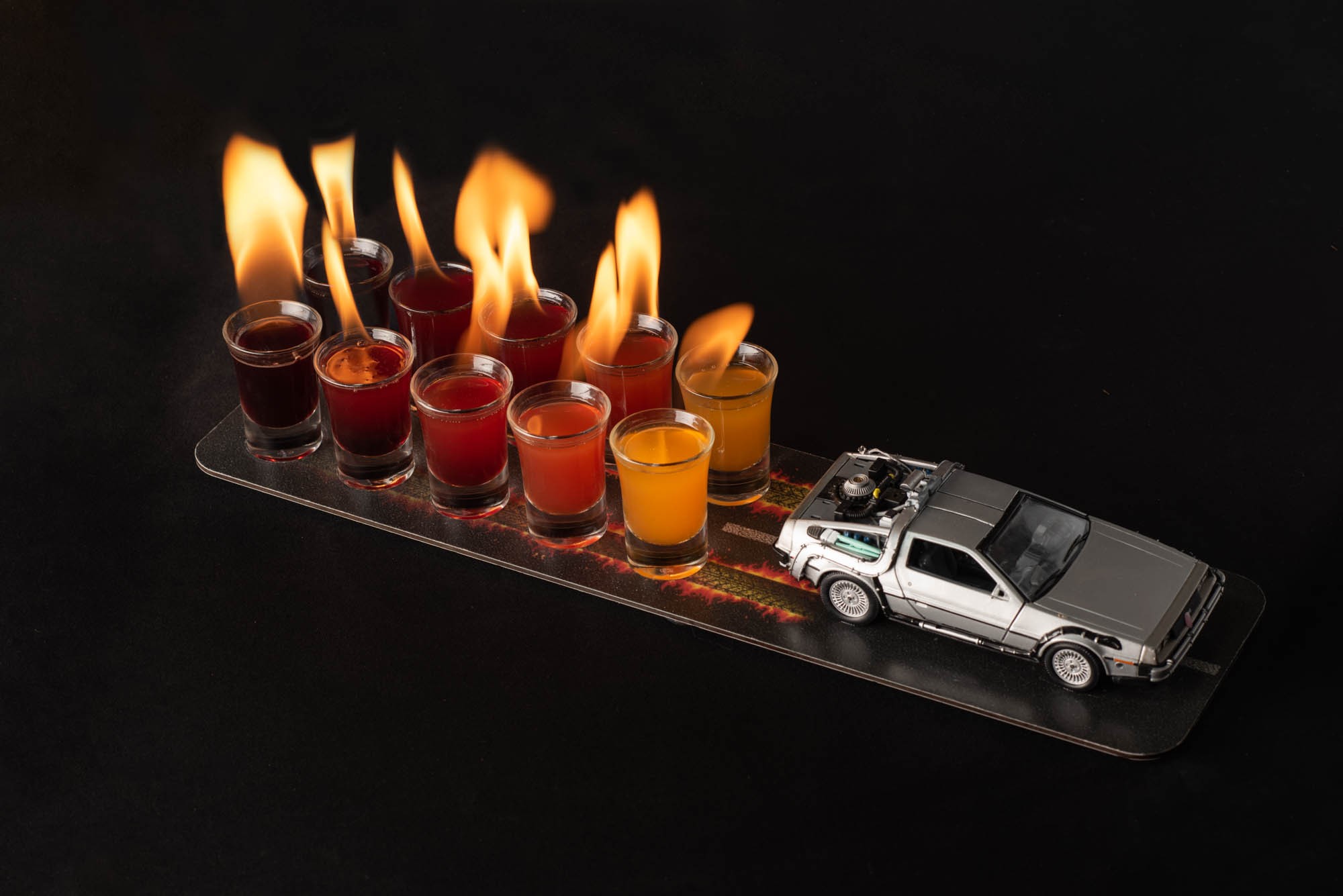 Sur son plateau long rectangulaire, les 10 shots s'alignent sur les flammes derrière la voiture mythique. Le petit plus ? Les shots sont flambés !