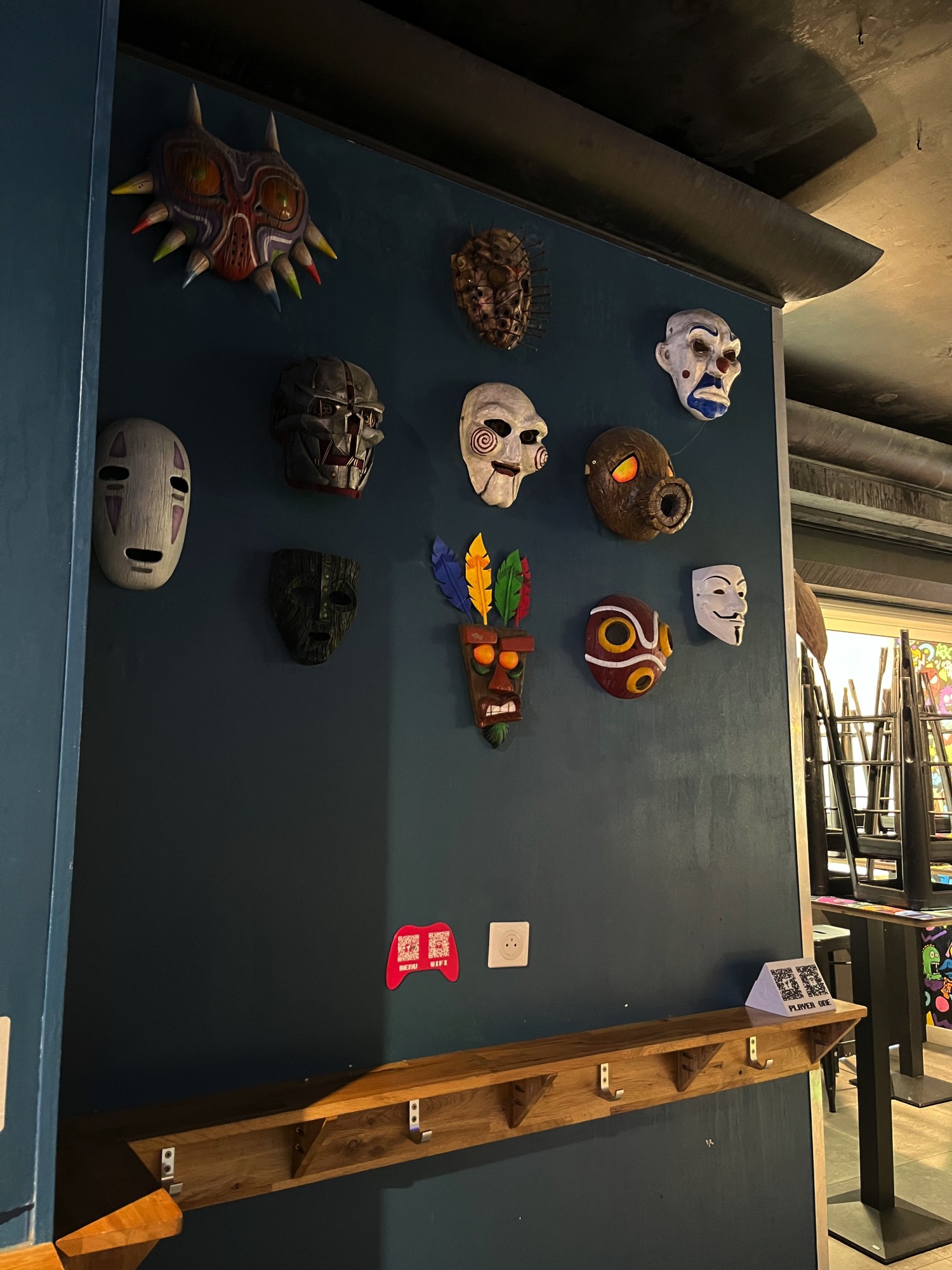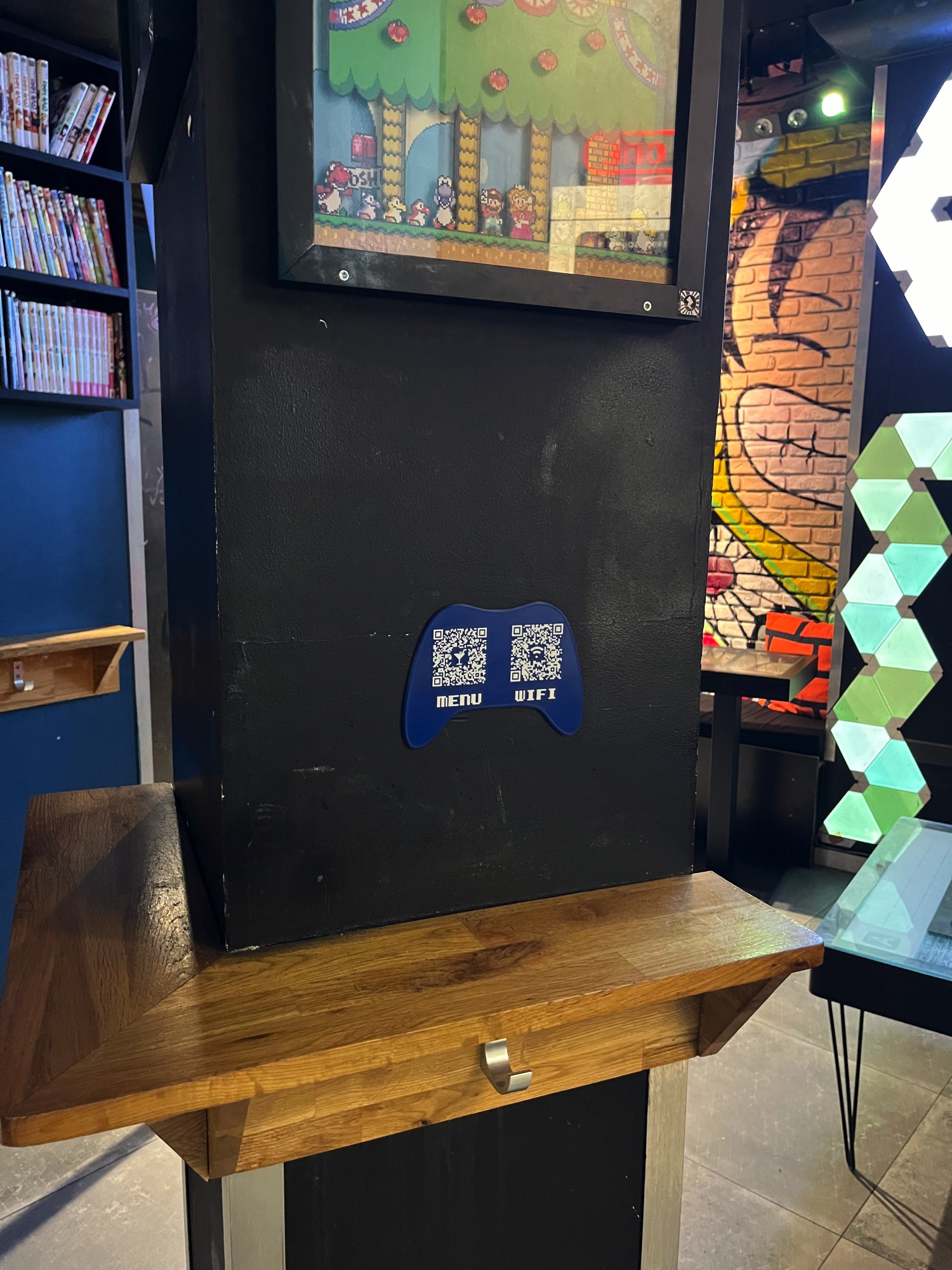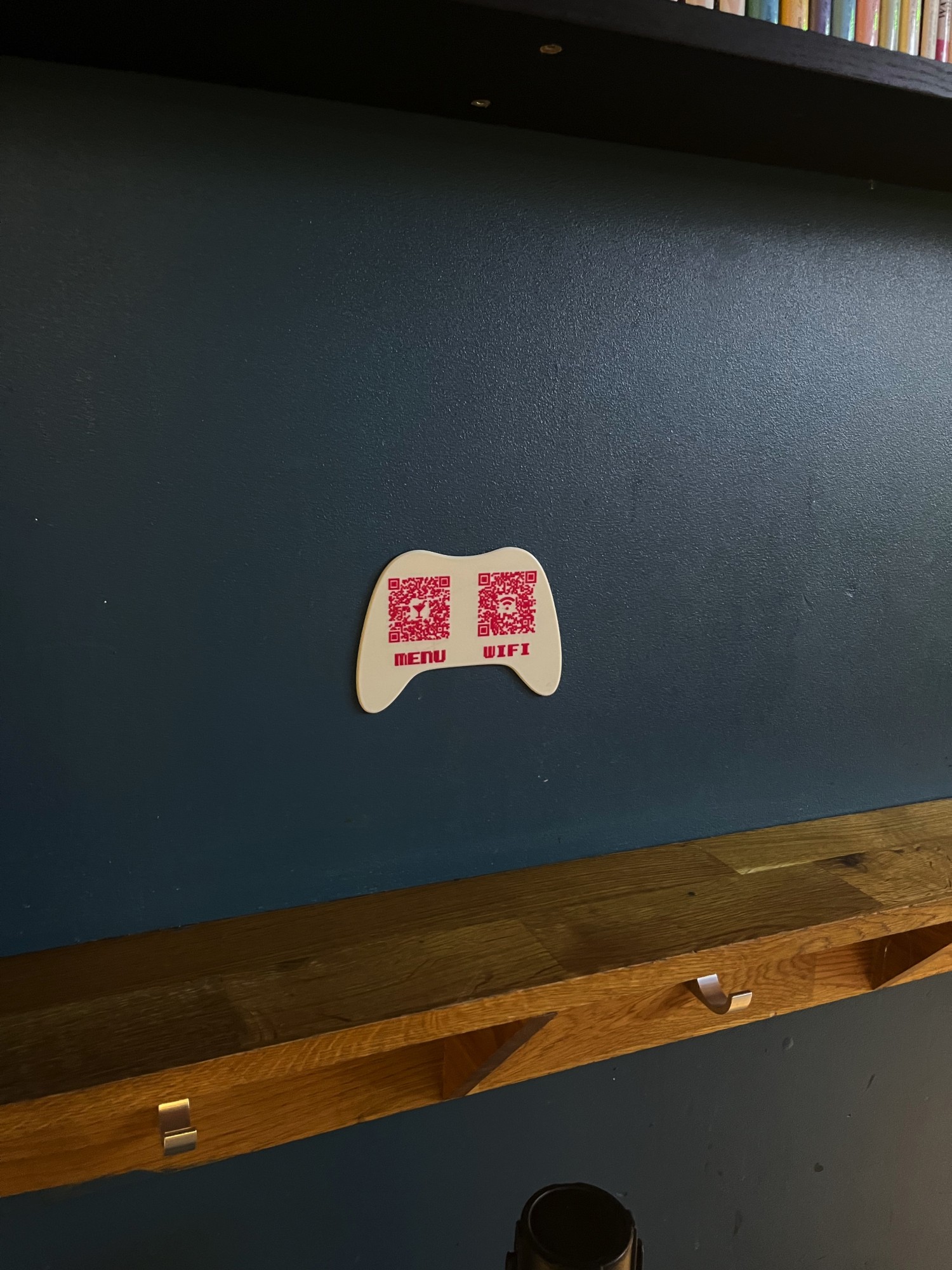 Le premier de ces lieux c'est le rez-de-chaussée du bar Player One où l'ambiance des années 90 règne, avec son décor de Tetris et Donkey Kong, ses consoles de jeux-video rétro et ses bornes arcades. Il était donc tout à fait opportun de fabriquer des QR code en forme de manette de jeux-video.
