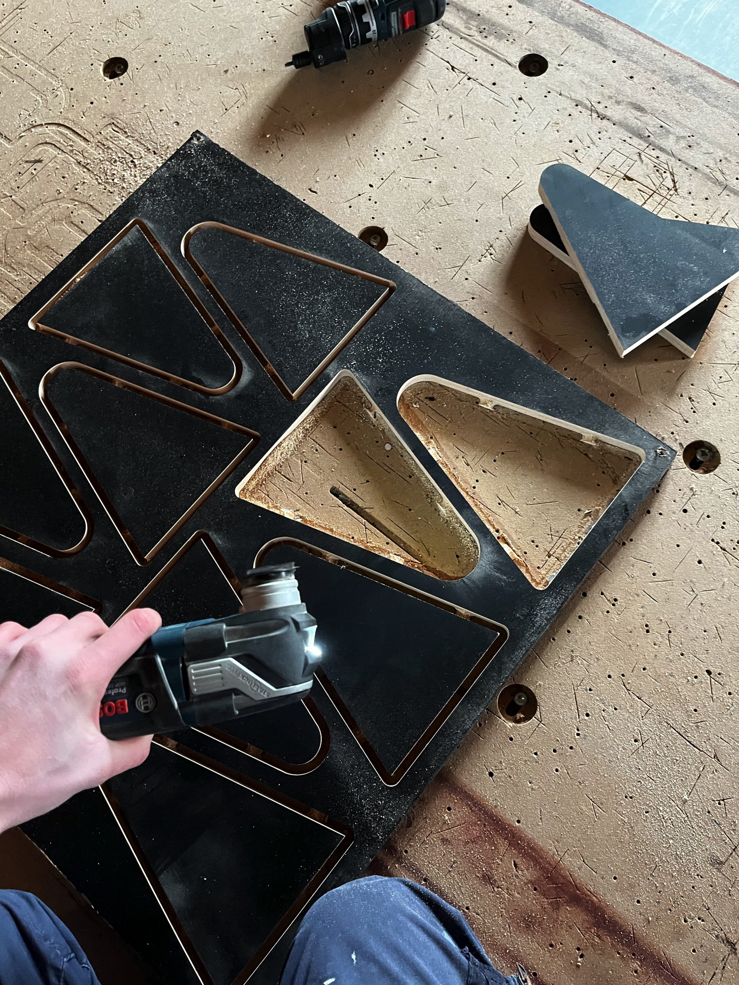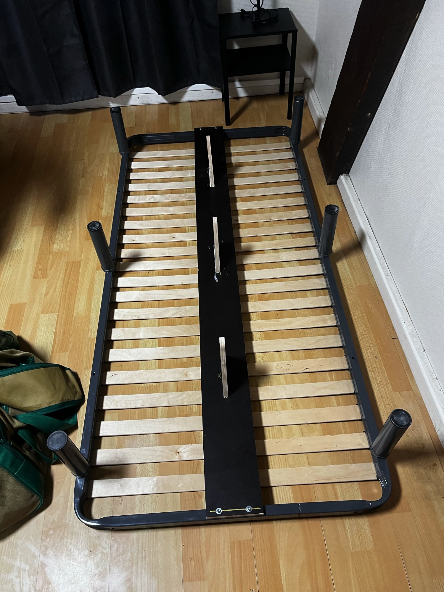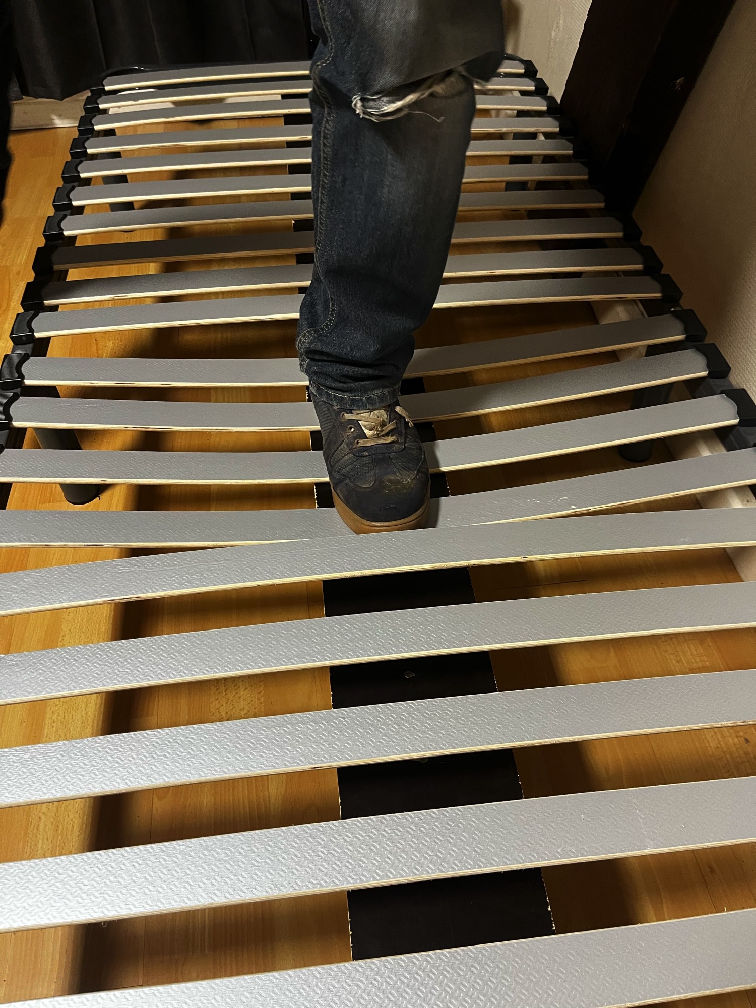 Et notre première proposition était de remplacer complètement les lattes pare une planche de contreplaqué de 18mm directement. Avant de pouvoir casser une telle épaisseur en sautant dessus, il va se passer un bon bout de temps. Ce sont sûrement même les pieds qui céderont avant.