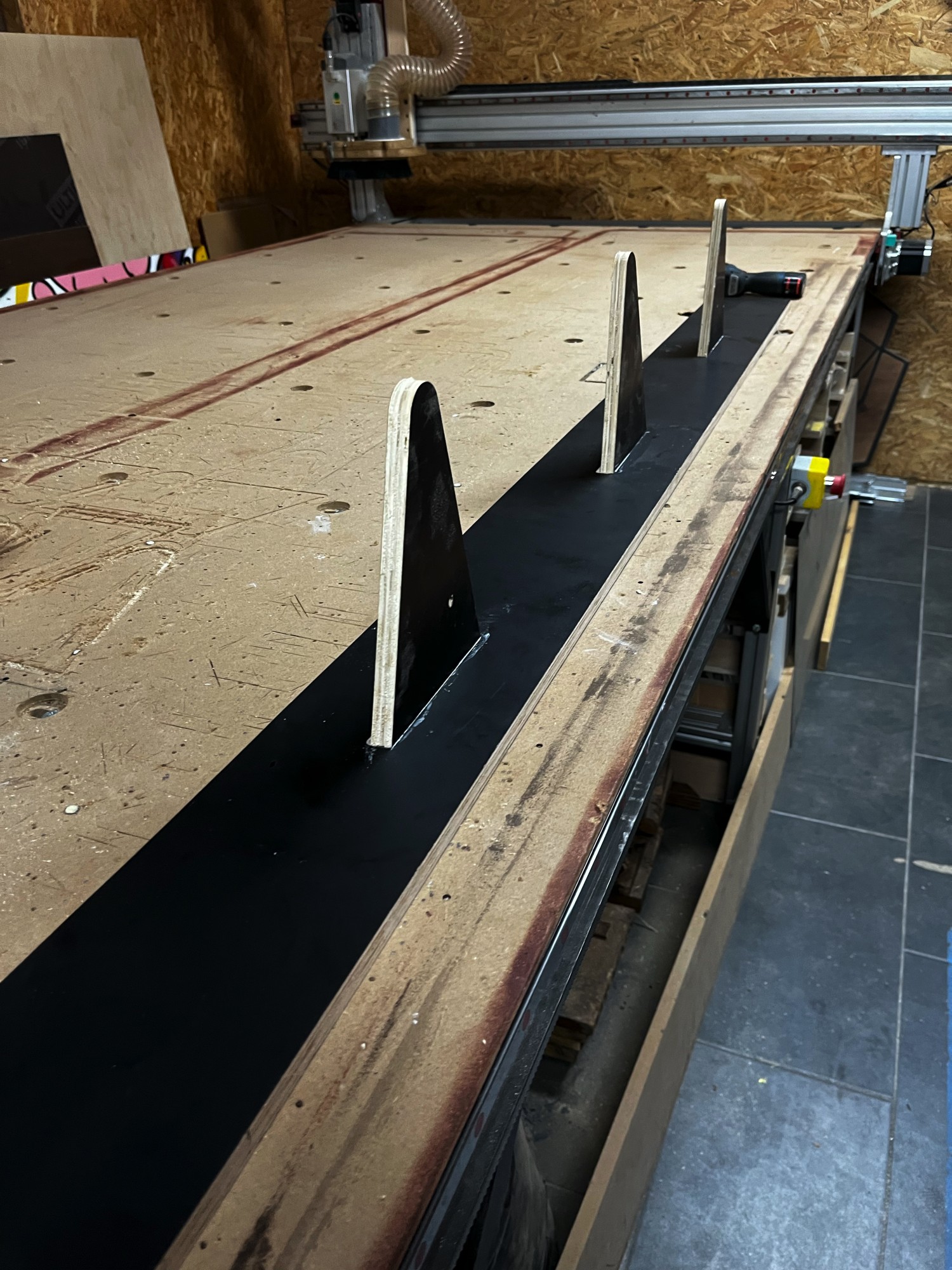La solution retenue est celle que vous voyez en photo. Utiliser notre CNC (fraiseuse a commande numérique) pour découper un renfort central. De cette manière, nous limitons la quantité de bois au maximum, les lattes gardent leurs souplesses, mais sont stoppées si elles plient un peu trop. Avant de casser ou de se déboîter de son encoche en plastique.