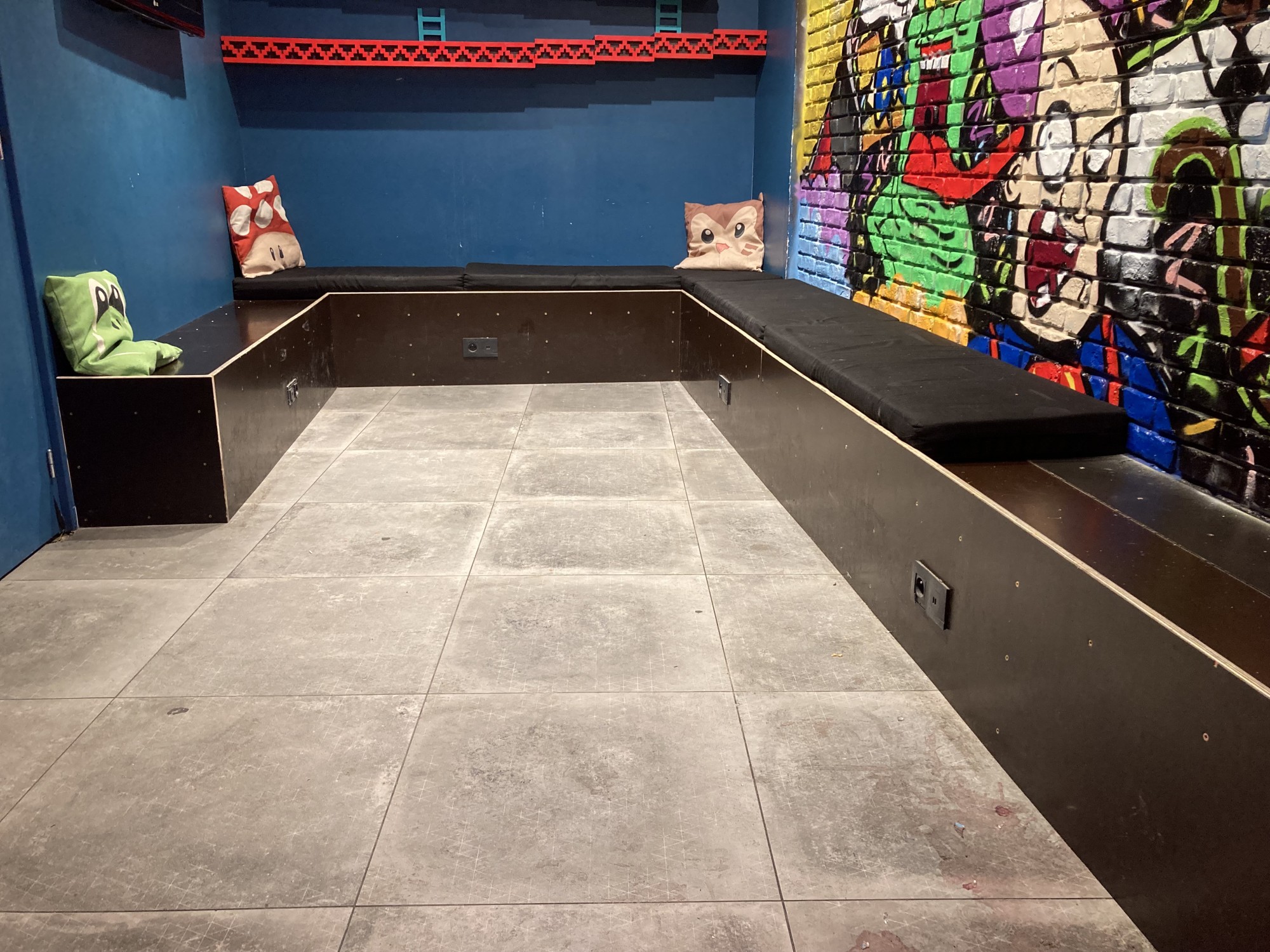 Parfois, les choses les plus simples sont les plus utiles. Le bar Player One Paris nous a commissionné pour remplacer son petit coin cosy par de grandes banquettes juste sous notre Donkey Kong géant.