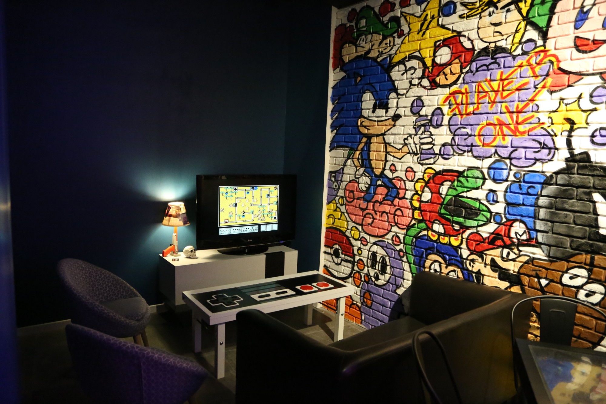 Cela a permis au bar de monter sa capacité d'accueil de 5 personnes à plus de 15 ! Ne vous inquiétez pas, notre NES géante est toujours là ! Nous l'avons retiré pour la photo. (ouf !)