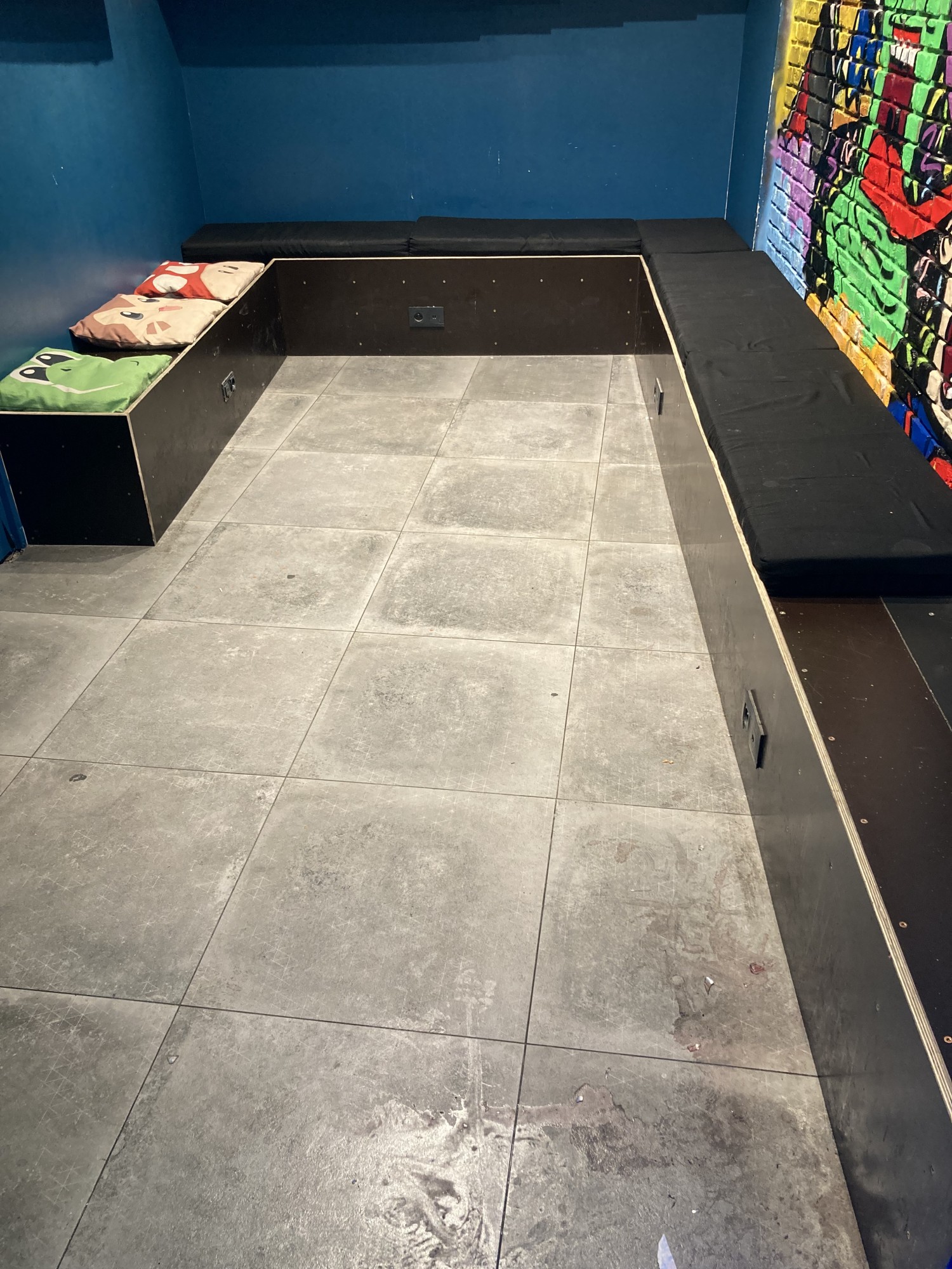 Nous avons donc conçu une banquette en forme de U entièrement sur mesure pour épouser la forme des murs qui, forcément, ne sont pas d'équerre. La structure est en sapin recouvert de contreplaquer noir. Vous le savez sûrement déjà, chez GLOUPY, nous savons travailler l'électronique, mais aussi l'électricité ! Nous nous sommes raccordés au réseau électrique du bar pour ajouter des prises électriques ainsi qu'USB sur toute la longueur de la banquette.