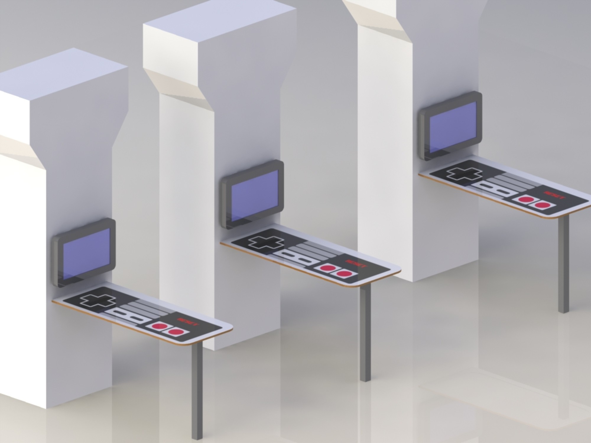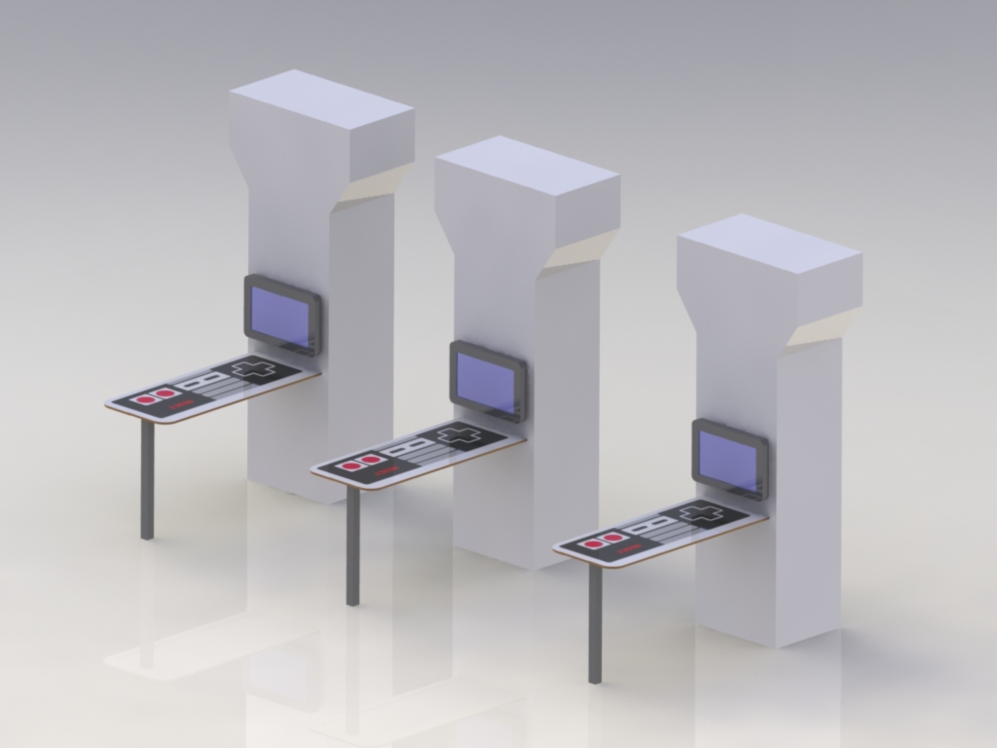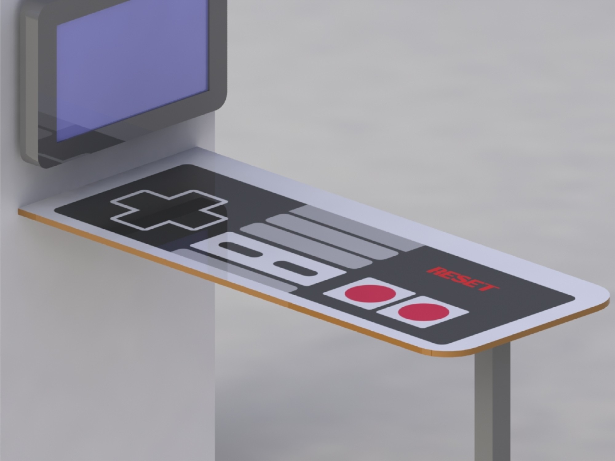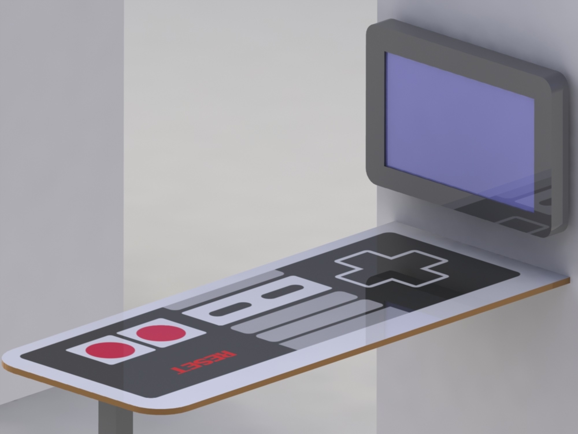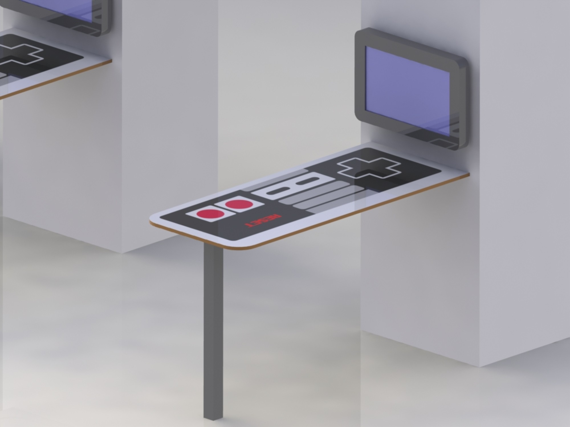 À l'origine ses tables ont été imaginé pour remplacer les simples tables en bois d'un célèbre bar geek Parisien. Et quoi de plus geek que la manette la plus célèbre du monde, la NES. Une croix et deux ovales noirs avec deux ronds rouges et bim, vous savez immédiatement que quoi il s'agit.