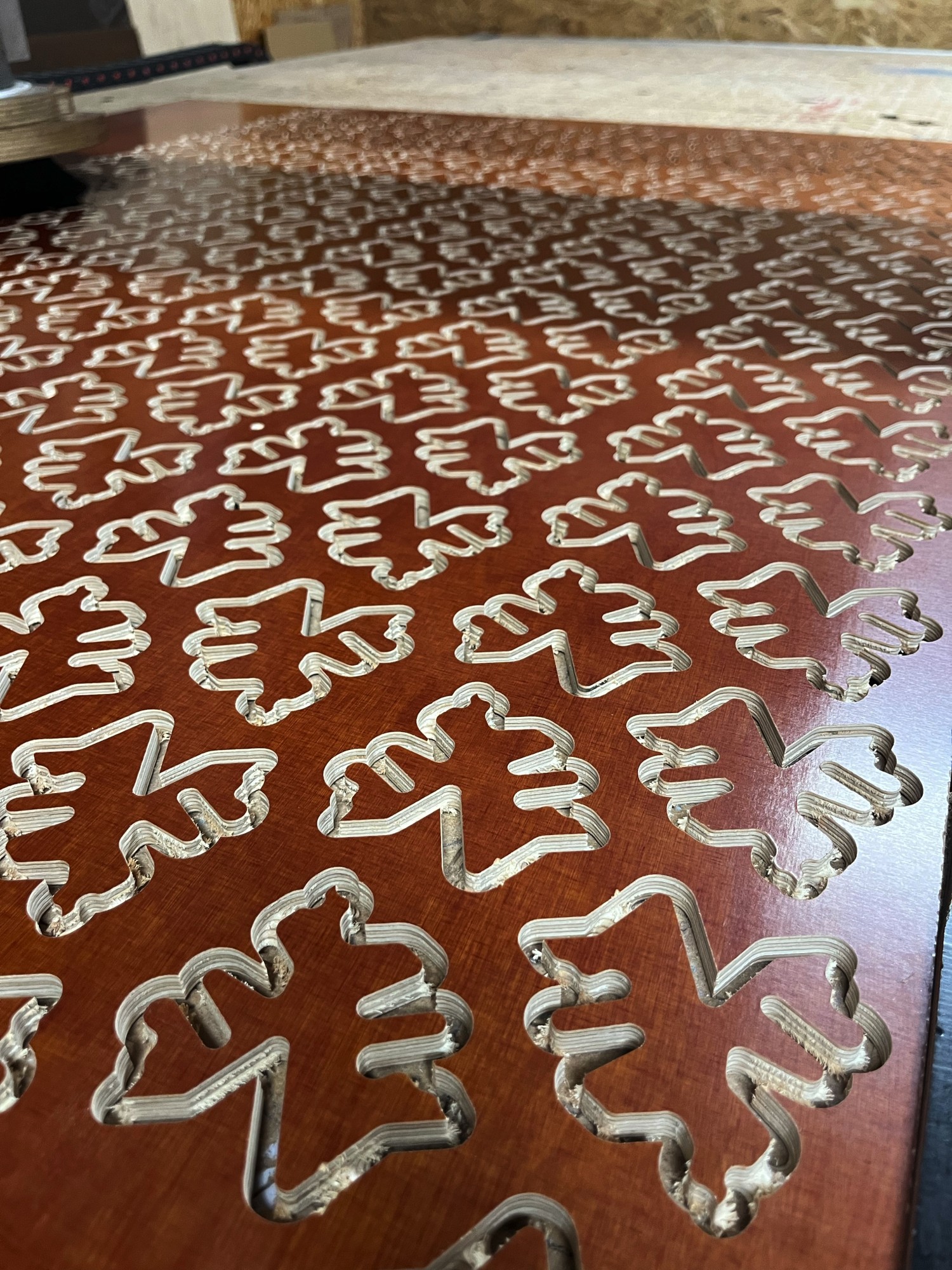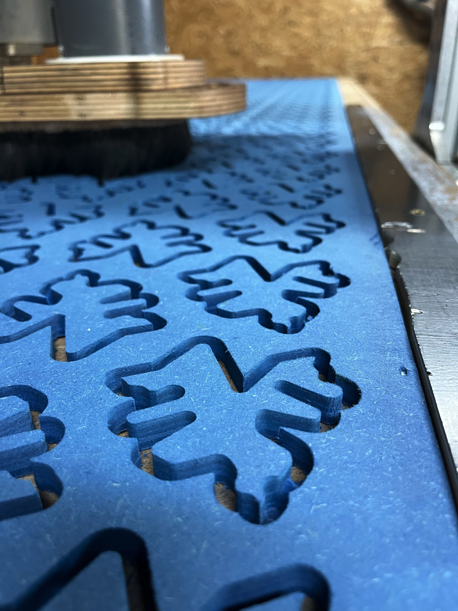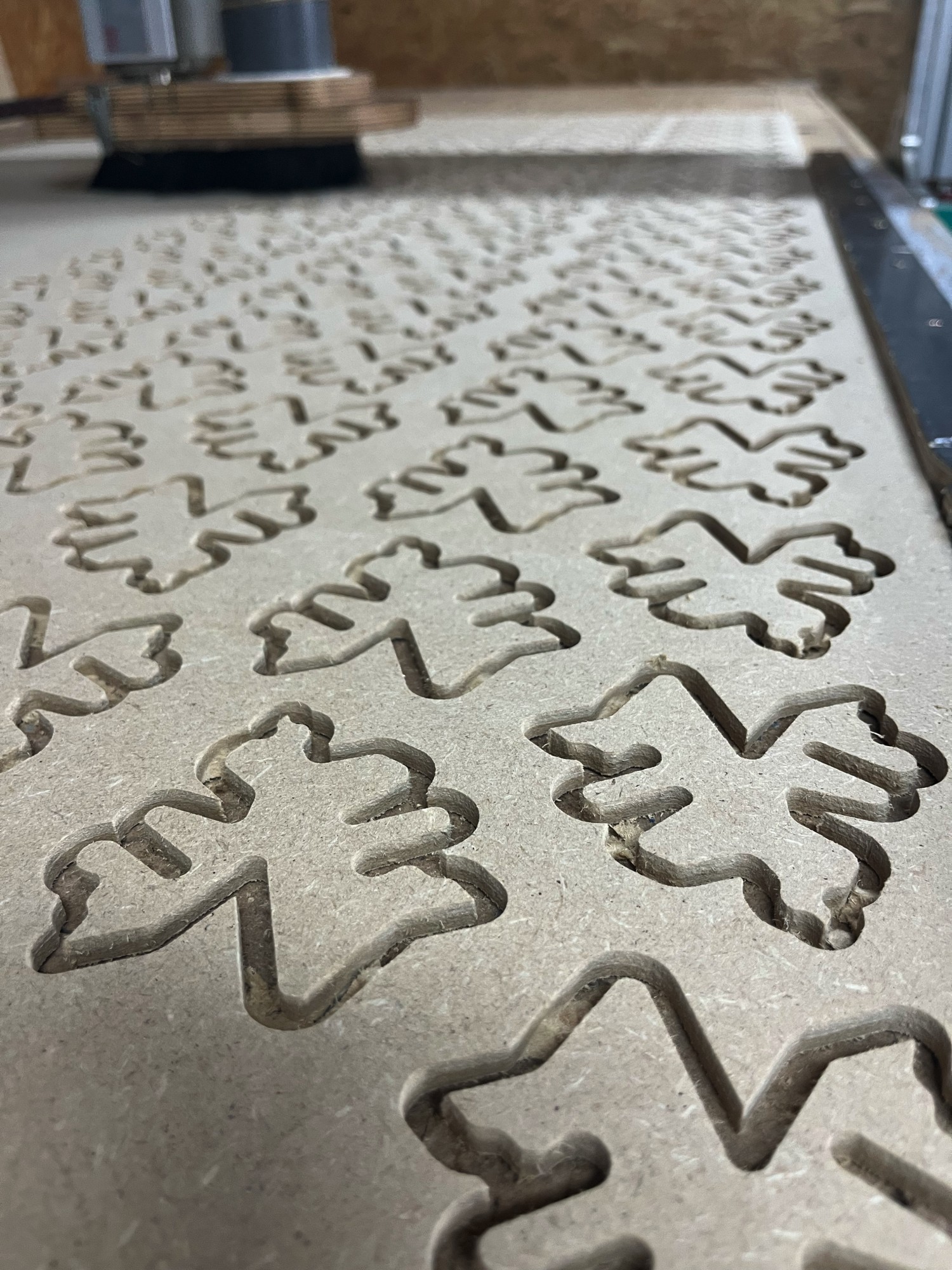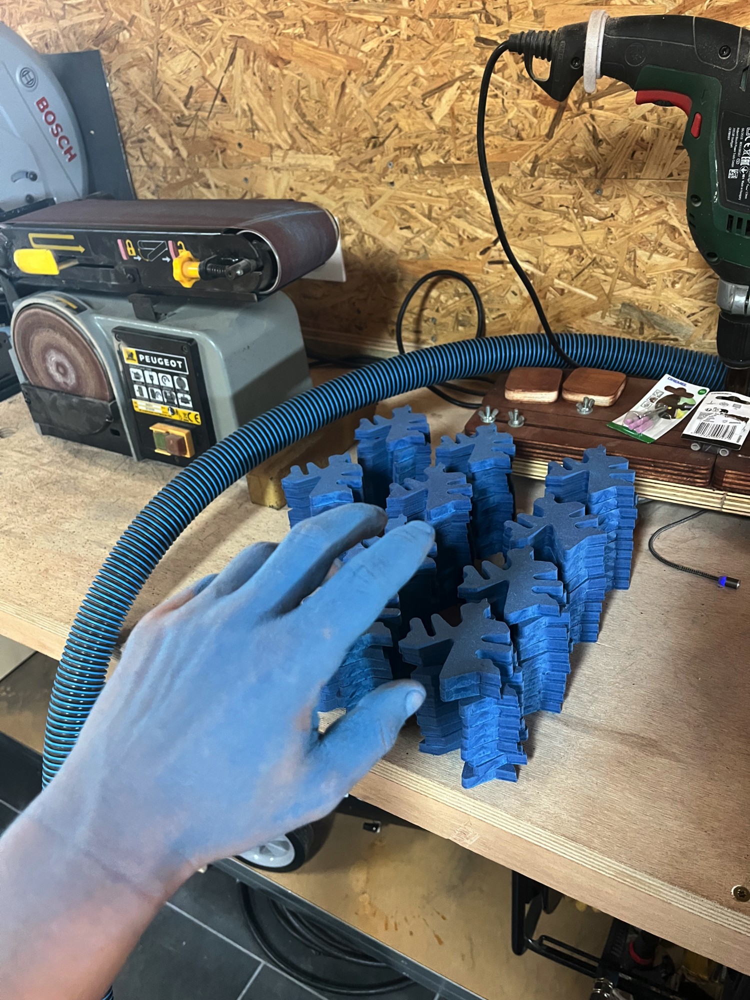 Au total, ce sont pas moins de 1200 pièces identiques, soit 240 pièces par matériau, découpées avec notre CNC (fraiseuse à commande numérique) dans notre atelier près de Rouen. C'est, jusqu'à présent, le projet avec le plus de pièces que nous aillons pu fabriquer.