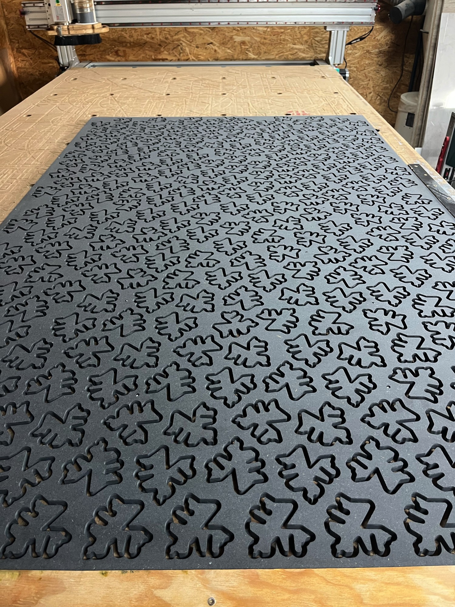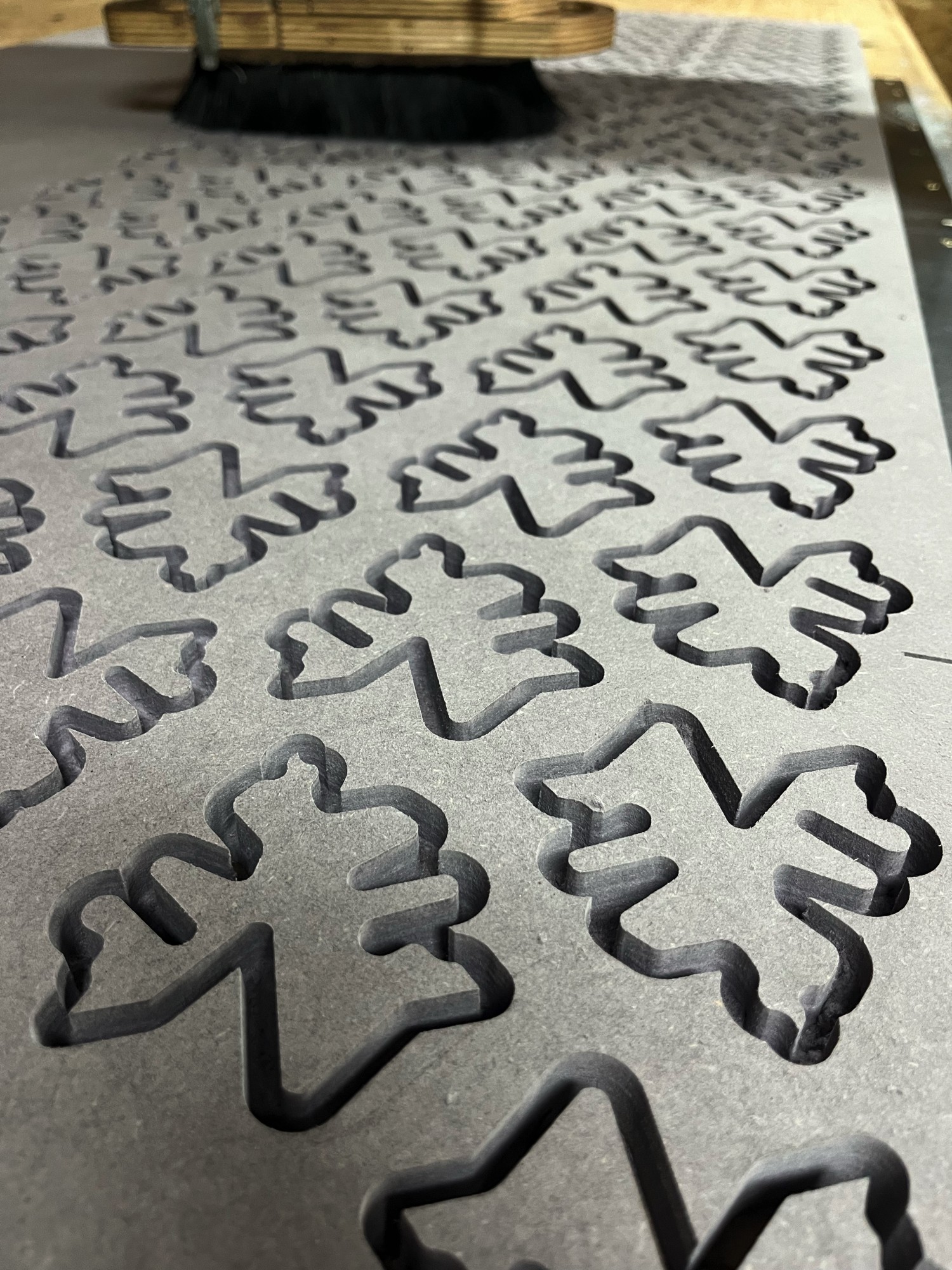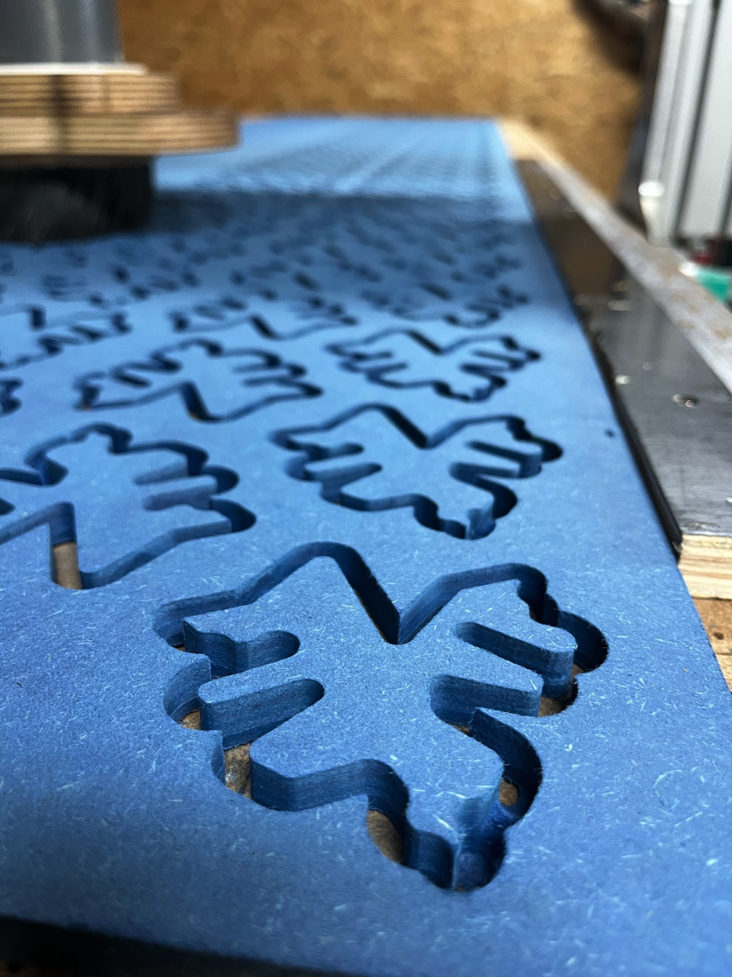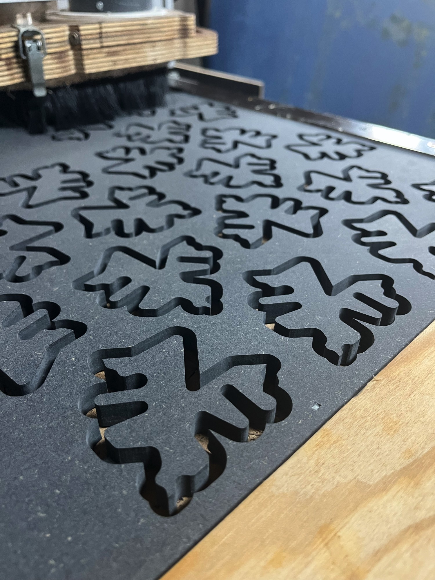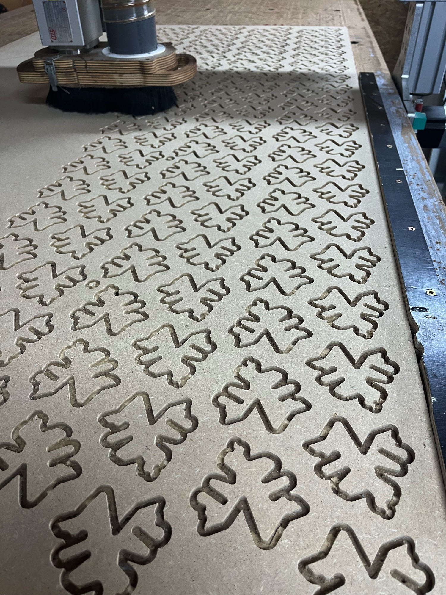 Au total, ce sont pas moins de 1200 pièces identiques, soit 240 pièces par matériau, découpées avec notre CNC (fraiseuse à commande numérique) dans notre atelier près de Rouen. C'est, jusqu'à présent, le projet avec le plus de pièces que nous aillons pu fabriquer.
