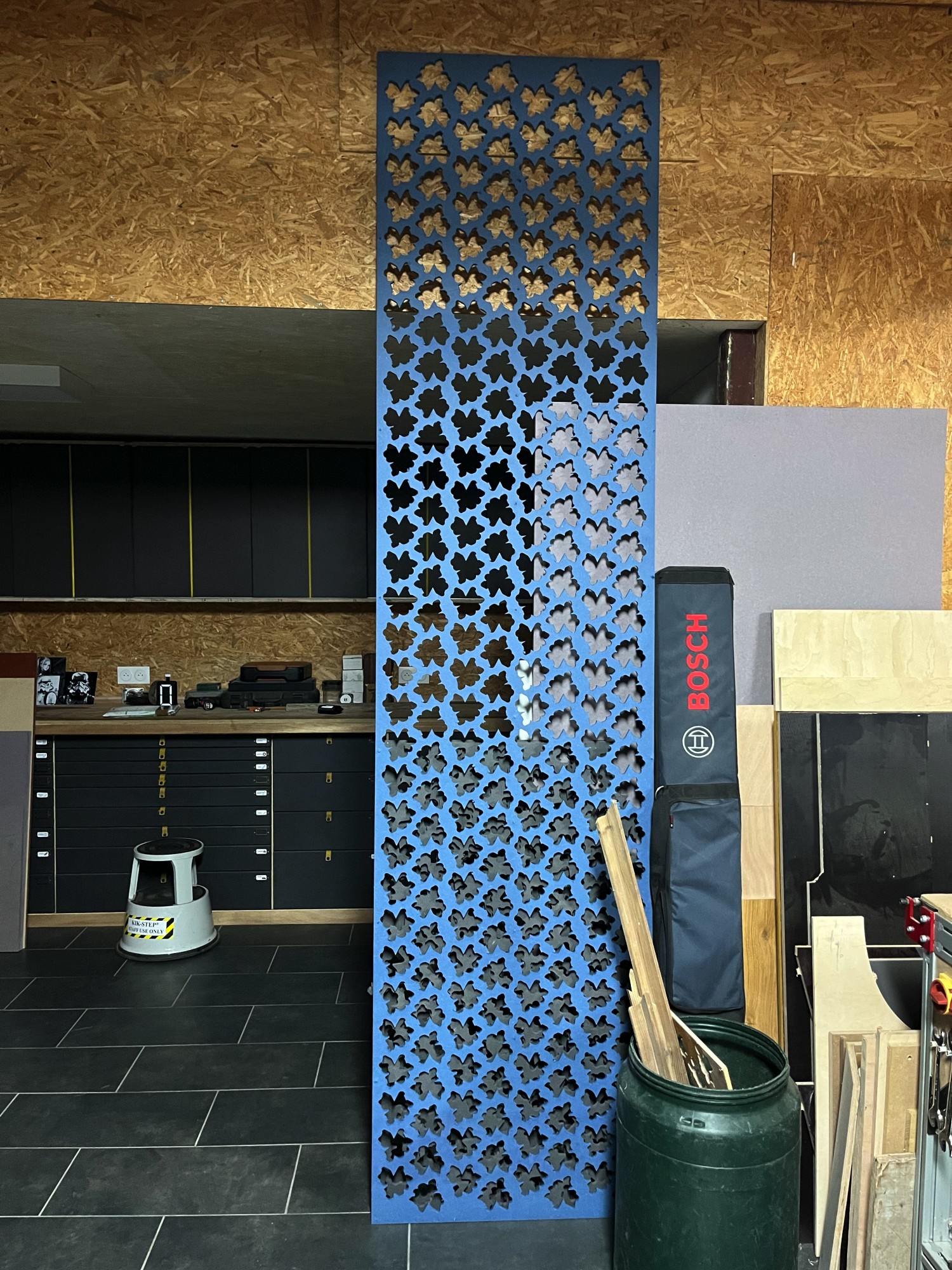 C'est exactement ce que nous avons fait ici avec des pièces en : MDF teinté bleu, anthracite et noir, contreplaqué de bouleau filmé et MDF classique.
